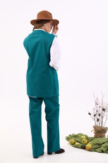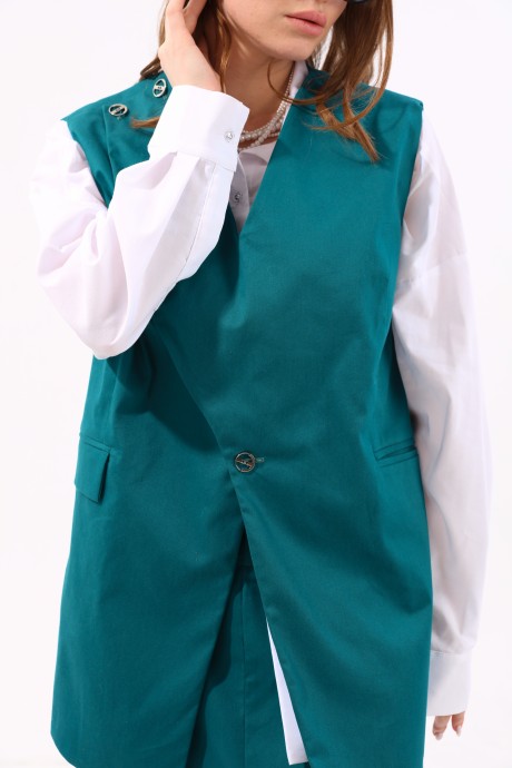 Жилет прямого силуэта оверсайз. По переду таллиевая вытачка переходящая в прорезной карман с клапаном и двумя обтачками. Спинка цельнокроеная. Перед фигурный симметричный с застежкой на правом плече на петли и пуговицы. Для дополнительной фиксации по центру застежка на одну петлю и пуговицу.