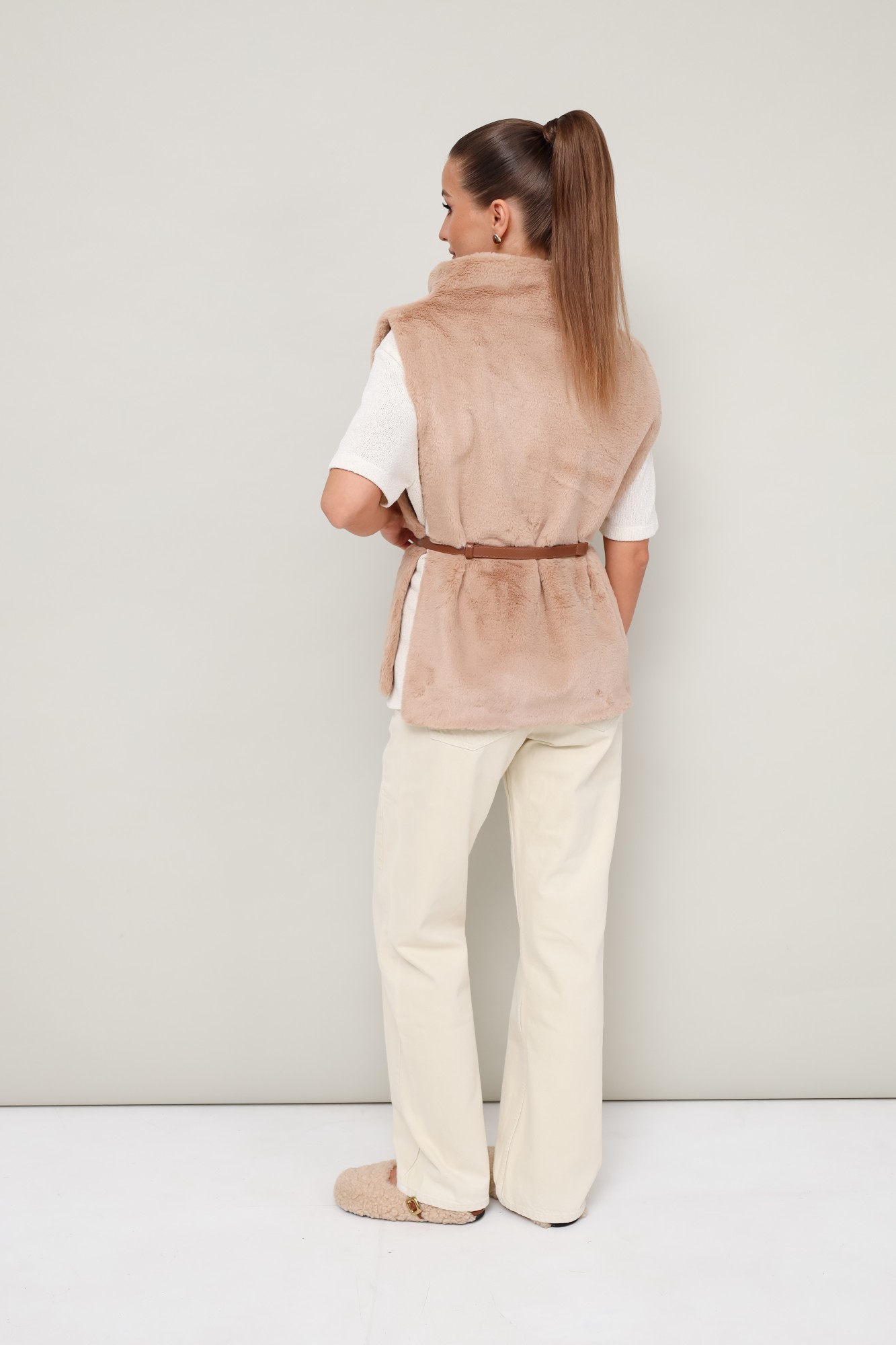 Стильный жилет прямого силуэта, выполнен из искусственного меха на подкладке. Цельнокроеный воротник-стойка. Идеальный выбор для холодных дней, который сочетает в себе комфорт, тепло и актуальный дизайн. Ремень представлен как вариант стилизации образа.