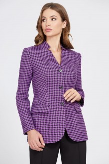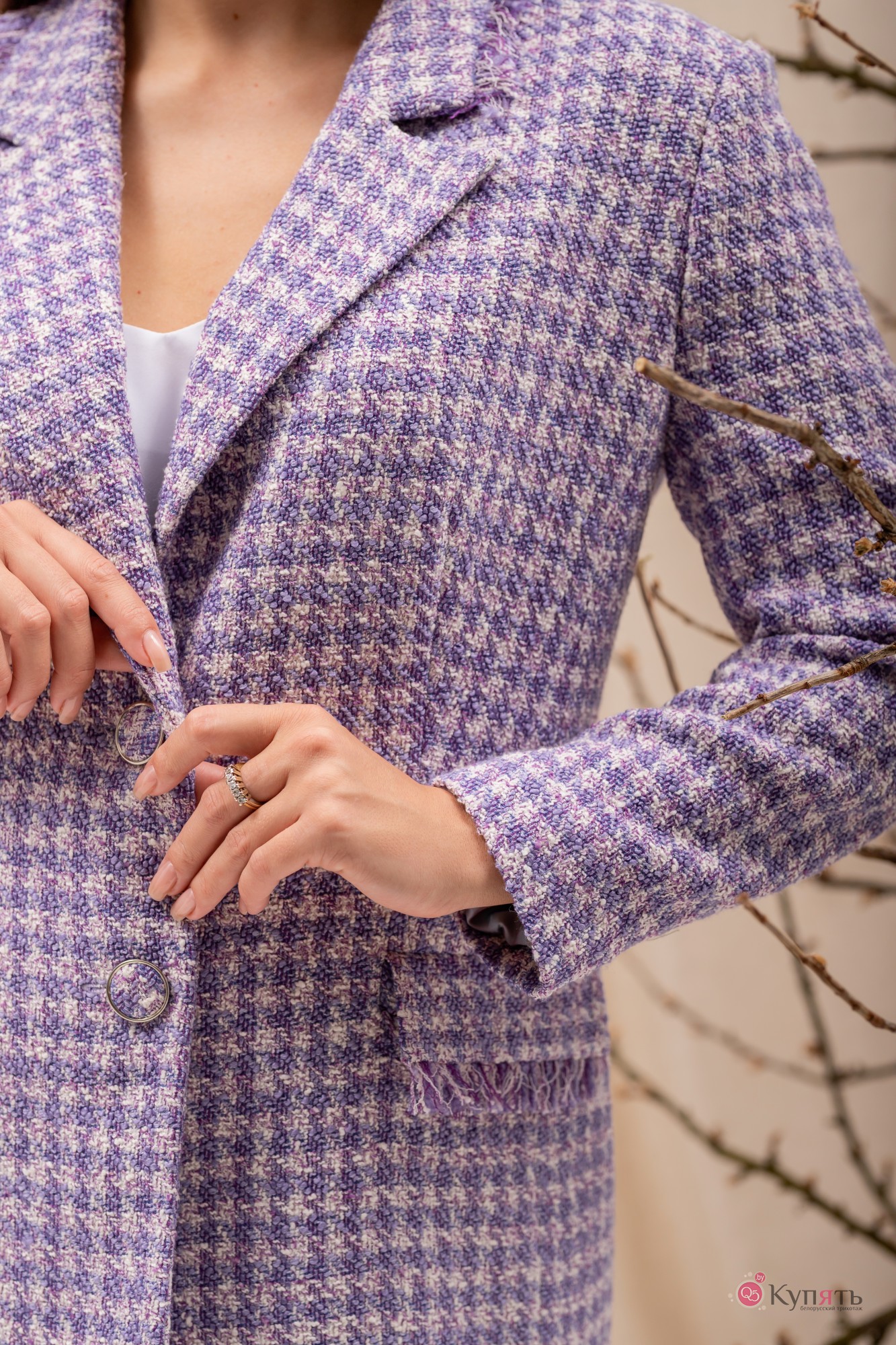 Жакет полуприлегающего силуэта удлинённый, с центральной застёжкой на две прорезные петли и пуговицы, выполнен из костюмной ткани. Перёд жакета с талевыми вытачками и прорезными карманами и клапанами. Лацканы классической формы. Спинка со средним швом и рельефами от проймы до низа изделия. Рукава втачные двух шовные. Жакет на подкладке.
