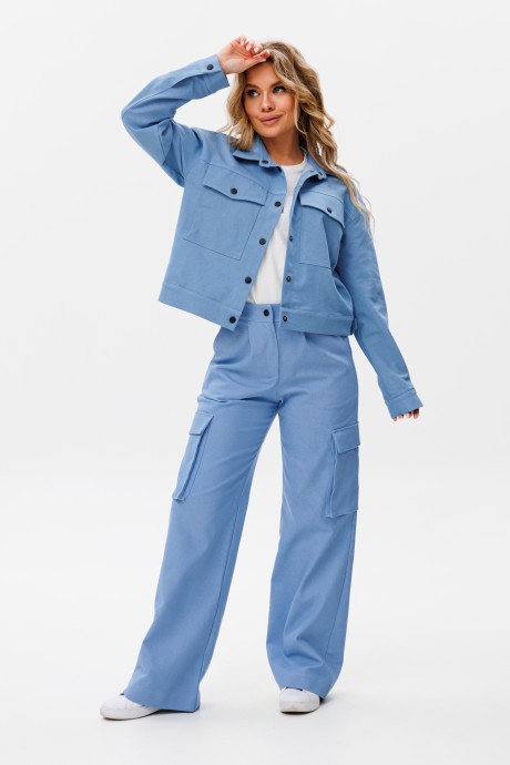 Джинсовый Жакет свободного силуэта с застежкой по переду на кнопки. Воротник отложной. По переду отрезные кокетки, накладные карманы с клапанами. По спинке кокетка и рельефы. Рукав двухшовный с притачной манжетой на кнопках. Низ жакета на притачном поясе