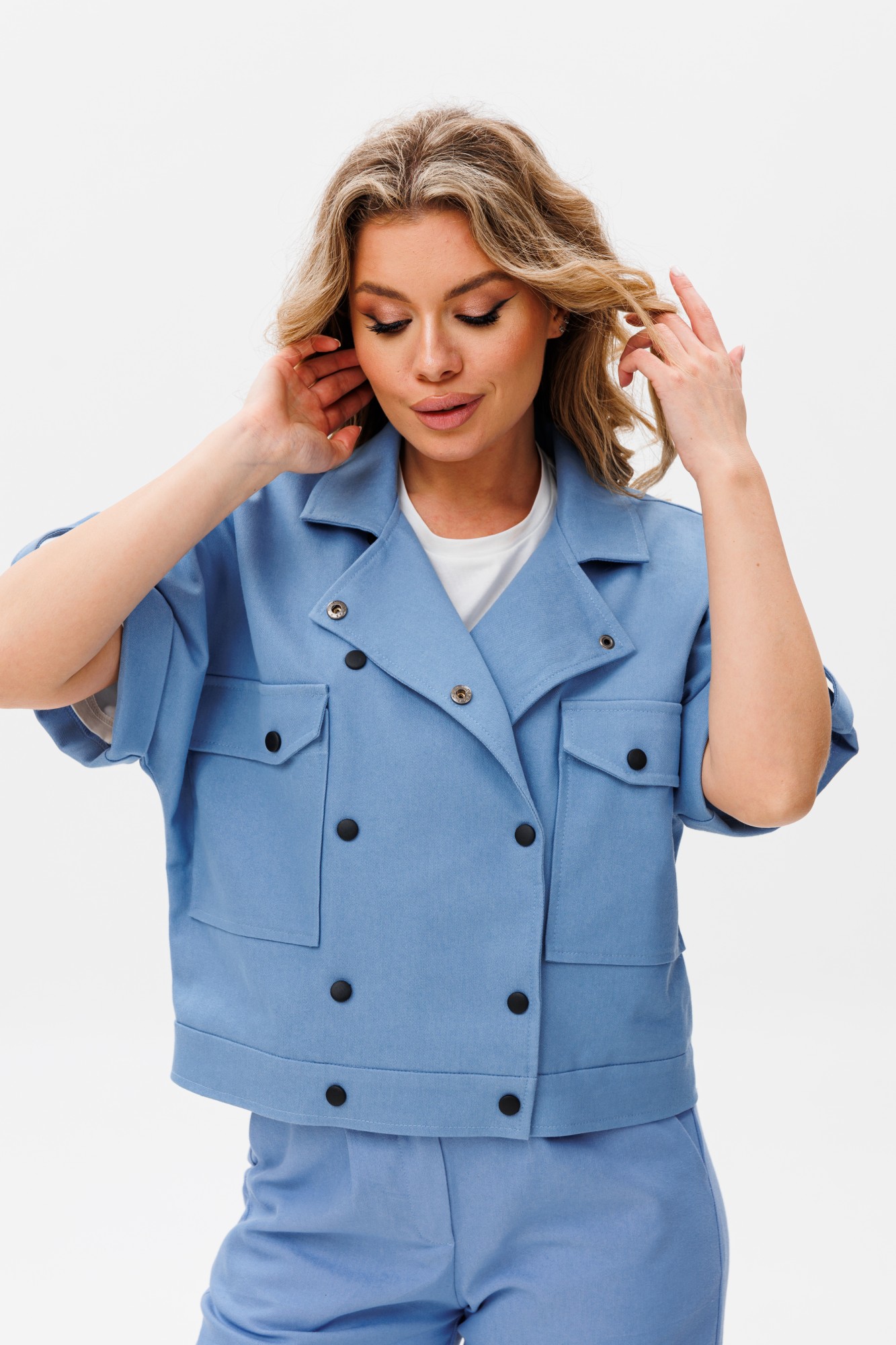 Жакет женский двубортный прямого силуэта с цельнокроеным рукавом. Рукав короткий с отложной манжетой на пате. По переду накладные карманы с клапаном. Спинка со швом.