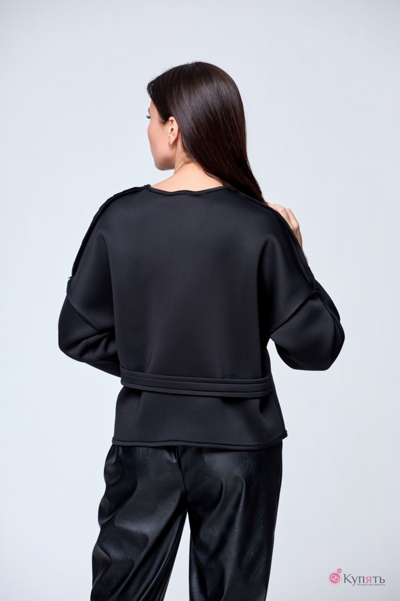Жакет прямого кроя, ассиметричный, короткий. Рукав длинный. Жакет декорирован карманом. Жакет создан для уверенных в себе женщин, дерзких и смело идущих в будущее. Швы наружу и ассиметрия создают футуристичный образ женщины наступающего сезона. А при помощи пояса вы можете корректировать необходимую для вас степень прилегания.