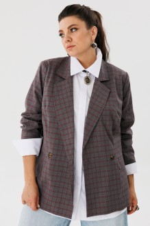 Жакет прямого силуэта, умеренного объёма, длиной до бёдер. Жакет с подкройными бочками по косой, воротник отложной пиджачного типа.