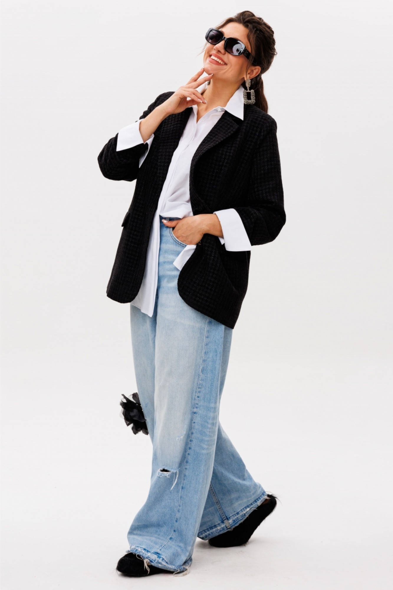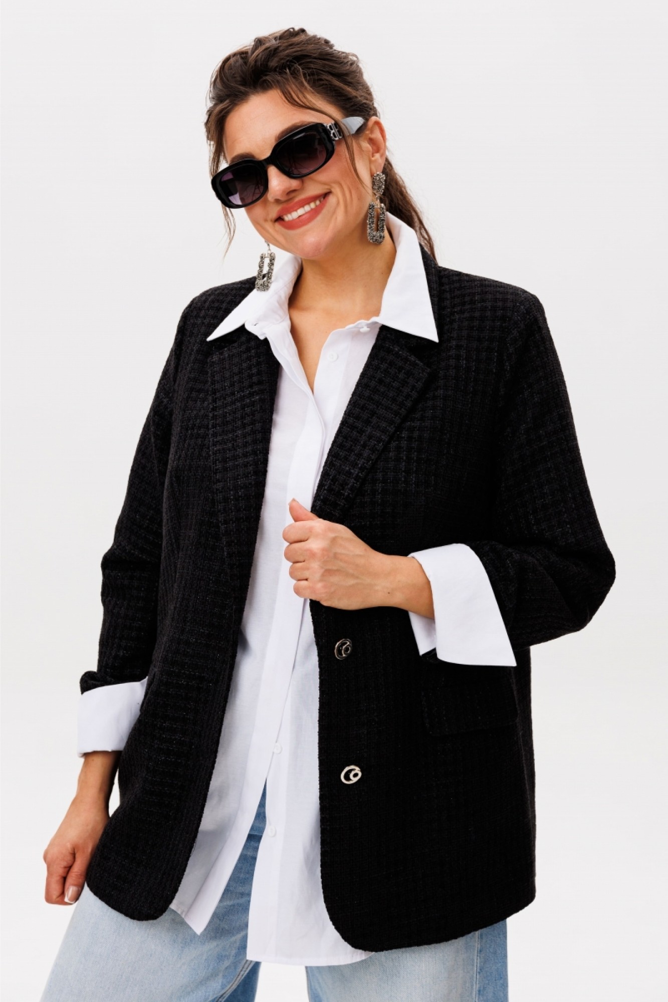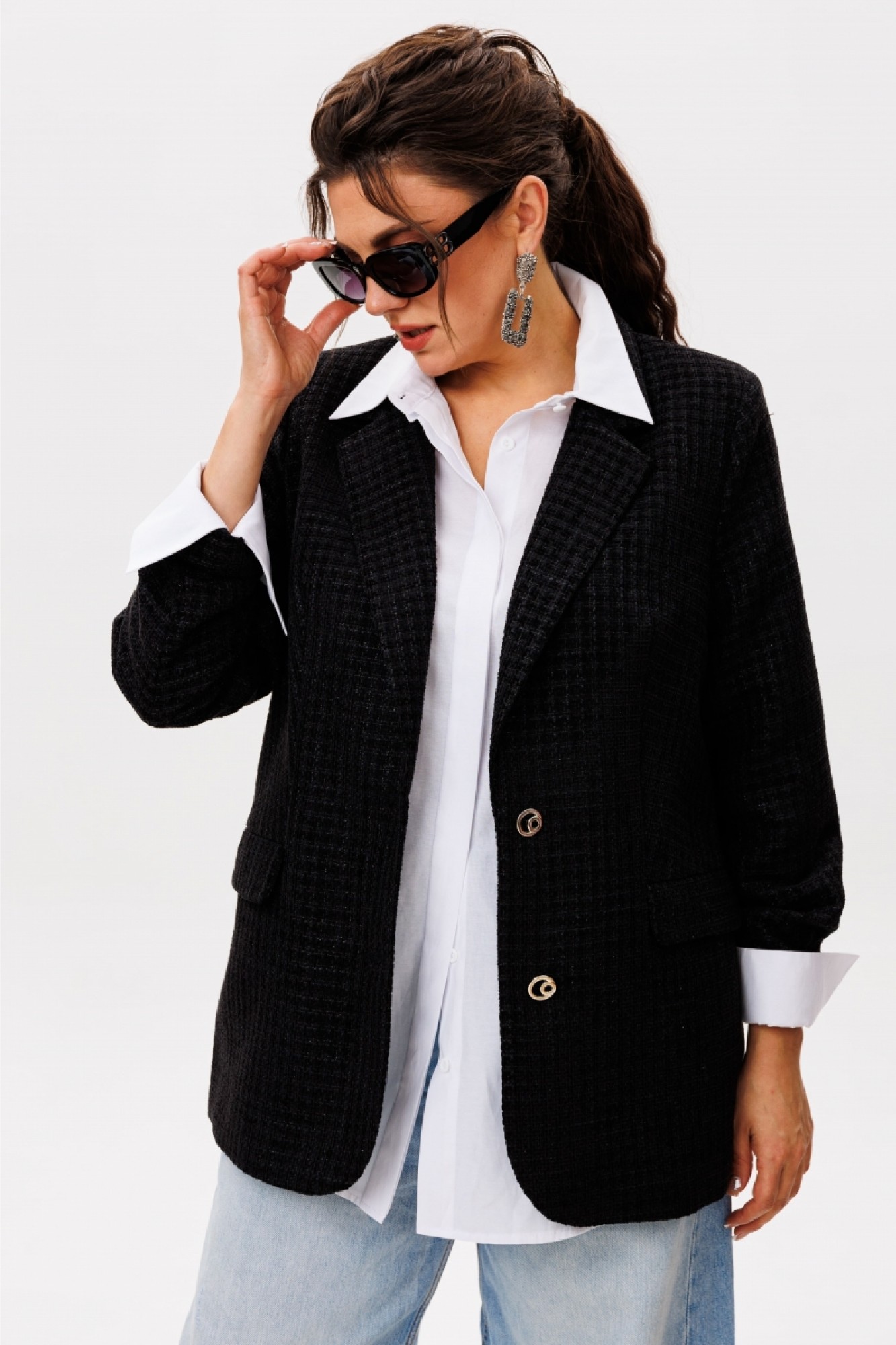 На модели в жакете цвета «черный жемчуг» рубашка 1203.