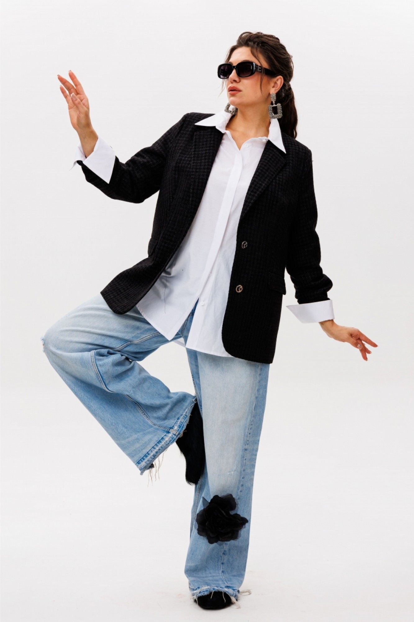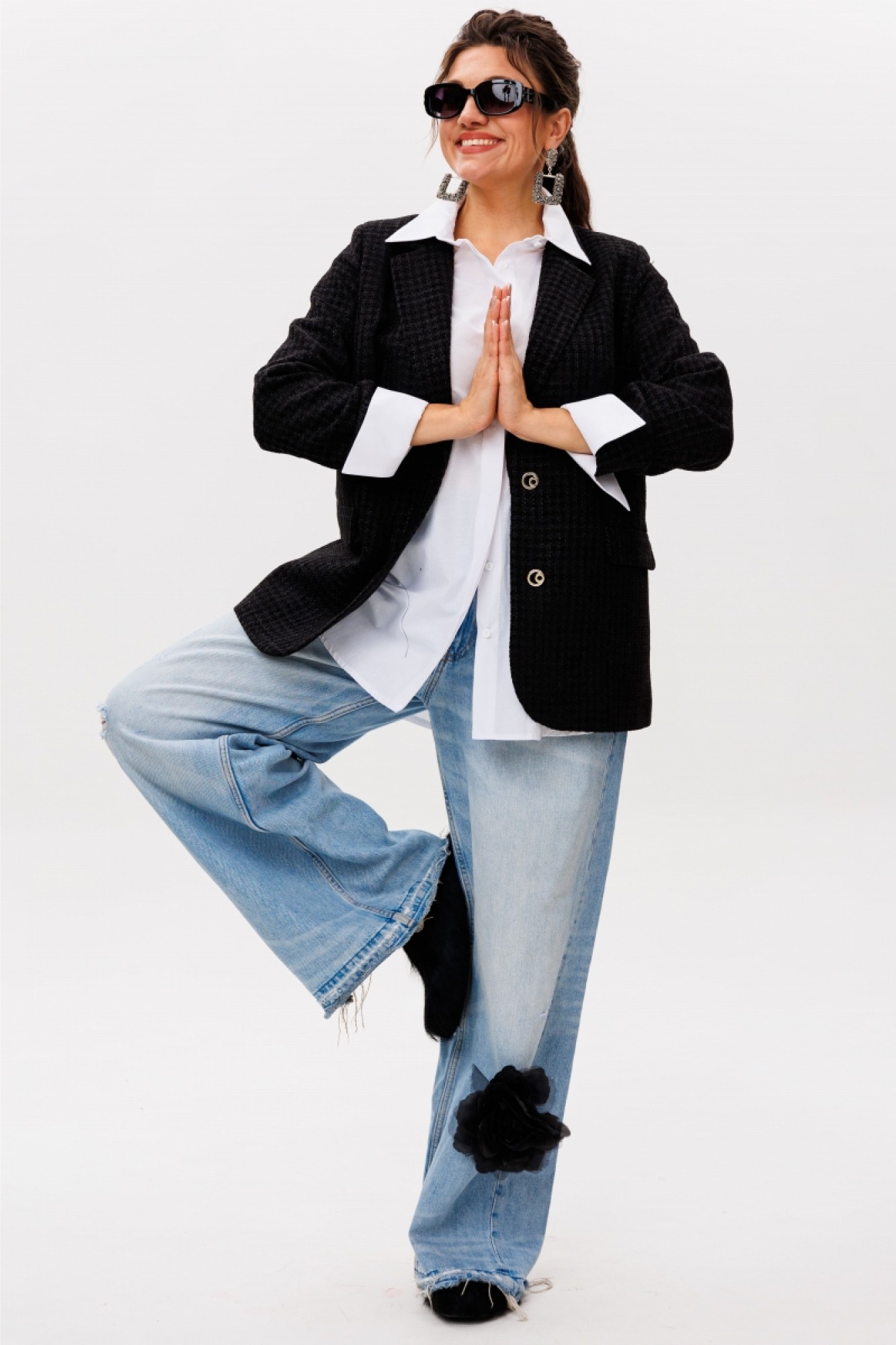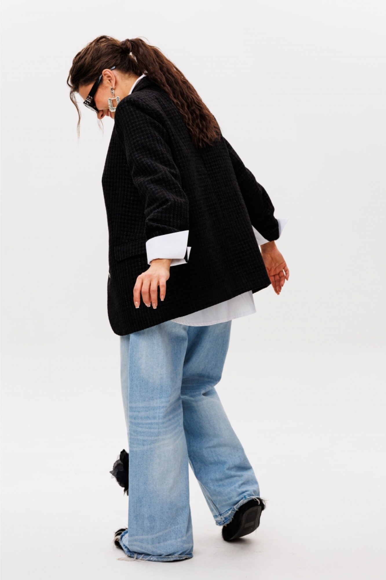 На модели в жакете цвета «черный жемчуг» рубашка 1203.