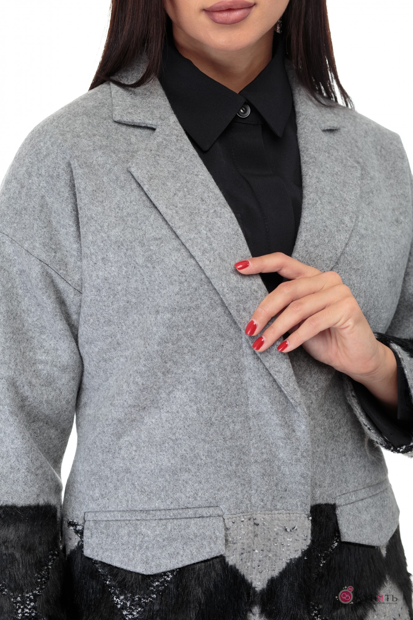 Спущенный рукав с отделкой из ткани-компаньона, отлажной воротник с лацканами, прорезные действующие карманы с клапаном в шве соединения деталей. Супатная (потайная)