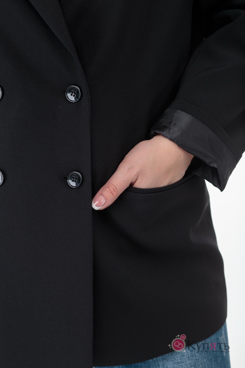 Двубортный жакет прямого силуэта на подкладке выполнен из костюмной ткани в чёрном цвете..
