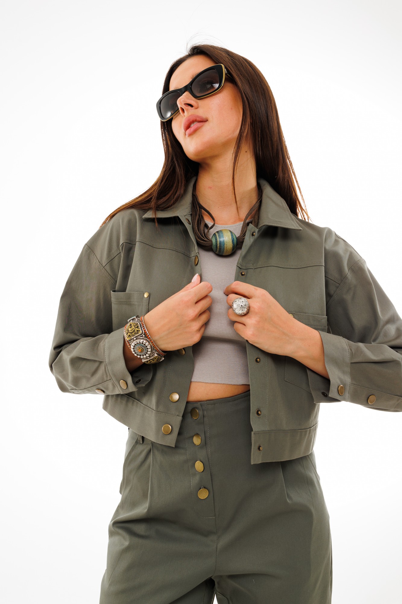 Джут из хлопкового джинса от Анелли – стильный и удобный выбор для каждой модницы. Короткий, до талии, с длинным рукавом и манжетами. Застежка на кнопках придает изысканный вид, а обработанная воротником горловина добавляет элегантности. Спинка украшена планкой на кнопках, придающей изделию изысканный шарм. На модели серая юбка 1050, брюки хаки 948.