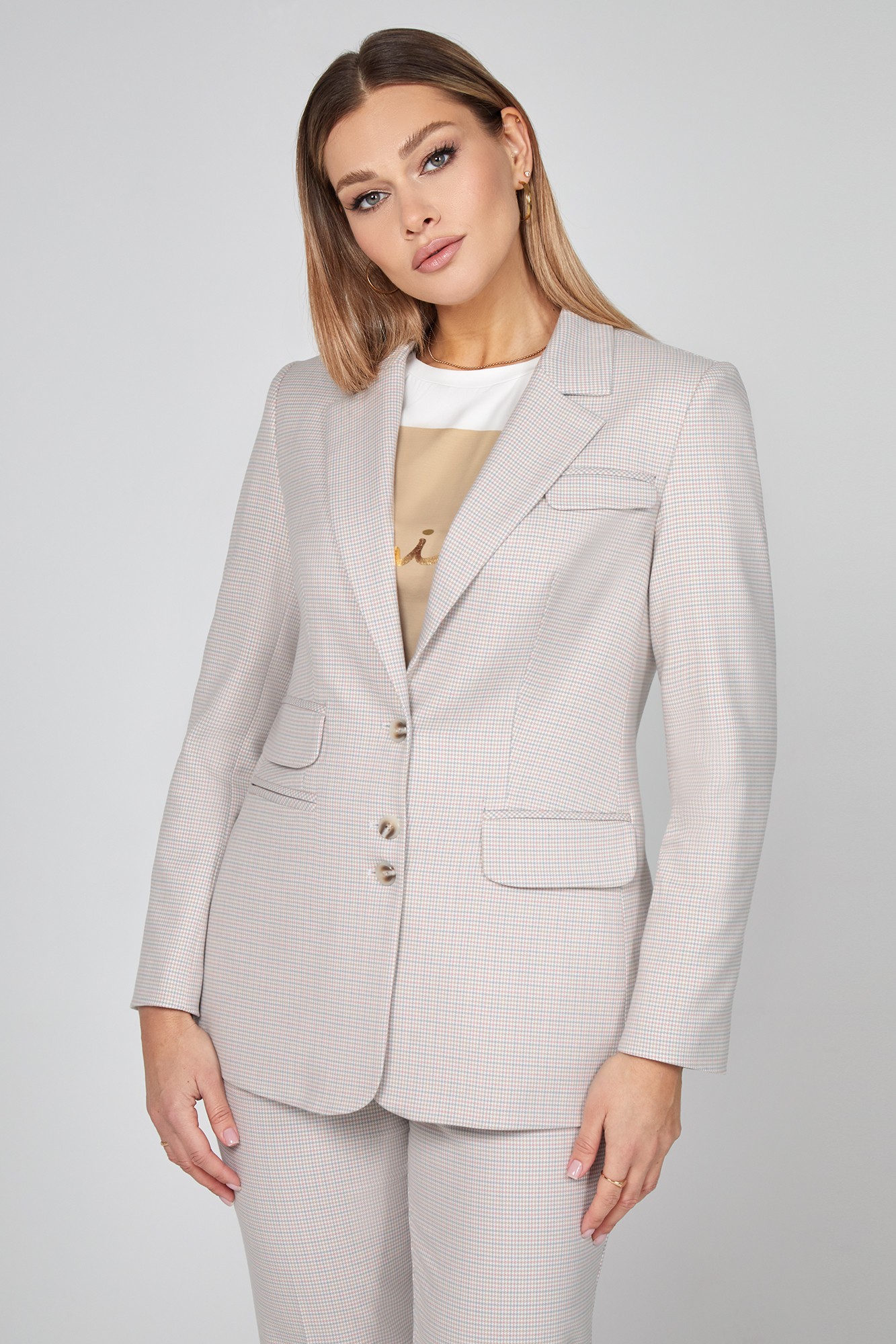 Жакет на передовой моды: модный однобортный жакет полуприлегающего силуэта с приятным рисунком в мелкую гусиную лапку, стильно подчёркнутый сочетанием карманов и интересным расположением пуговиц по борту. Приятная испанская ткань с добавлением вискозы прекрасно держит форму и обеспечивает свободу движений и комфорт. Рукава втачные двухшовные. На подкладке. Универсальный компаньон для множества нарядов.