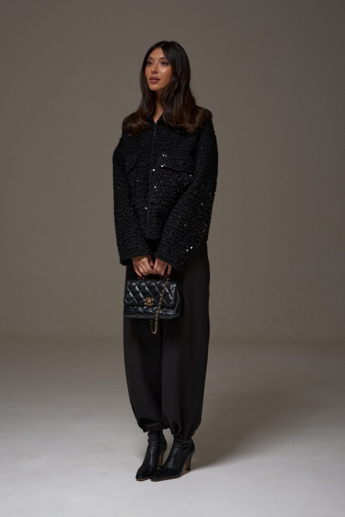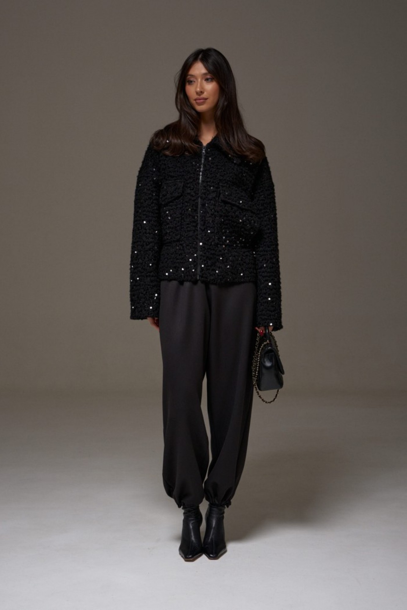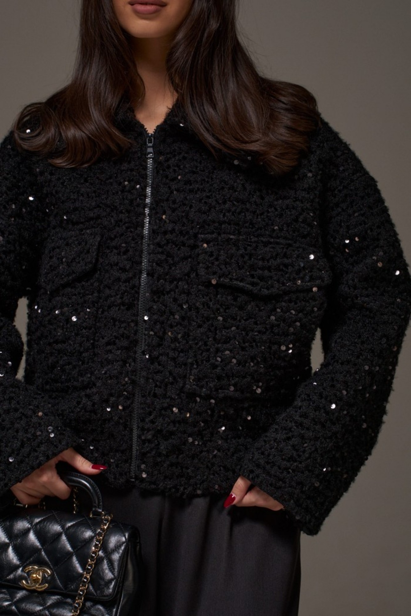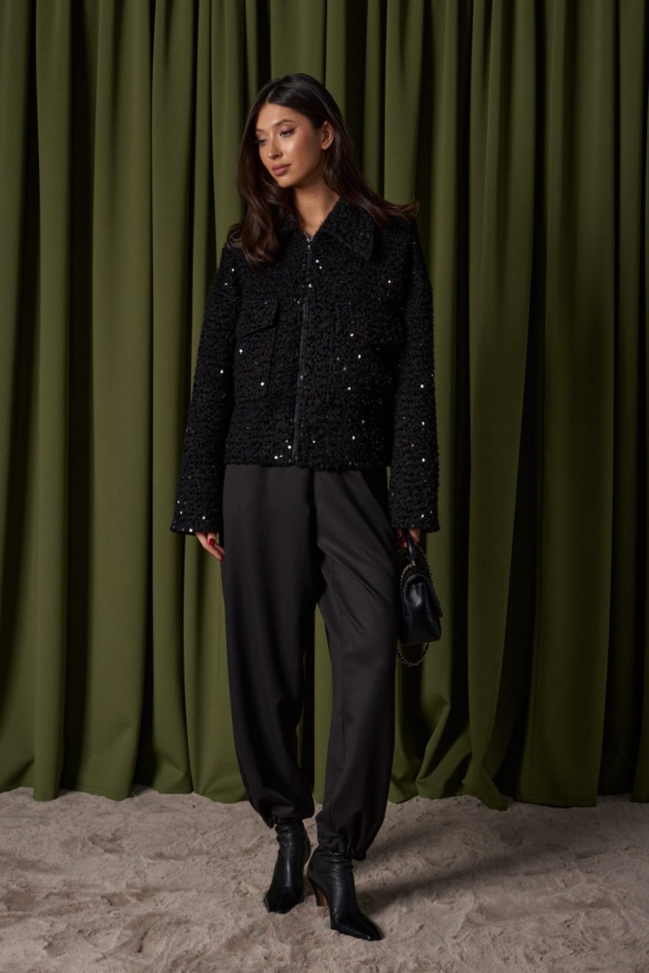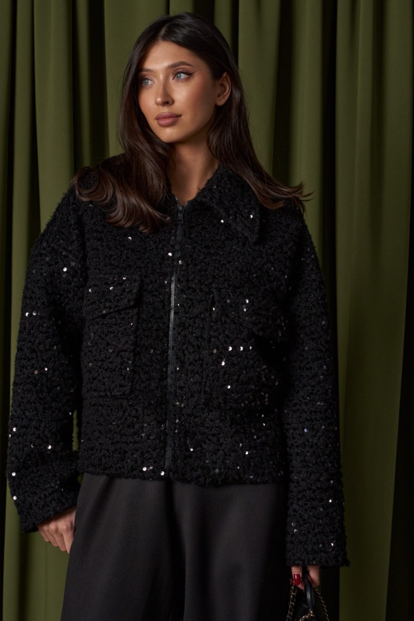 Жакет прямого свободного кроя. Выполнен из фактурной плотной (пальтовой) ткани чёрного цвета с пайетками. С подкладкой. Воротник отложной. Рукав втачной, спущенный. Застёжка центральная - молния. По переду накладные карманы с клапаном (с боковым входом). Спинка цельнокроеная.