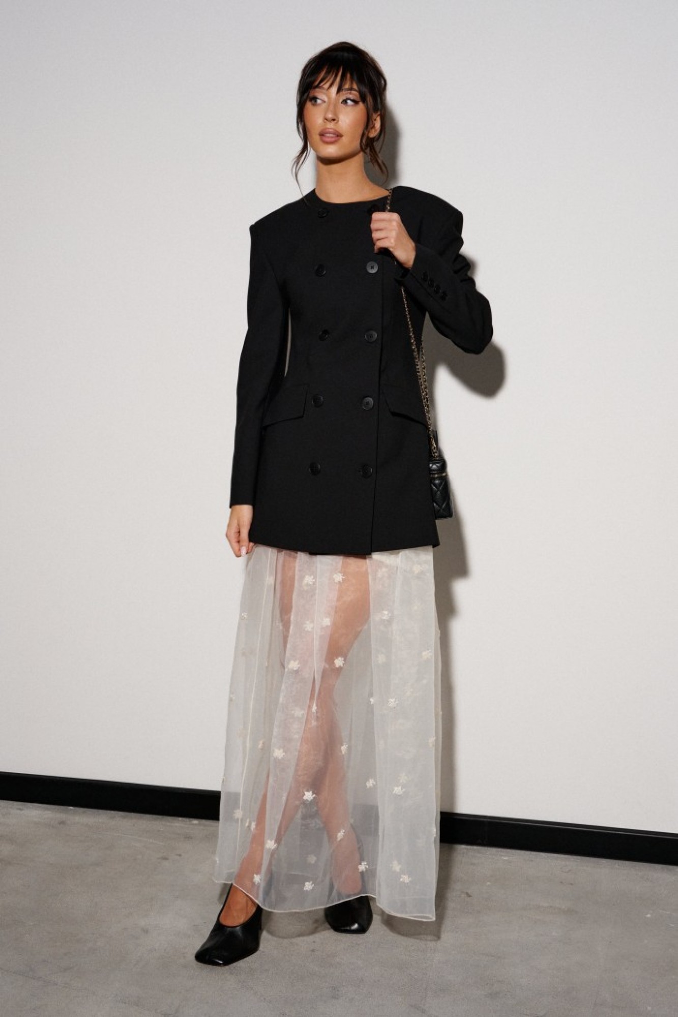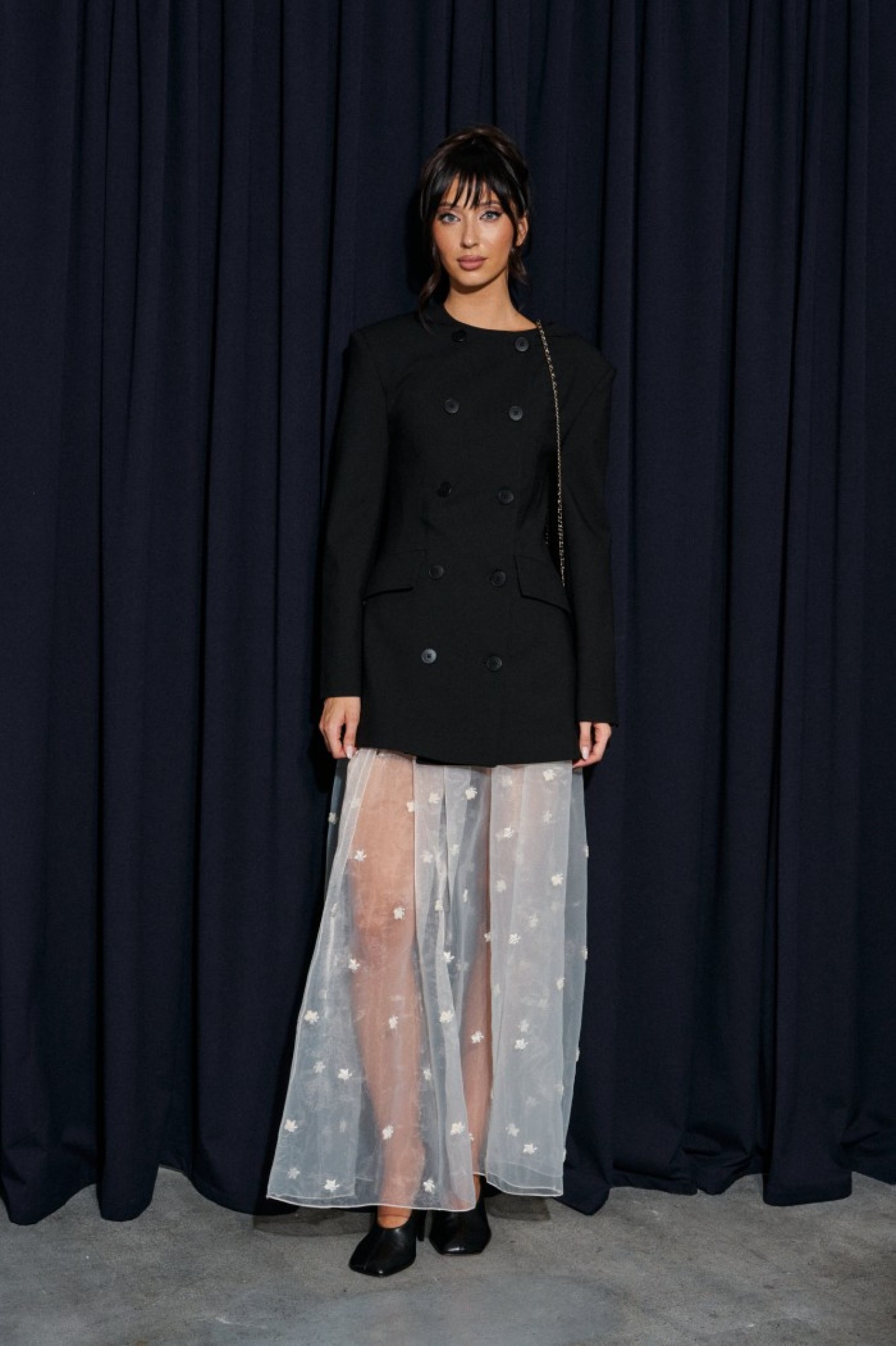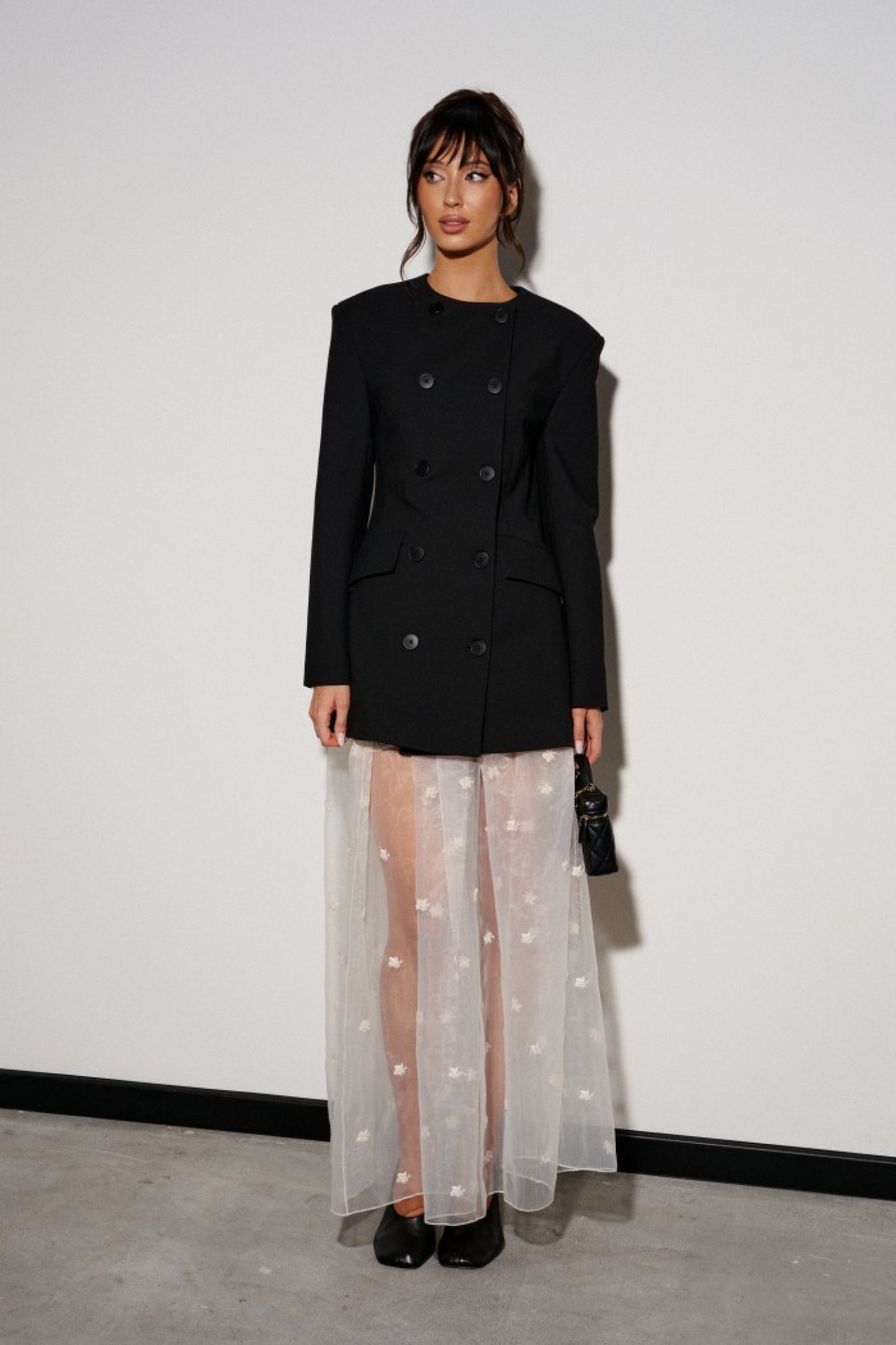Жакет полуприталенного силуэта выполнен из текстильного полотна черного цвета. Характеристики: полуприталенный силуэт, двубортный, брендированная подкладка, подплечники, овальный вырез горловины, по переду функциональные карманы с клапаном, рукав втачной, по низу рукава нашиты пуговички.