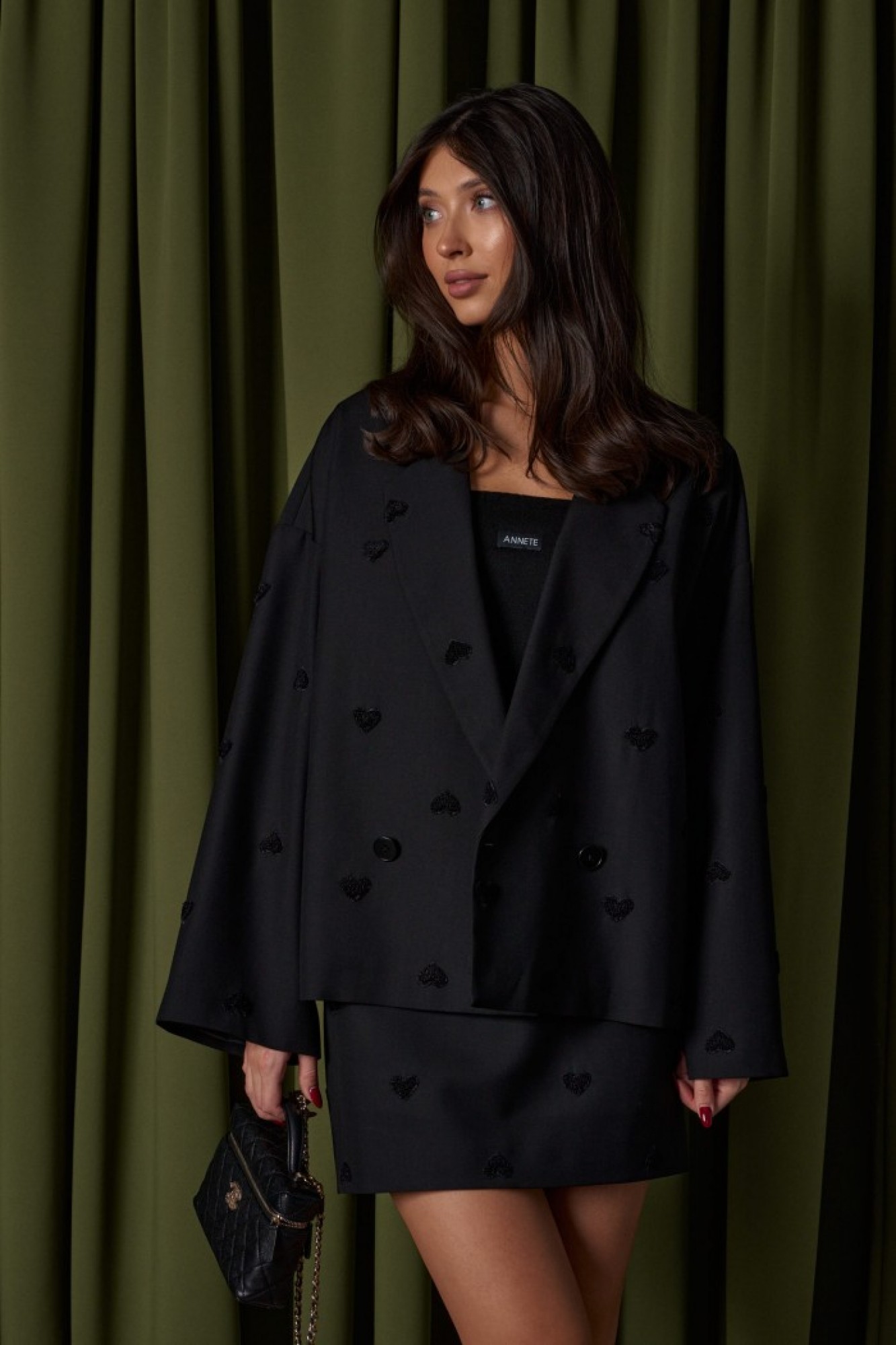 Жакет прямого кроя, выполнен из костюмной ткани черного цвета с шитьем в форме сердец. Характеристика: Жакет двубортный, подклад, воротник с остроугольным лацканом, в боковых швах изделия карманы, рукав спущенный, прямой.