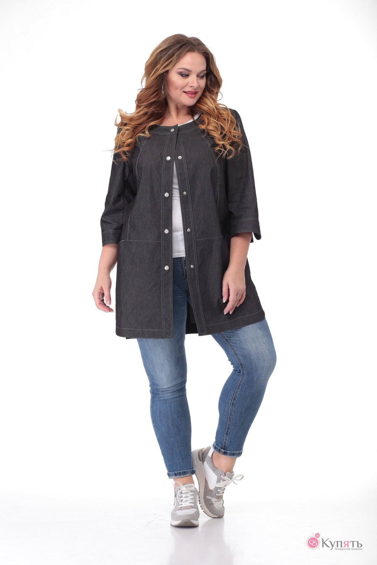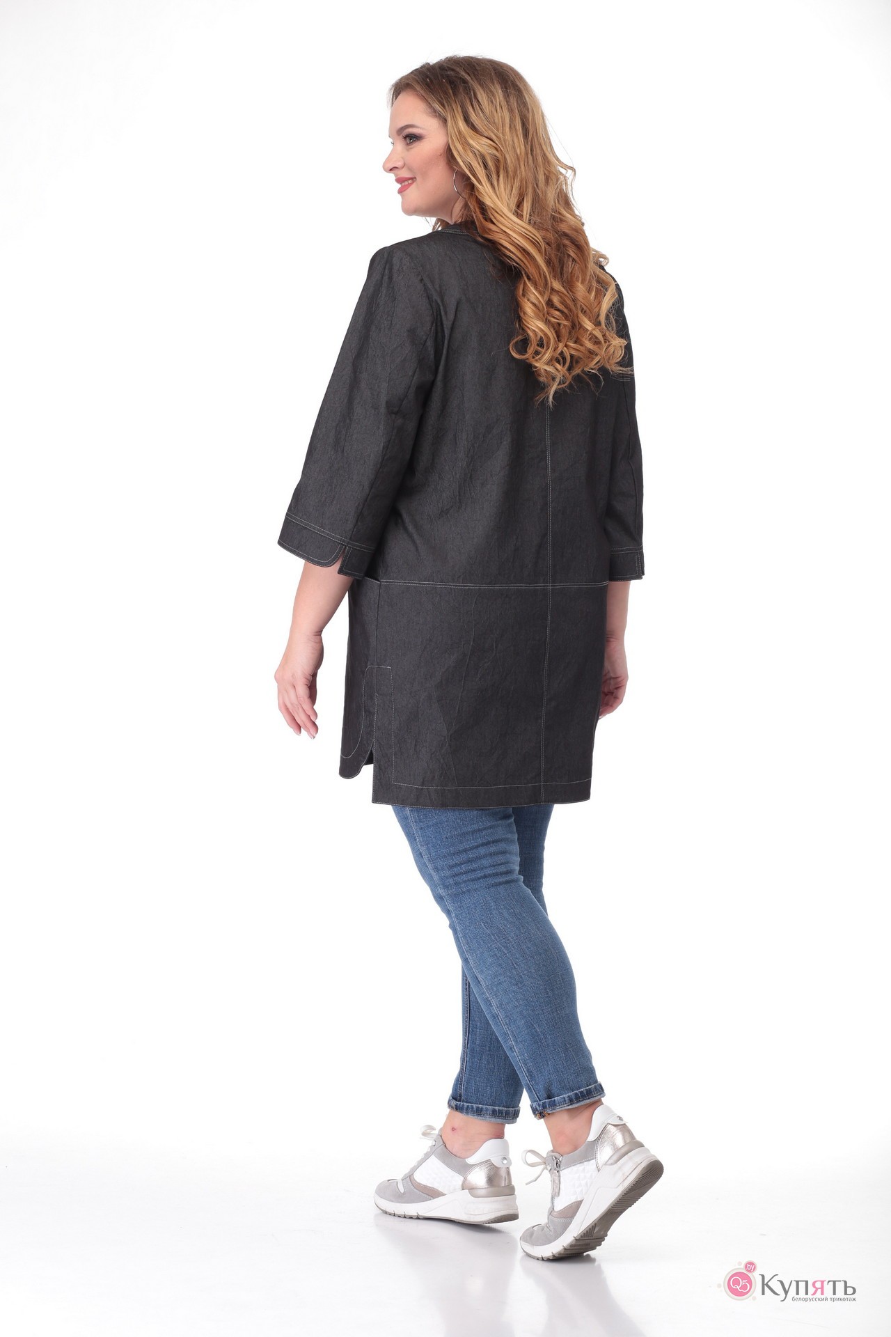 Женский жакет-кардиган, прямого силуэта. Горловина округлой формы, застежка центральная на притачную планку, застегивается на металличесские кнопки. В отрезной части переда обработаны карманы. Спинка со средним швом и отрезной частью. Низ фигурный. В боковых швах разрезы. Рукав втачной, двухшовный, с притачной манжетой, 3/4. Изделие без подкладки. По швам проложены отделочные строчки. Длина рукава 46 см, длина по спинке 86 см.
