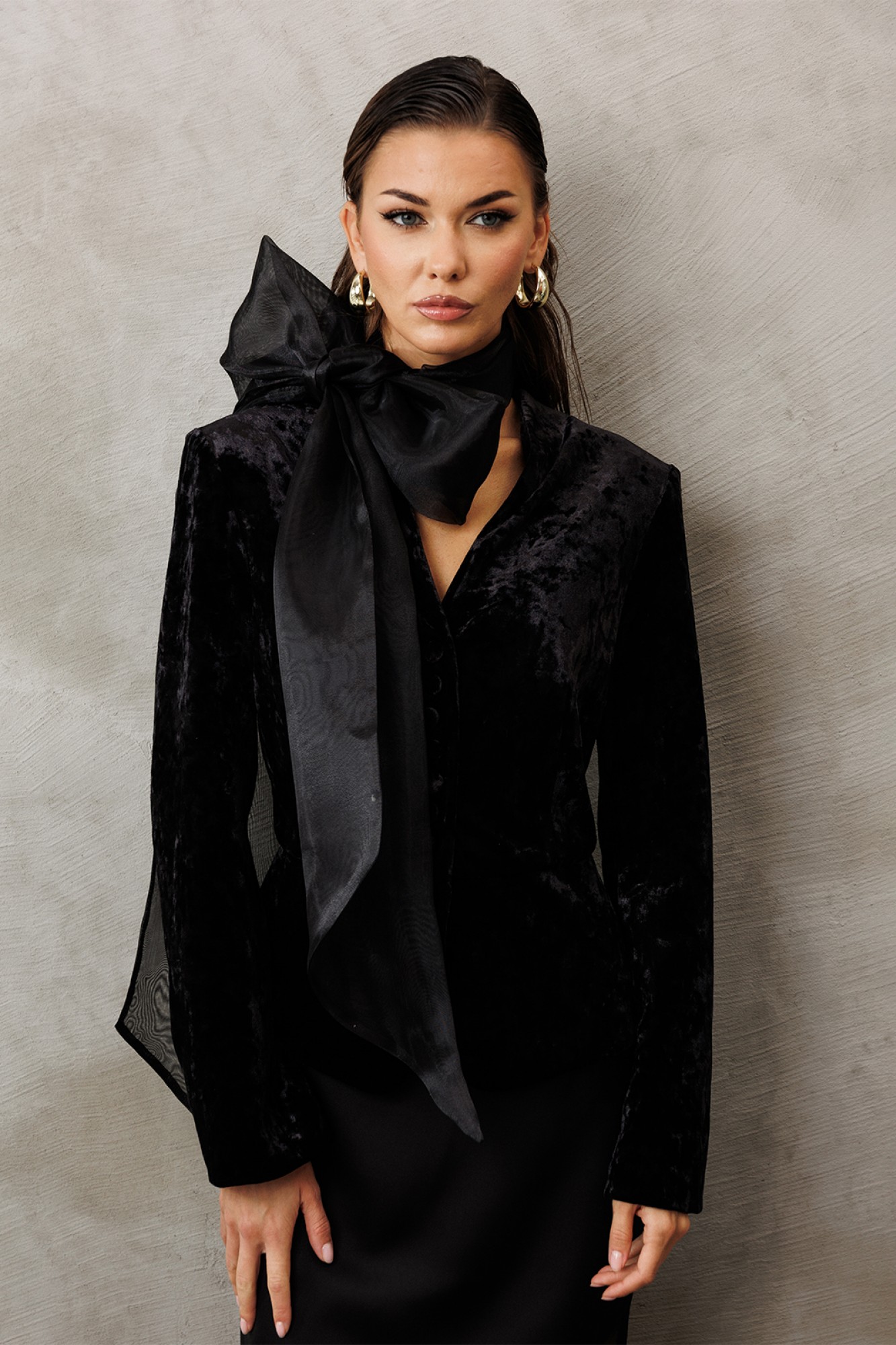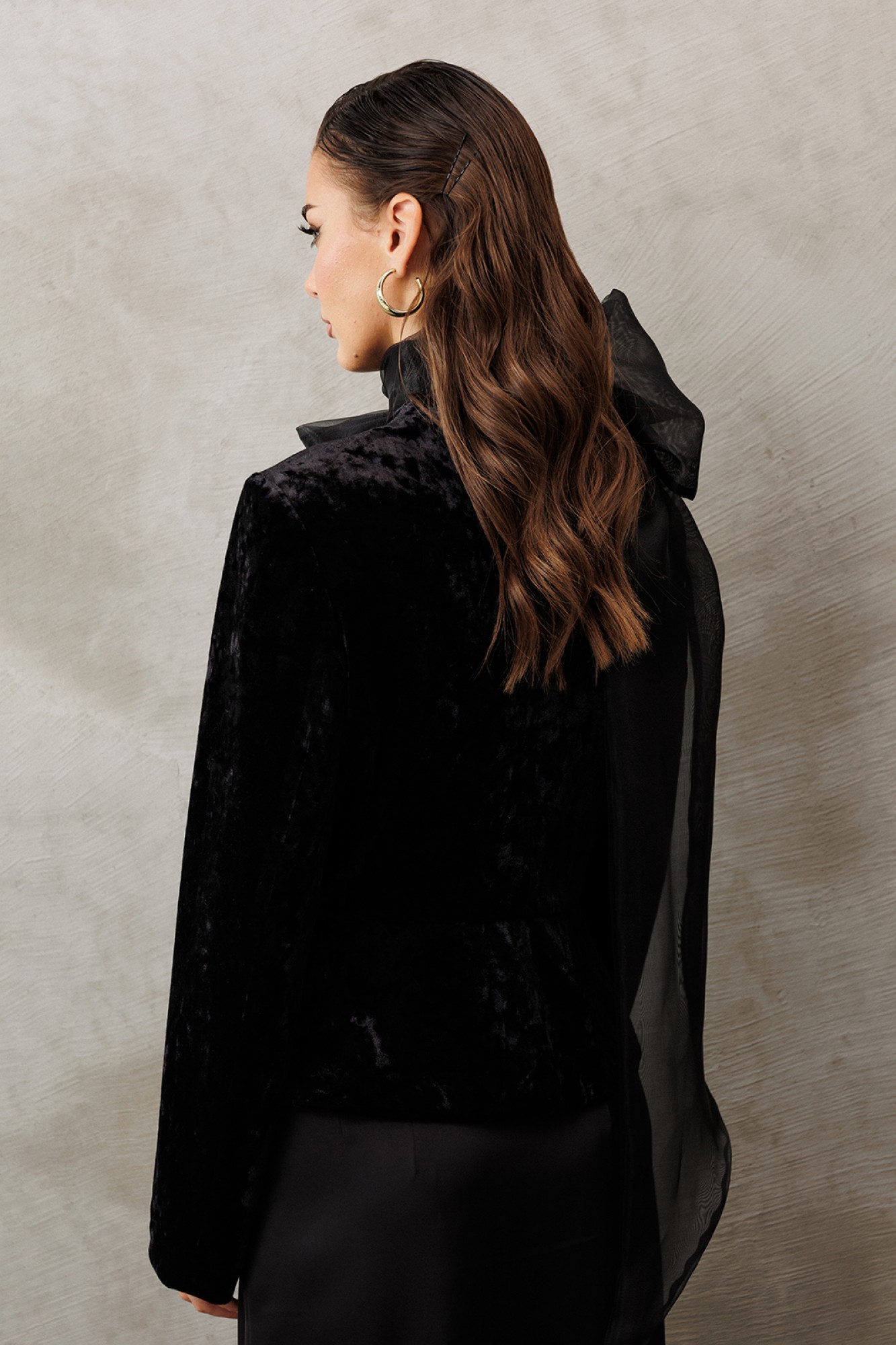 Жакет из велюровой ткани полуприлегающего силуэта, с втачным двухшовным рукавом. Полочка и спинка с отрезной баской по линии талии. Полочка с V-образным вырезом, однобортной застежкой на петли пуговицы и таллиевой вытачкой от баски. Спинка с центральным швом. Жакет с отрезным бочком, переходящим на полочку и на спинку. Жакет на подкладке.