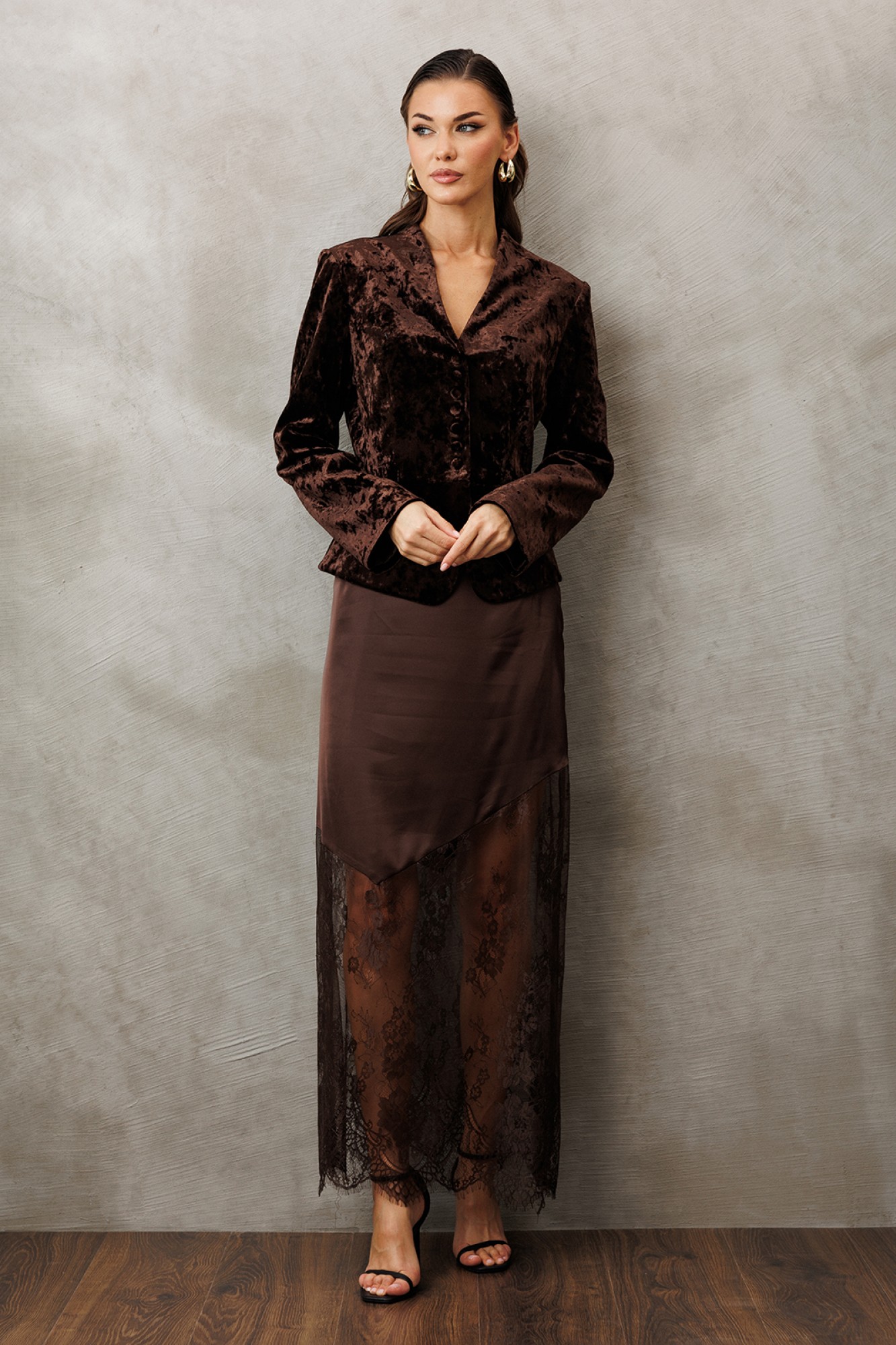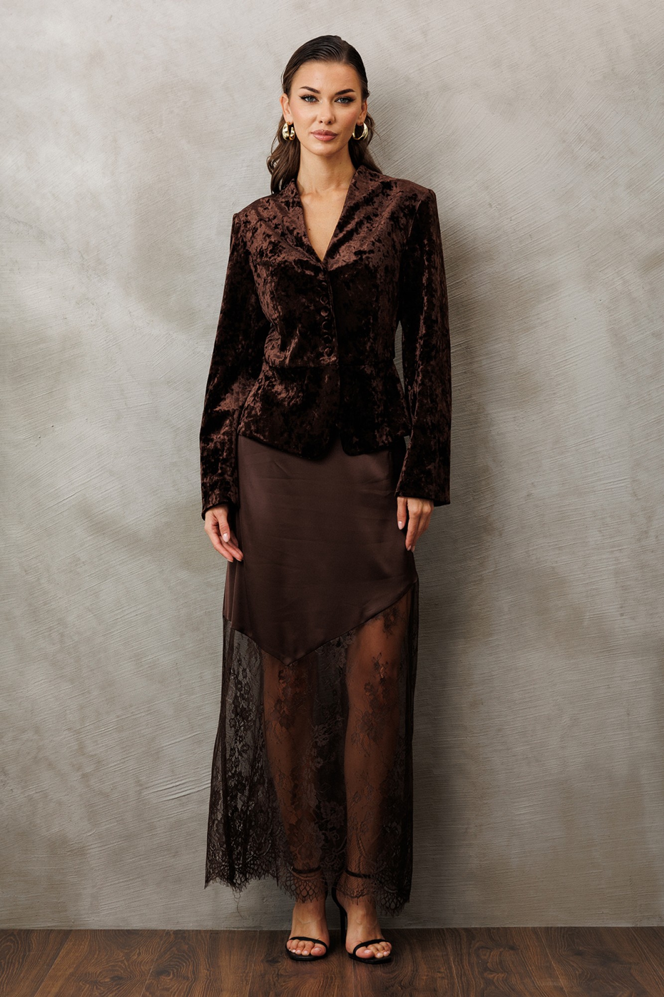 Жакет из велюровой ткани полуприлегающего силуэта, с втачным двухшовным рукавом. Полочка и спинка с отрезной баской по линии талии. Полочка с V-образным вырезом, однобортной застежкой на петли пуговицы и таллиевой вытачкой от баски. Спинка с центральным швом. Жакет с отрезным бочком, переходящим на полочку и на спинку. Жакет на подкладке.