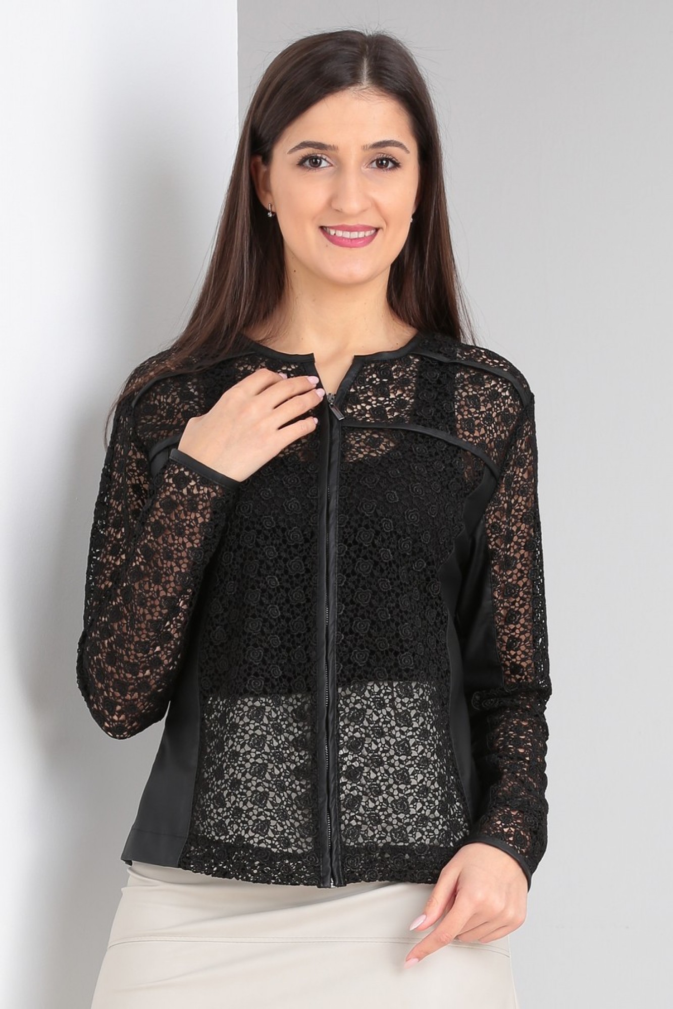 Полочка разрезная с кокеткой, окантованной экокожей. Застежка центральная на молнию, рукав втачной. Спинка разрезная с кокеткой и рельефами. Полочка, спинка и рукава состоят из двух частей: экокожи и кружева.