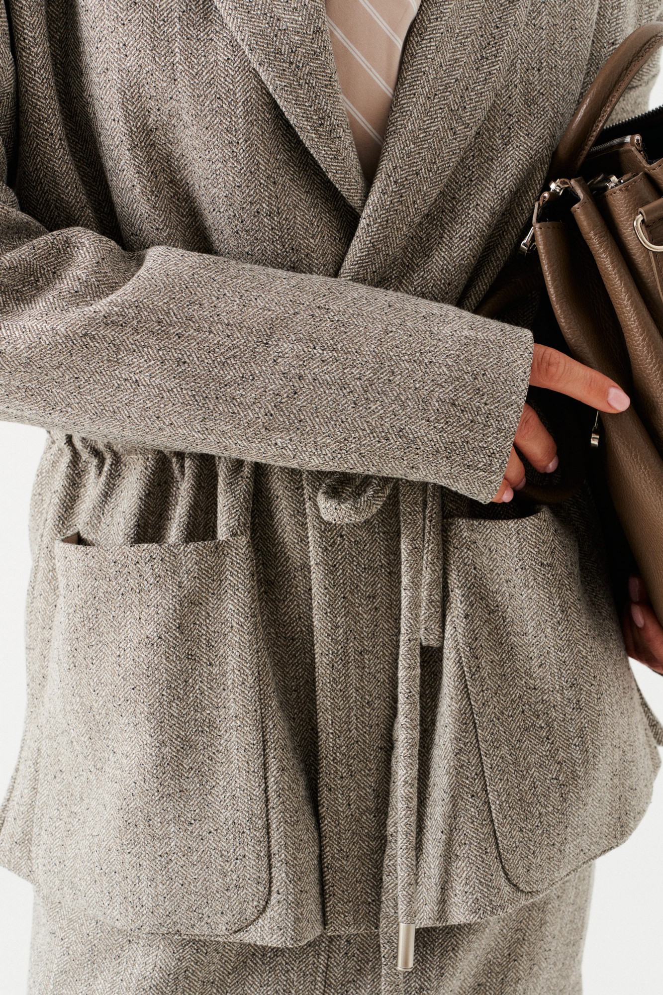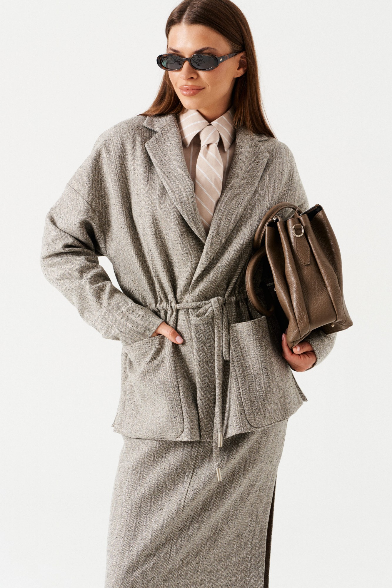Жакет женский, однобортный, со спущенной линией плеча, на подкладке, с отложным воротником и лацканами пиджачного типа, на подкладке. По переду – накладные карманы. Спинка со средним швом. На уровне линии талии – кулиса со шнуром-завязкой. Рукав длинный.