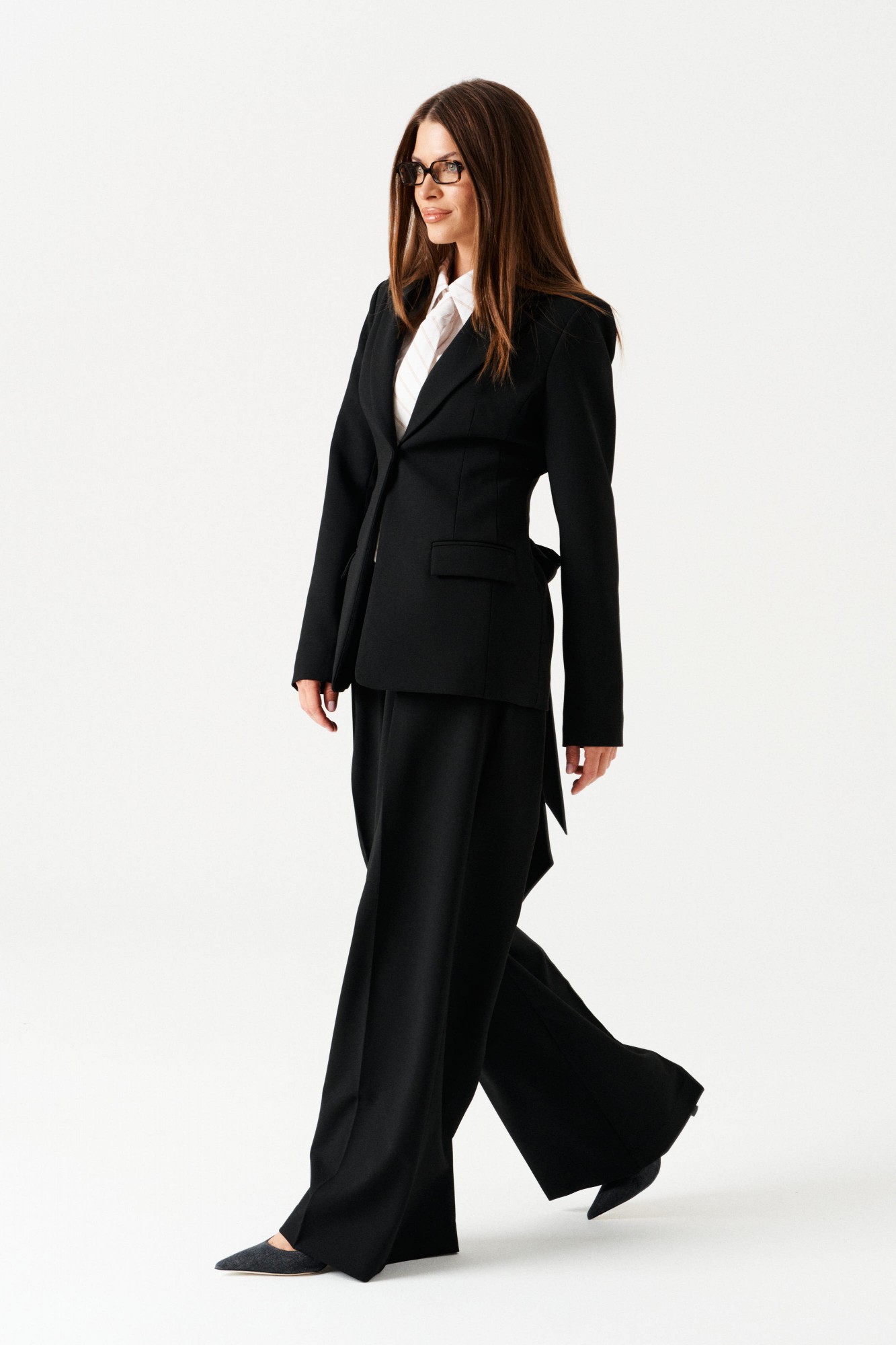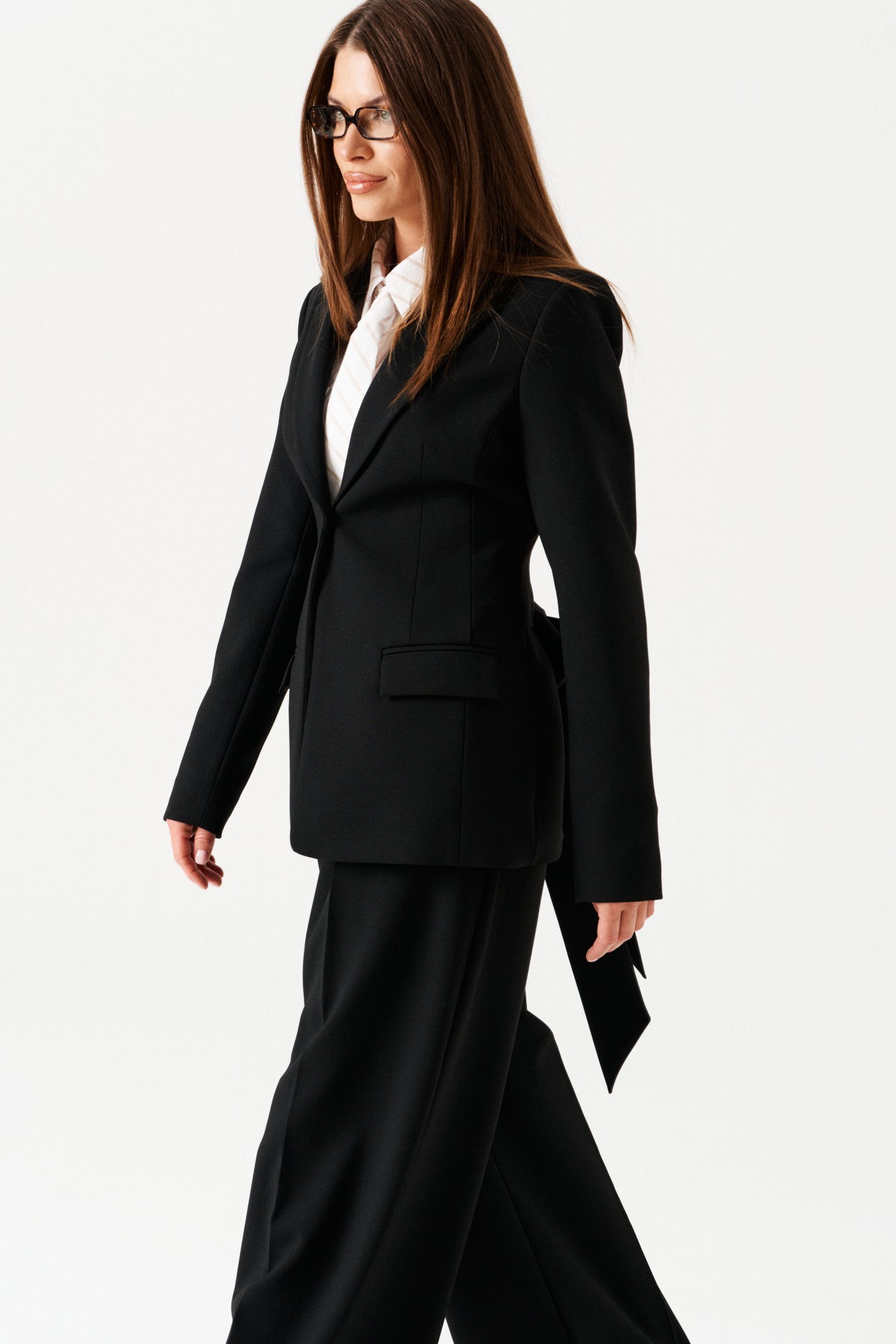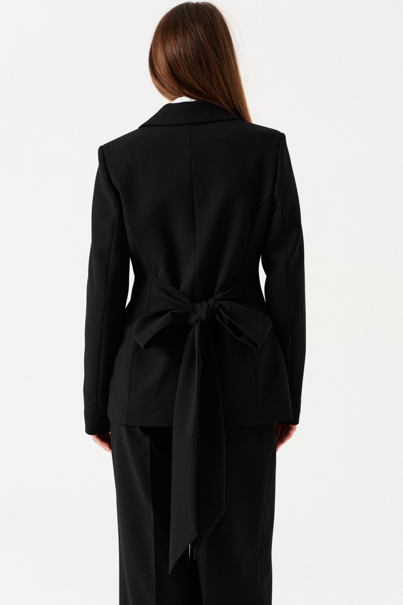 Жакет женский, полуприлегающего силуэта, на подкладке, с центральной застежкой на 1 петлю и 1 пуговицу, отложным воротником и лацканами пиджачного типа. Полочки с таллиевыми вытачками, отрезными бочками и прорезными карманами с клапанами. Спинка со средним швом, отрезными бочками и объемным бантом из основной ткани. Рукав длинный, втачной, двухшовный.