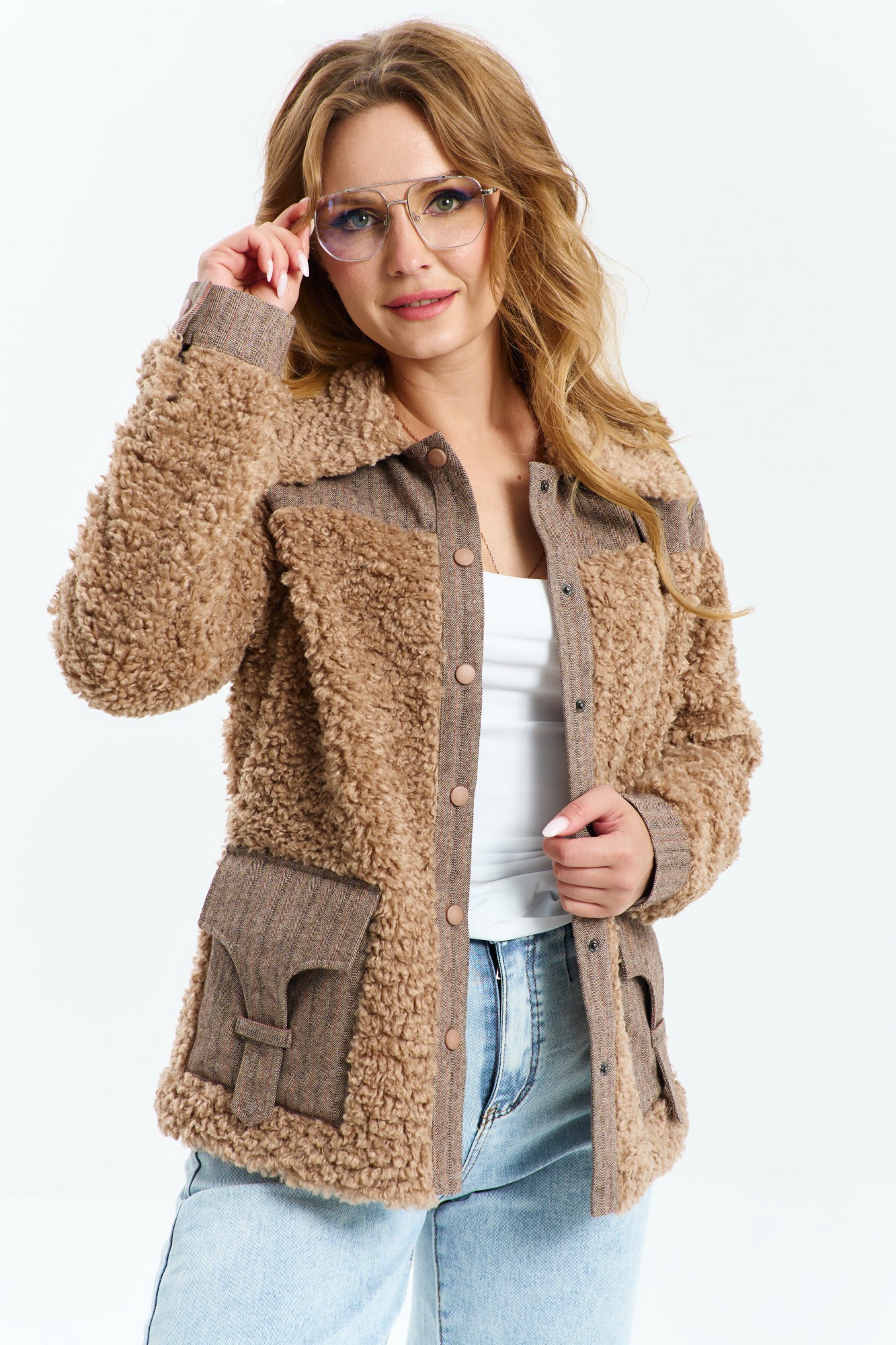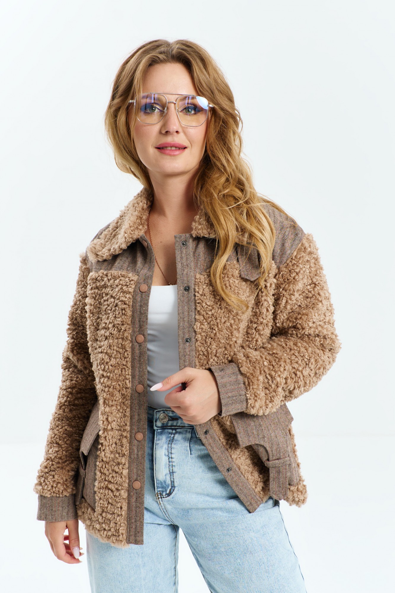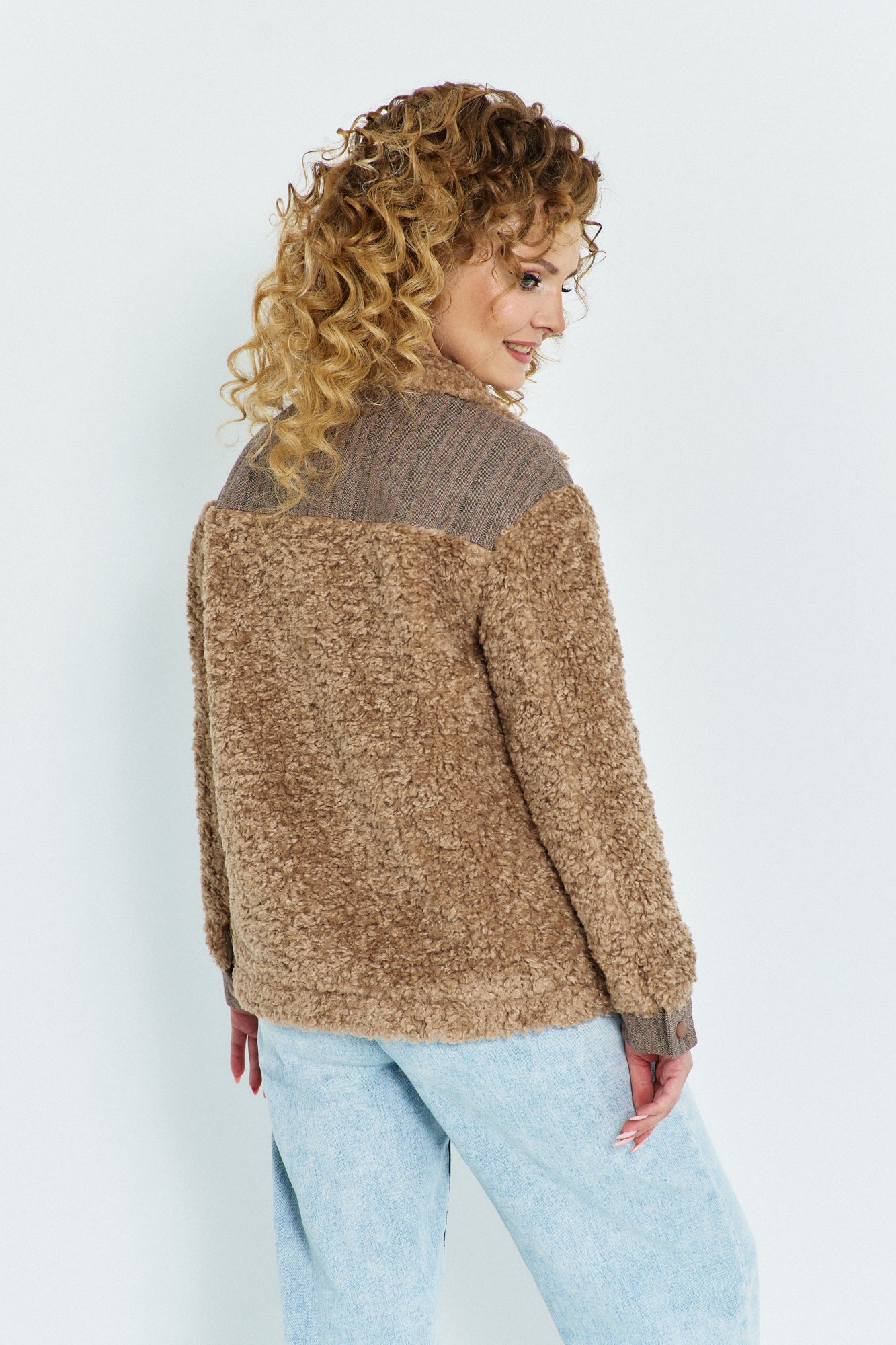 Жакет женский выполнен в сочетании костюмной хлопковой ткани и искусственного меха, изделие свободного кроя . На полочке и спинке изделия расположена контрастная кокетка, рукав втачной длинный с манжетой по низу, горловина- отложной воротник на стойке. Застежка петли-кнопки на планке. без утеплителя.