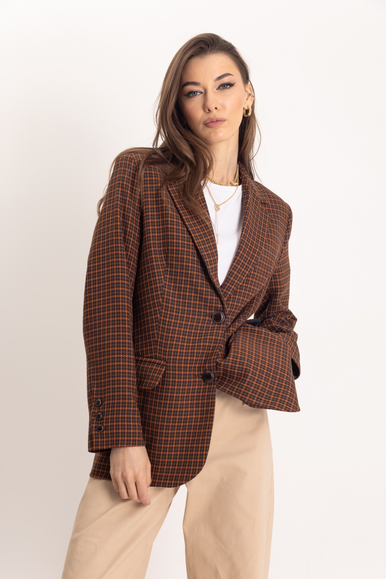 В этом сезоне осень-зима‘ 23 классическая клетка растеряла свою чопорность за счет яркого рыжего оттенка: этим мотивом украсили однобортный приталенный жакет. Для создания модели мастера бренда ‘EZER использовали легкий материал на основе не мнущейся поливискозы, так же этот состав защищают от появления пиллей (катышек). Такая модель из осенне-зимней коллекции успешно справляется с многозадачностью, одинаково хорошо рифмуясь и с узкими брюками, и с юбкой. Богатые лаковые пуговицы придают особый английский стиль.