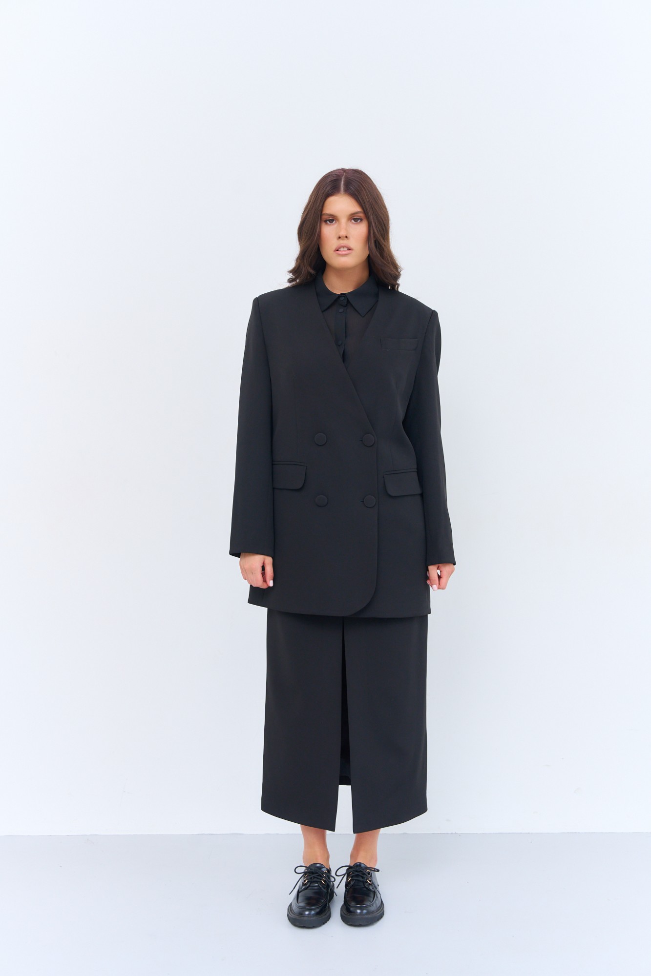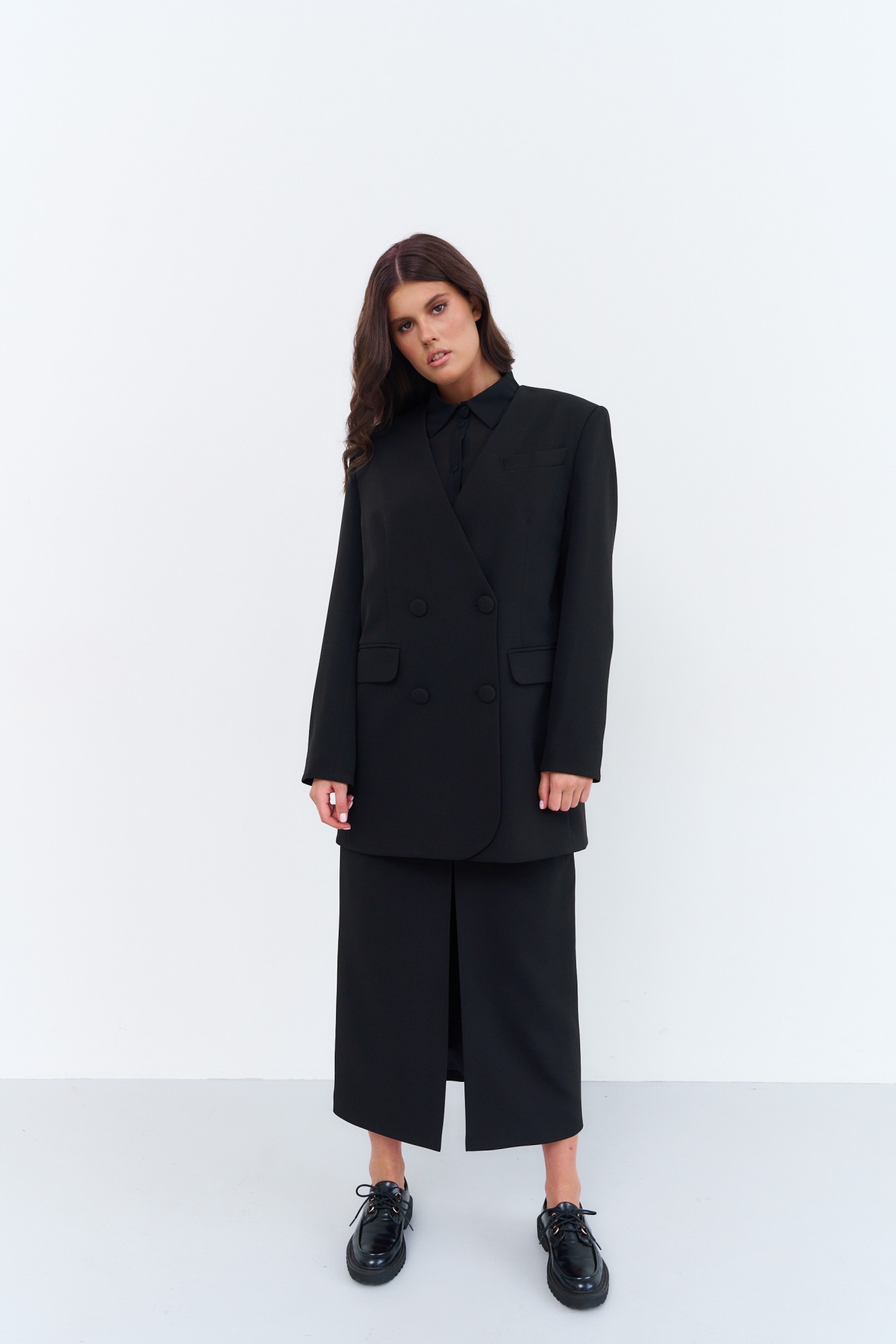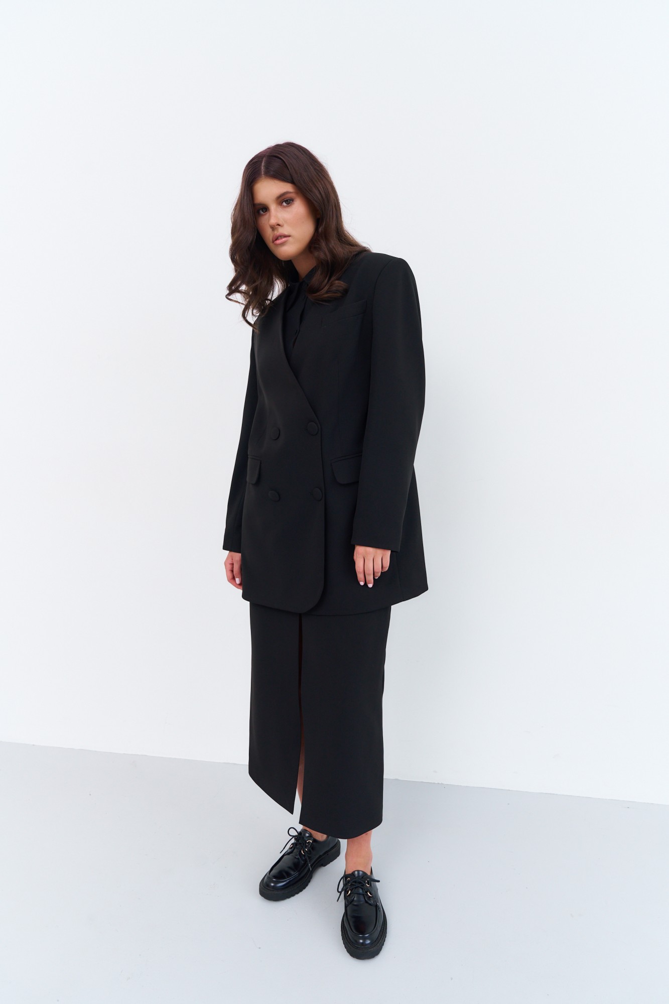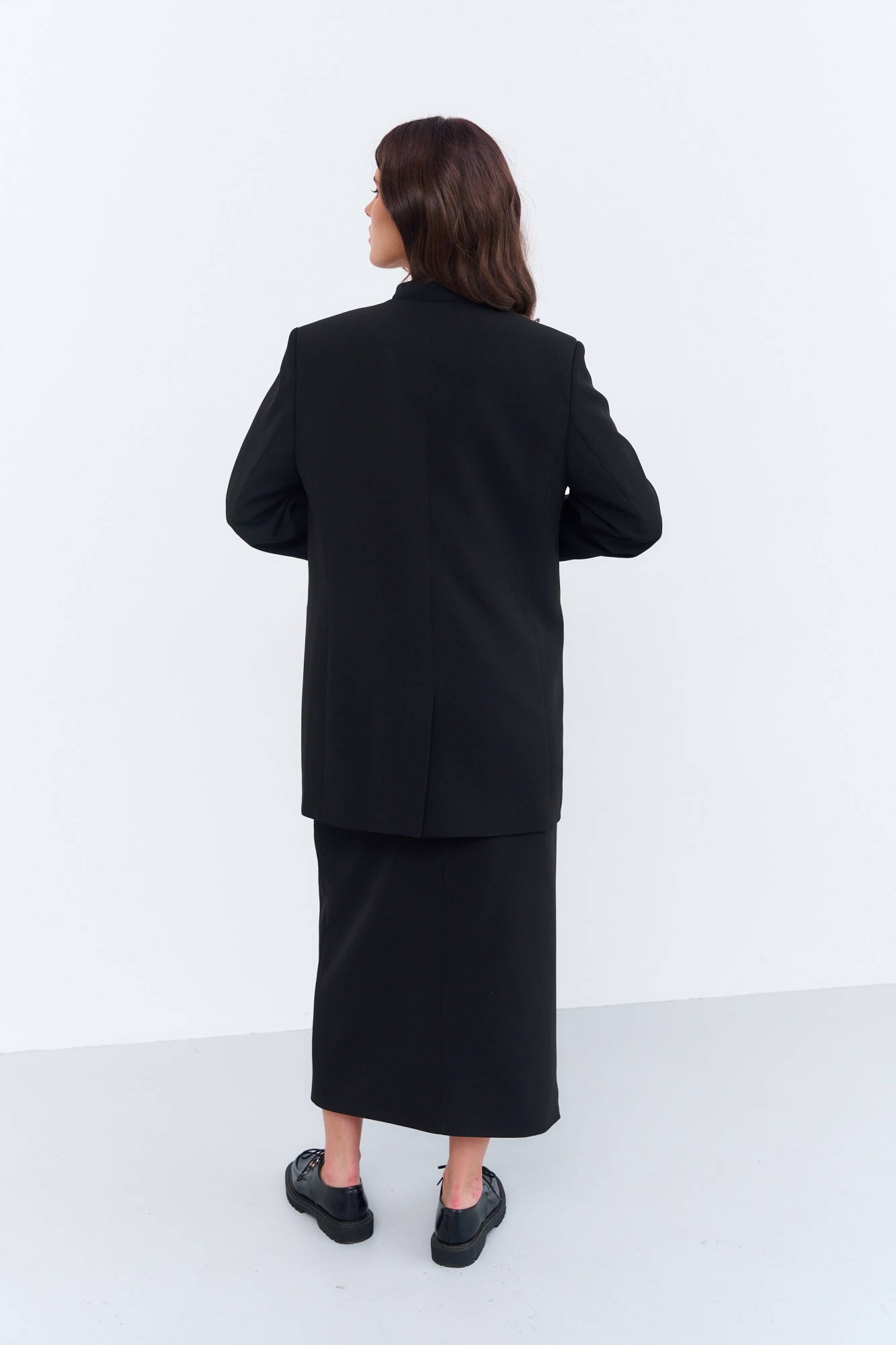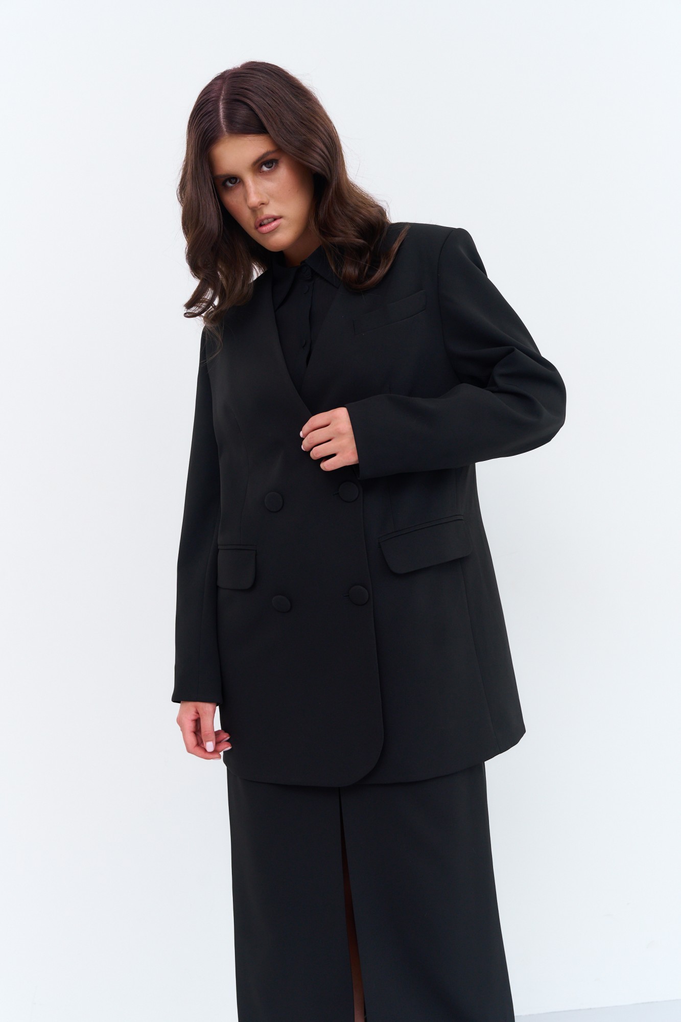 Жакет свободного кроя V-образным вырезом. Характеристики: выполнен из костюмной ткани в черном цвете, двубортная застежка на петли и пуговицы, жакет на подкладке, функциональные карманы с клапаном, по спинке разрез-шлица, рукава двухшовные. Длина жакета по переду 85,5 см, длина рукава 63 см.