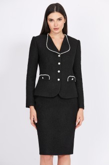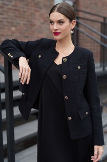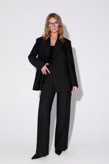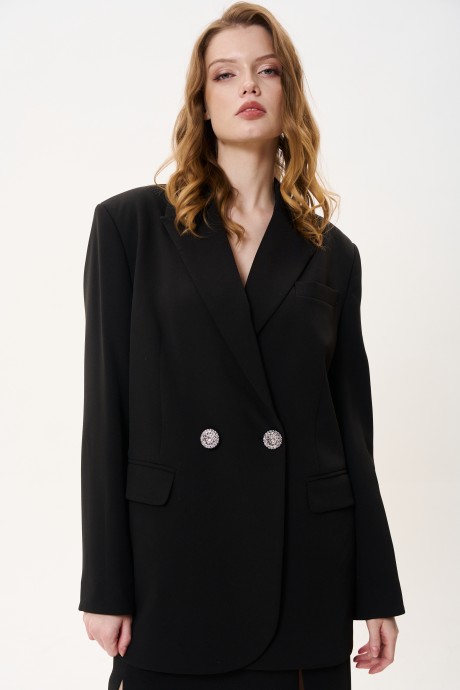 Жакет свободного кроя. Характеристики: выполнен из костюмной ткани в черном цвете, двубортная застежка на петли и декоративные пуговицы, жакет на подкладке, функциональные карманы с клапаном, по спинке разрез-шлица, рукава двухшовные. Длина жакета по переду 79 см, длина рукава 63 см.