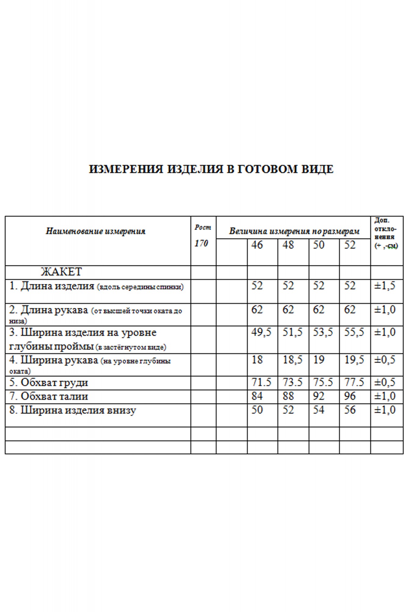 Жакет с центральной двубортной застежкой на петли и пуговицы, без воротника. По переду с двумя рельефными швами, выходящими из проймы. На уровне линии талии расположены клапаны. Спинка со средним швом, рельефными швами, выходящими из проймы.