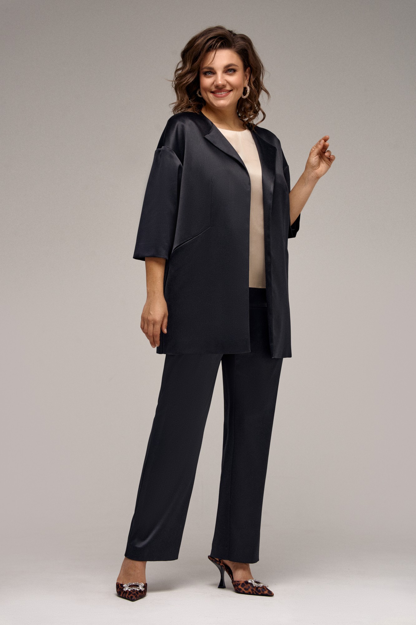 Жакет свободного кроя удлиненный из сатиновой ткани с содержанием шелка, на подкладке, со втачными немного спущенными рукавами; по переду жакета декоративные подрезы, переходящие в карманы. Рекомендована бережная стирка при t 30; глажение при максимальной температуре прессующей поверхности утюга не более 110 С.