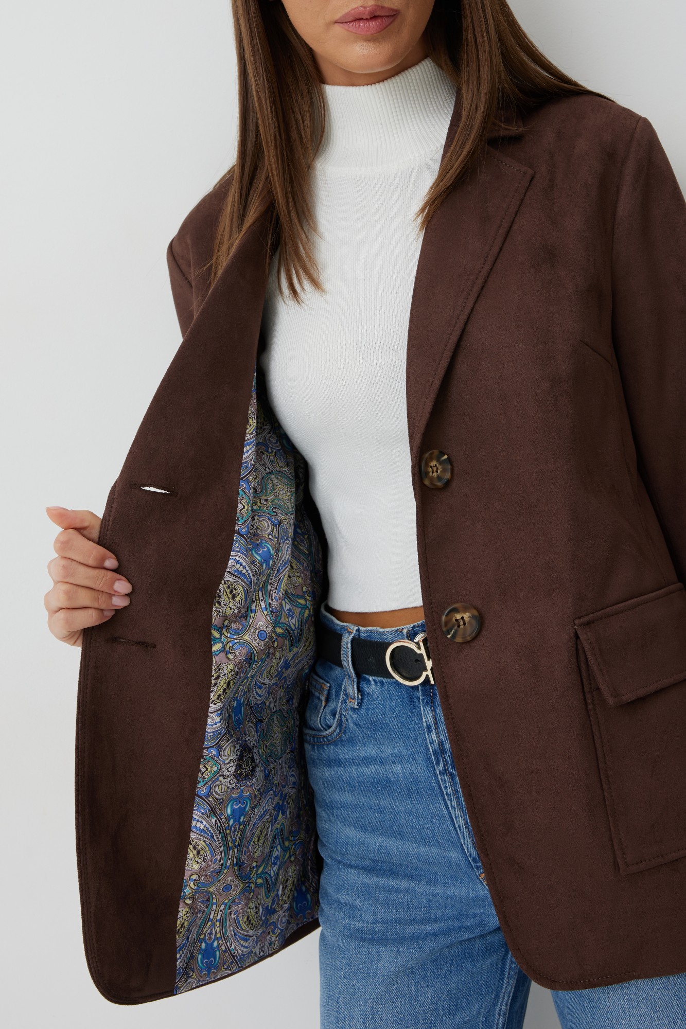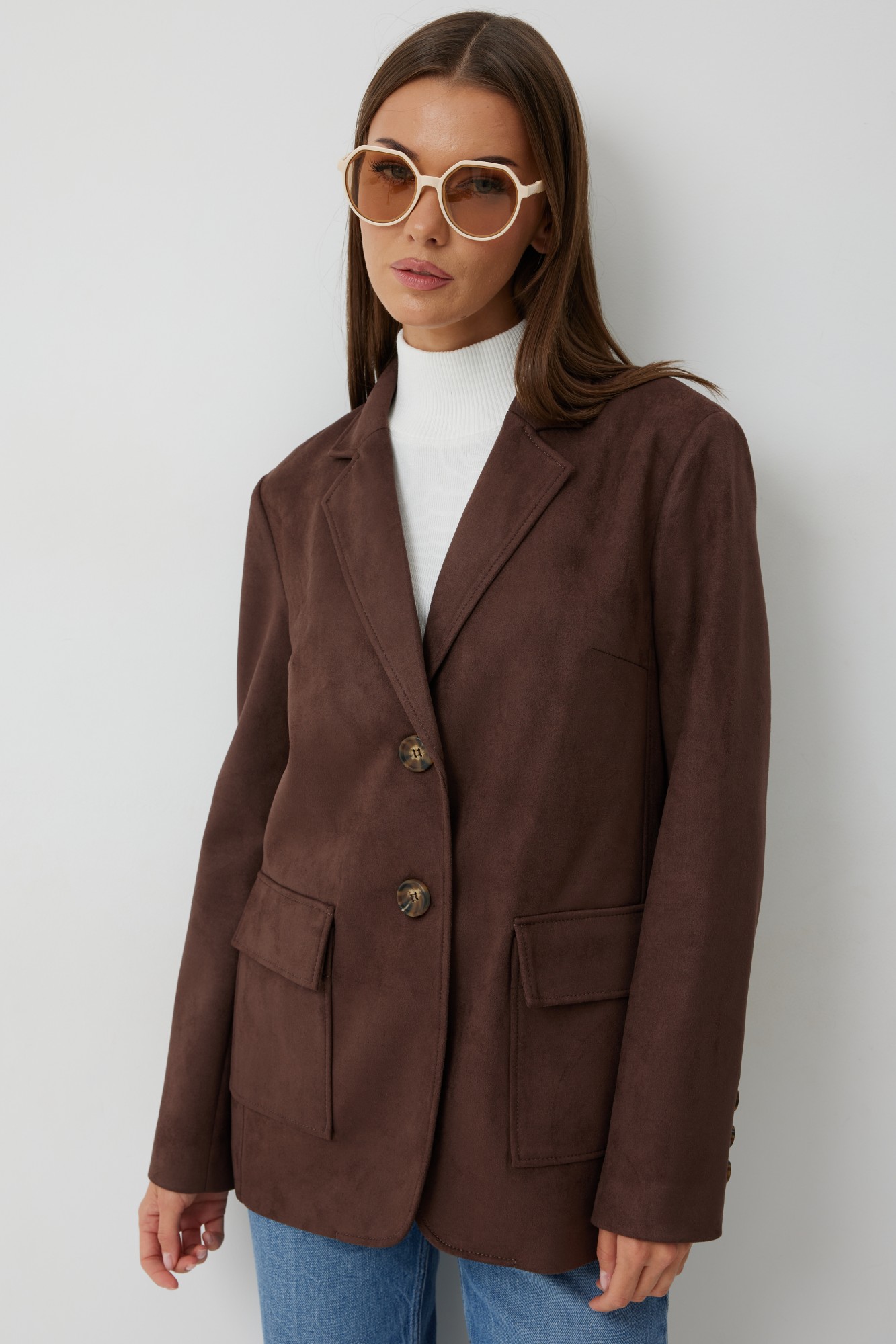 Жакет женский прямого силуэта на частичной подкладке. Жакет однобортный, длинной до середины бедра. Полочка с отрезными бочками и вытачкой. На нижней части полочки настрочены накладные карманы с клапаном. Спинка с отрезными бочками и отрезной кокеткой Рукав втачной, полной длинны. По низу рукава обработана имитация шлицы с отделочными декоративными пуговицами. Воротник в жакете втачной с отрезной стойкой и лацканами. Линия низа борта полочки скруглена. Жакет застегивается на петли пуговицы. По воротнику, лацкану, борту, карманам и швам спинки прострочены отделочные строчки. Полочки, кокетка спинки и рукава с контрастной подкладкой. Декоративные элементы и фурнитура могут отличаться от заявленных на фото. Цвет материала может отличаться по тону в зависимости от настроек вашего монитора!