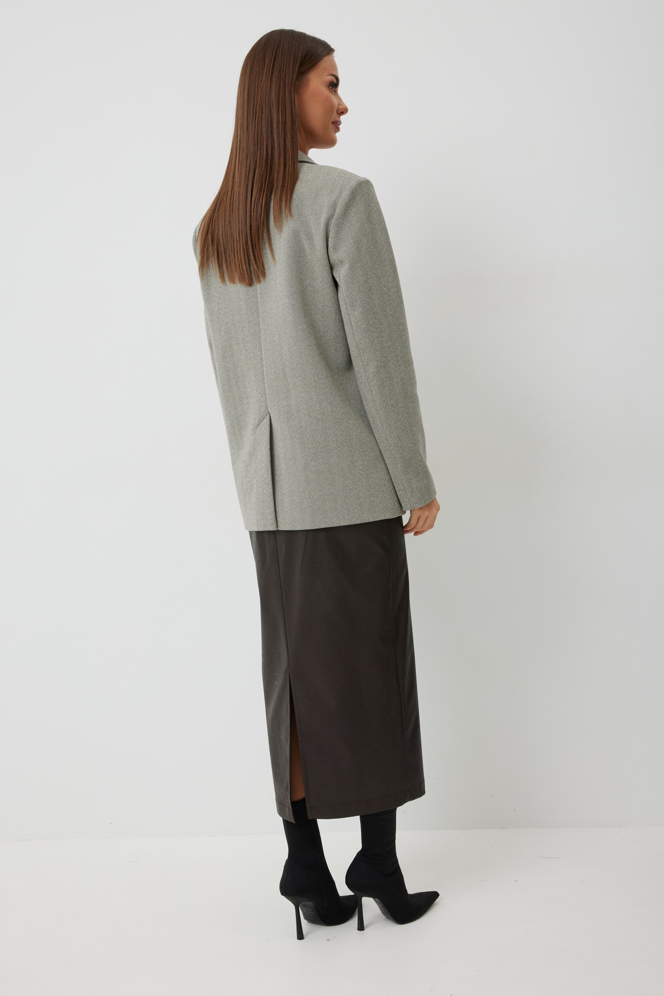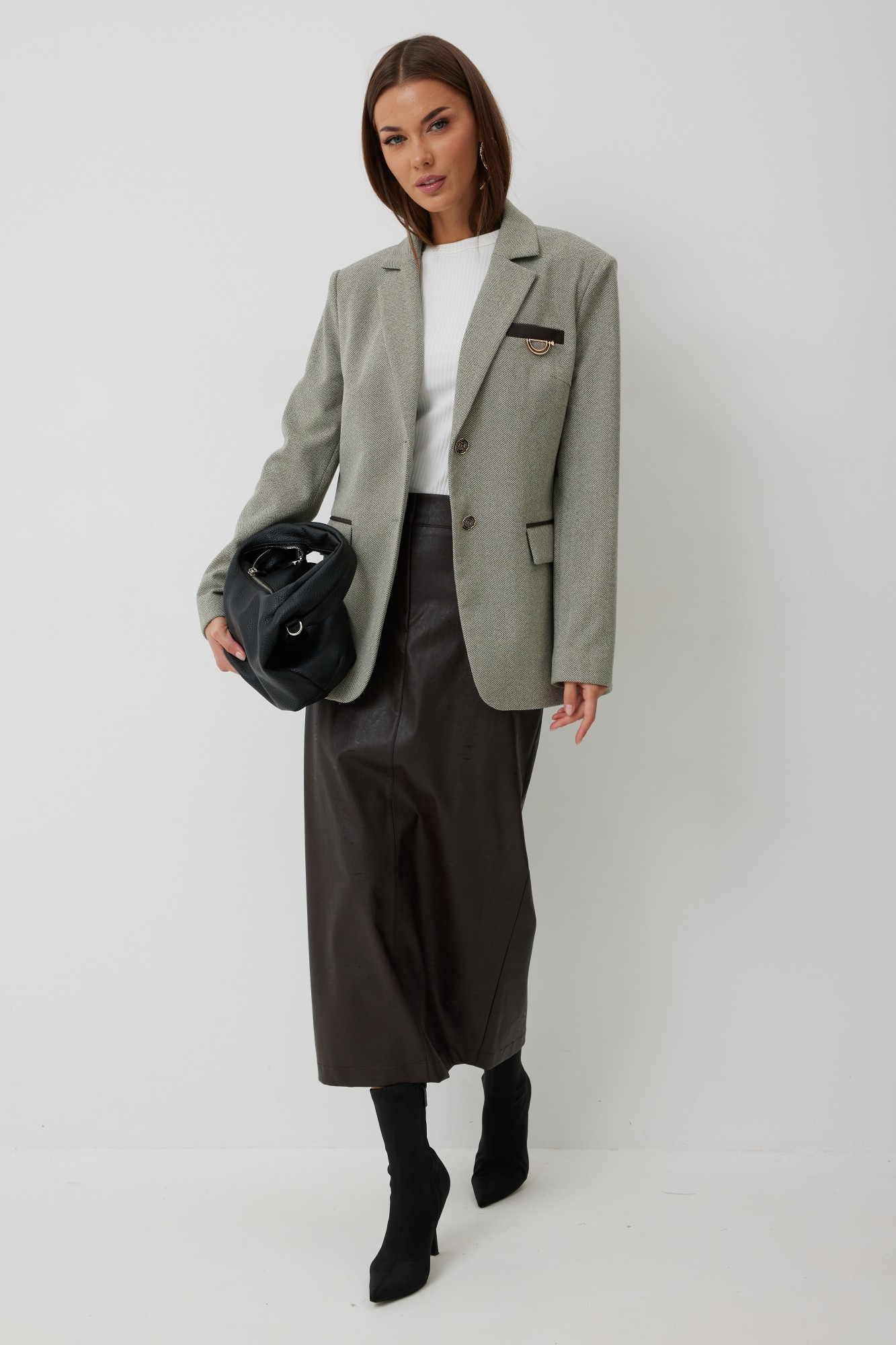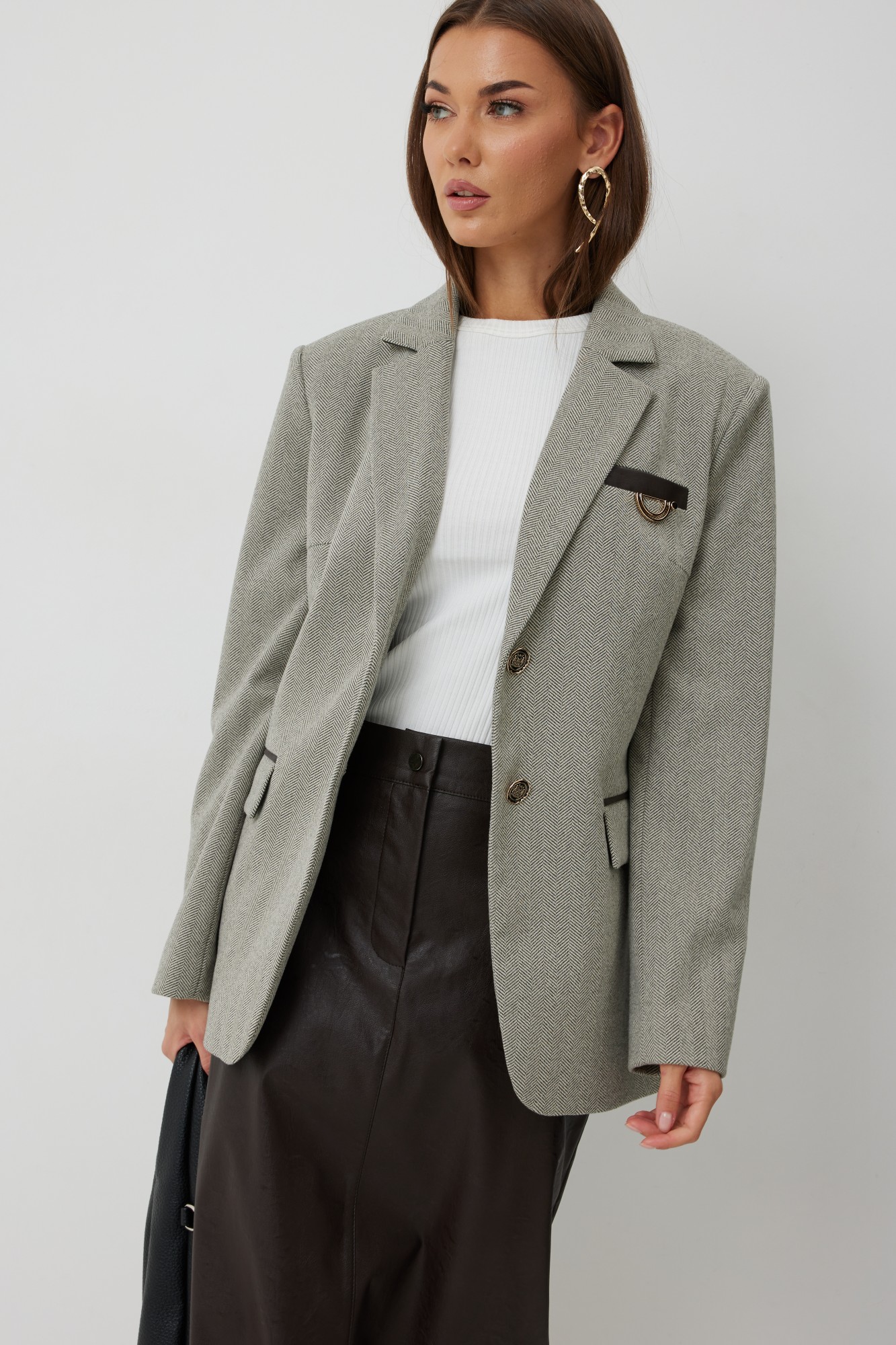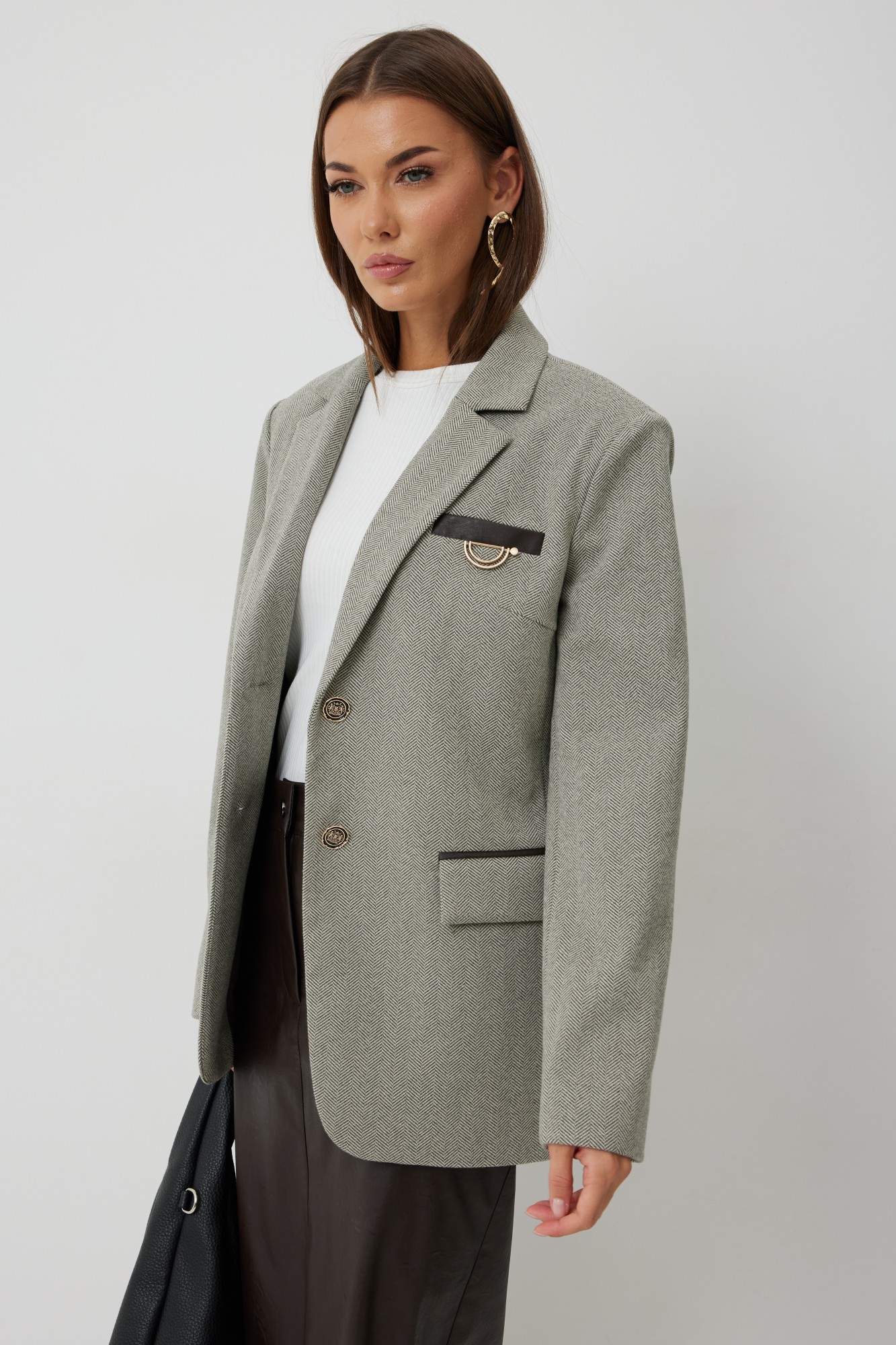 Жакет женский однобортный на подкладке прямого силуэта из трикотажной ткани. На передних частях жакета отрезной бочок с нагрудными вытачками. Обработаны прорезные карманы «в рамку» с клапаном. На левой части переда обработан карман с листочкой и декоративной пришивной деталью. Листочка, рамки кармана и нижний воротник выполнены из искусственной кожи. Спинка со шпицей в среднем шве. Рукав втачной двухшовный. Горловина обработана втачным воротником с отложными лацканами. Низ передних частей имеет закругленную форму.  Жакет застегивается н а 2 декоративный пуговицы.