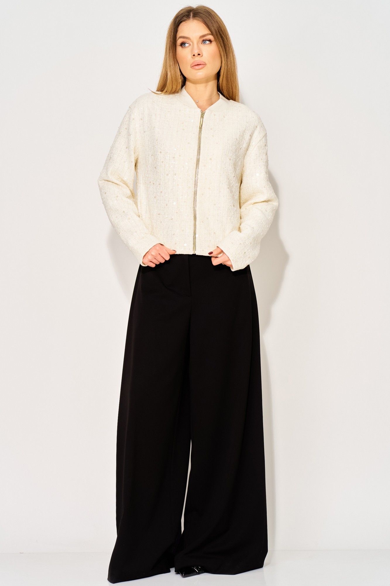 Нарядный жакет от LAIKONY свободного силуэта с пайетками. Жакет длиной до линии бедер с центральной застёжкой на декоративную тесьму-молнию. Вырез горловины «под горло», с втачной стойкой из отделочной ткани. Детали переда с отрезными бочками, в швах обработаны карманы, центральные части с нагрудными вытачками. Деталь спинки блузона с кокеткой, на нижней части по центру в шве обработана складка. Рукава втачные одношовные, линия плеча спущена. Низ жакета обработан обтачкой. Фурнитура может отличаться от представленной на фотографии. В нашем шикарном жакете вы будете блистать на новогоднем корпоративе и любом другом торжественном мероприятии.