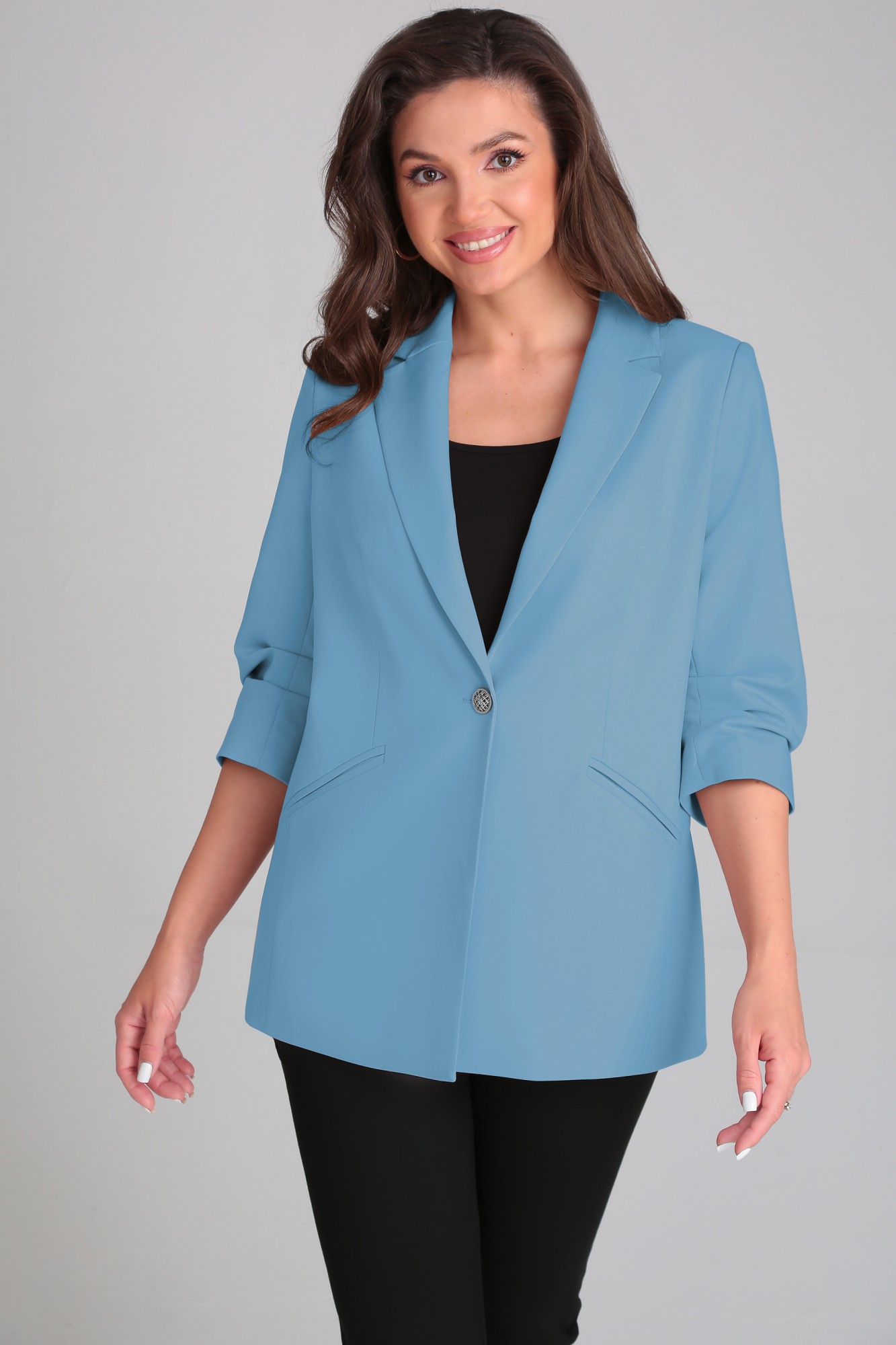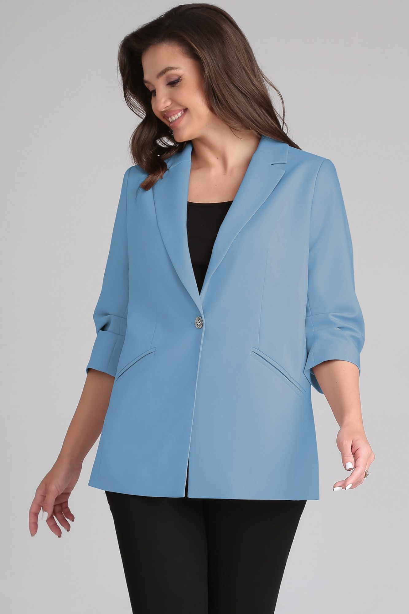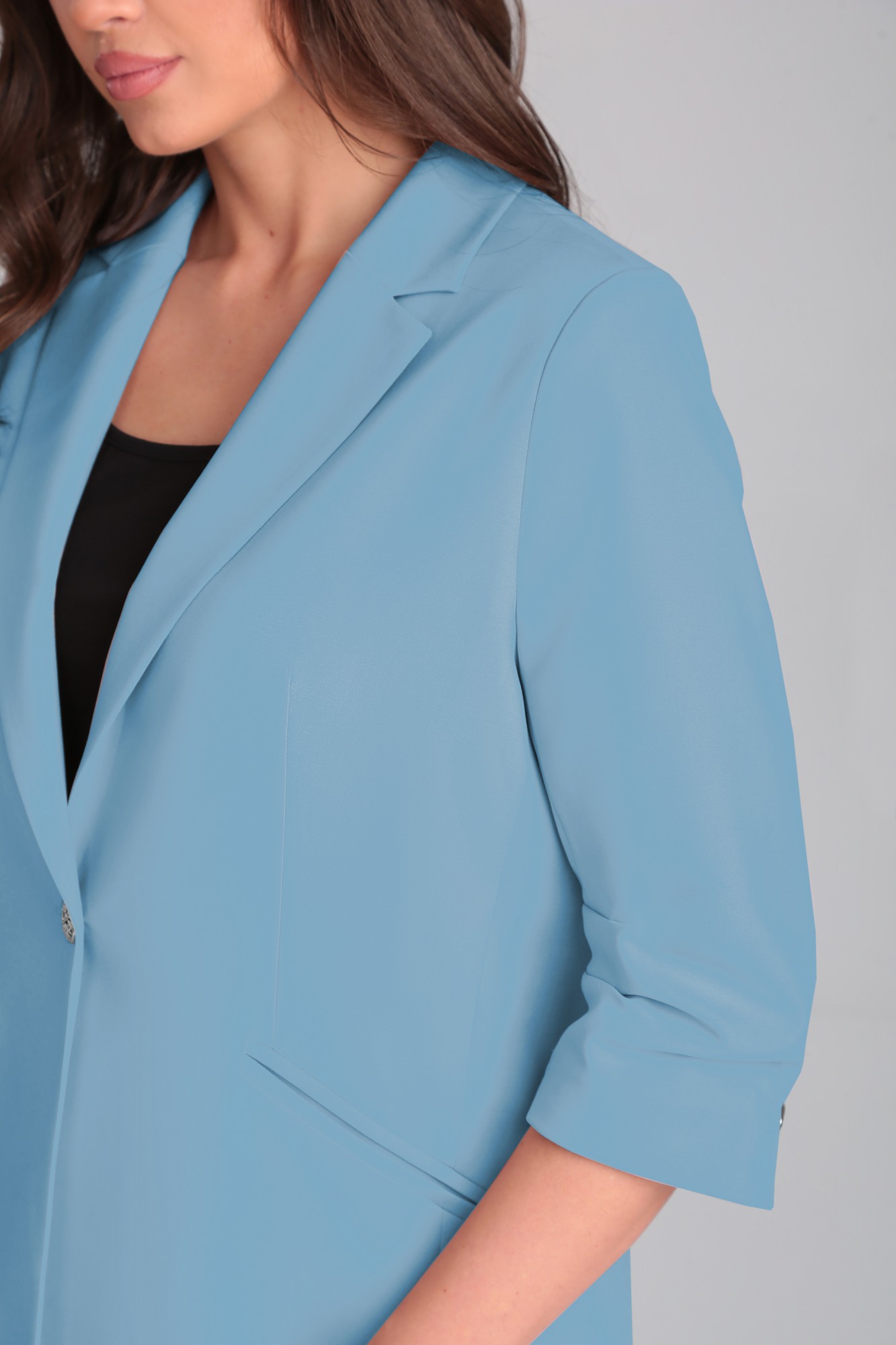 Жакет женский прямого силуэта на стрейчевой, шелковистой подкладке. По переду отрезной бочок, нагрудная вытачка, функциональные карманы в рамку. Спинка со средним швом и рельефами из проймы. Воротник пиджачного типа. Застежка центральная бортовая застегивающаяся на 1 декоративную пуговицу. Рукав втачной, двухшовный, укороченный, со складками по внутреннему шву рукава и короткой шлицей с пуговицей.