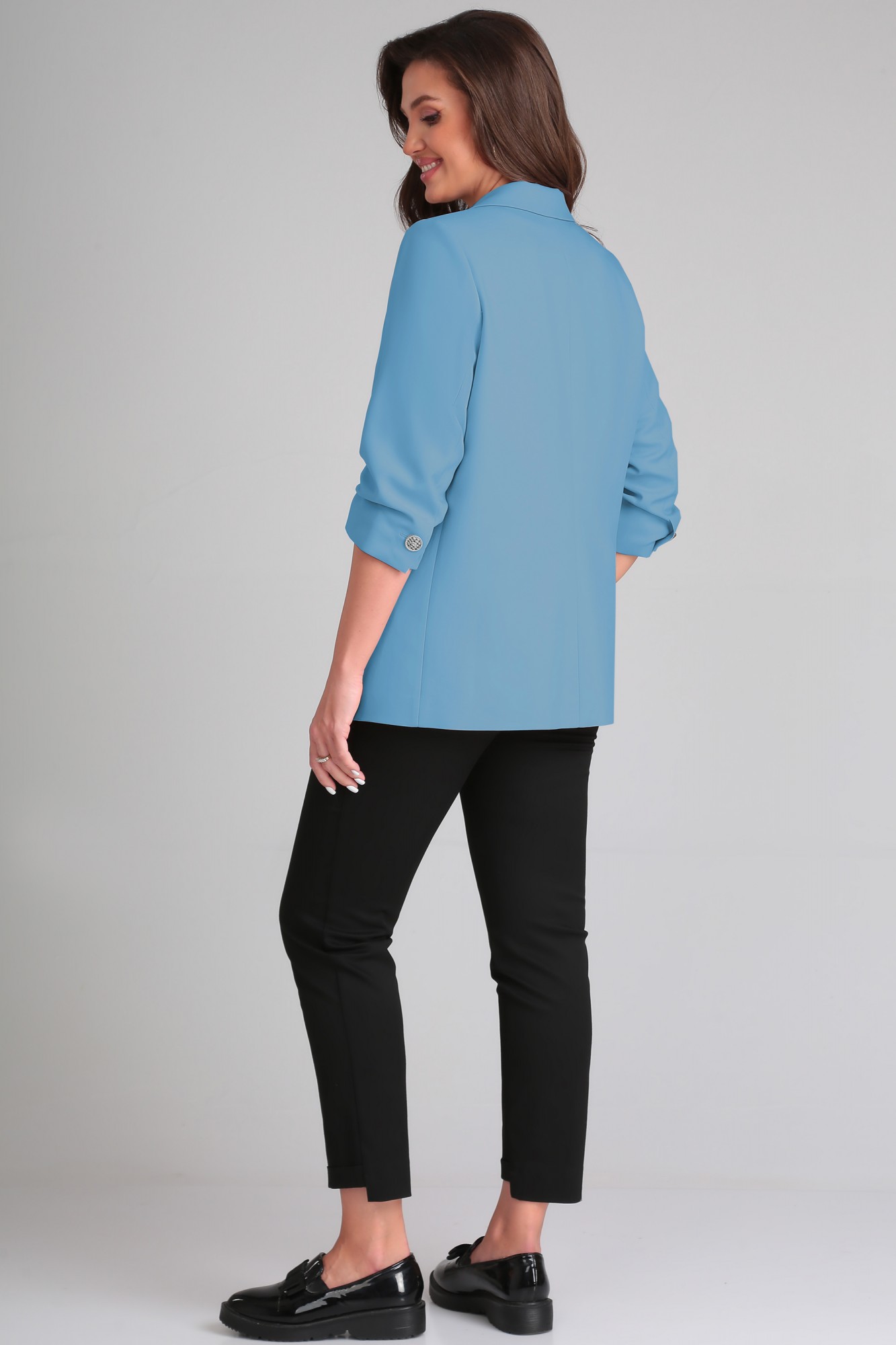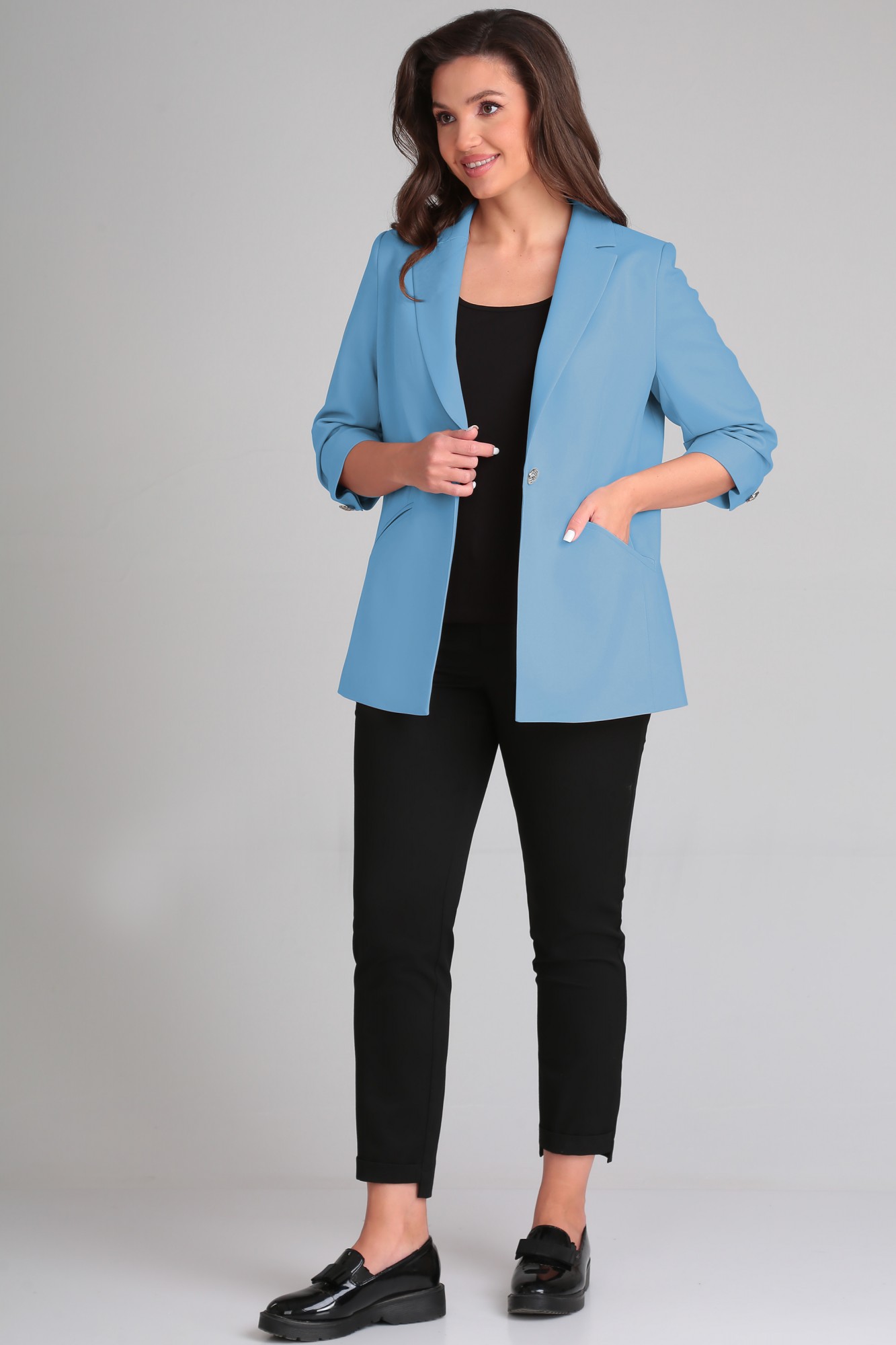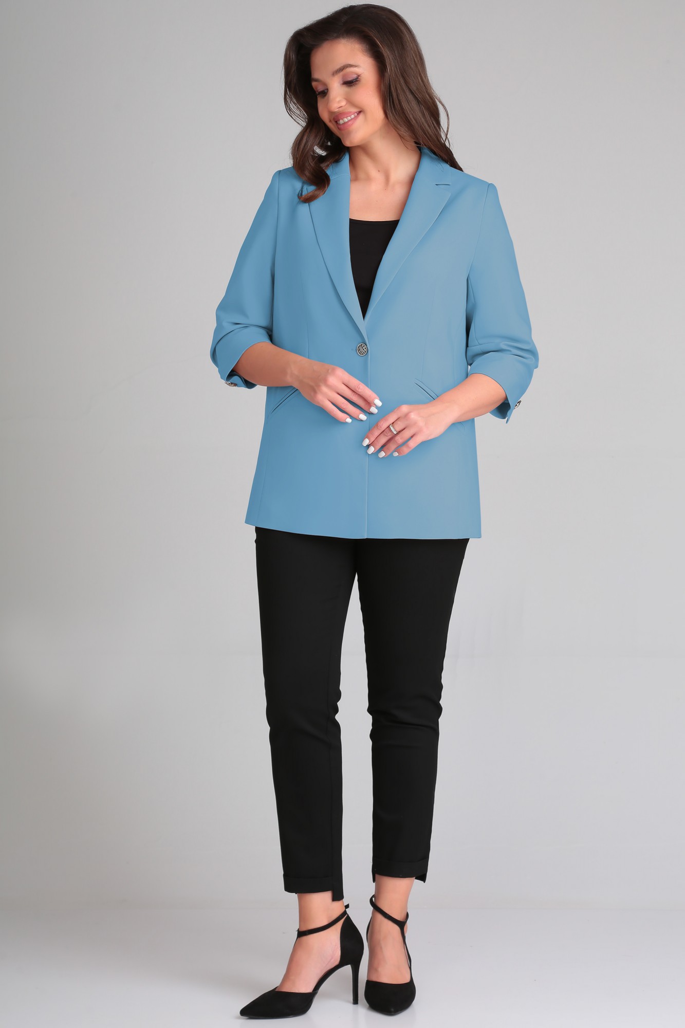 Жакет женский прямого силуэта на стрейчевой, шелковистой подкладке. По переду отрезной бочок, нагрудная вытачка, функциональные карманы в рамку. Спинка со средним швом и рельефами из проймы. Воротник пиджачного типа. Застежка центральная бортовая застегивающаяся на 1 декоративную пуговицу. Рукав втачной, двухшовный, укороченный, со складками по внутреннему шву рукава и короткой шлицей с пуговицей.