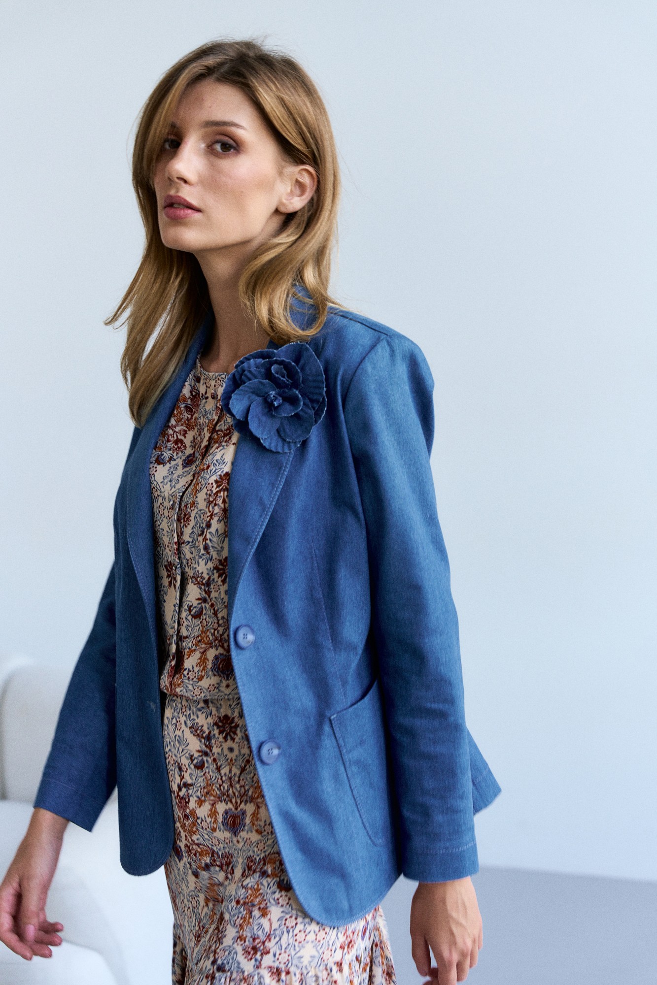 Жакет полуприлегающего силуэта из джинсовой ткани, без подкладки. Перед с декоративными выточками, спинка с рельефами. По переду фигурные функциональные накладные карманы. Воротник пиджачного типа. Застежка центральная бортовая на петли и пуговицы. Рукав втачной двухшовный длинный с декоративной шлицей застегивающаяся на петли и пуговицы. Внутренние швы жакета окантованы тканью с рисунком.