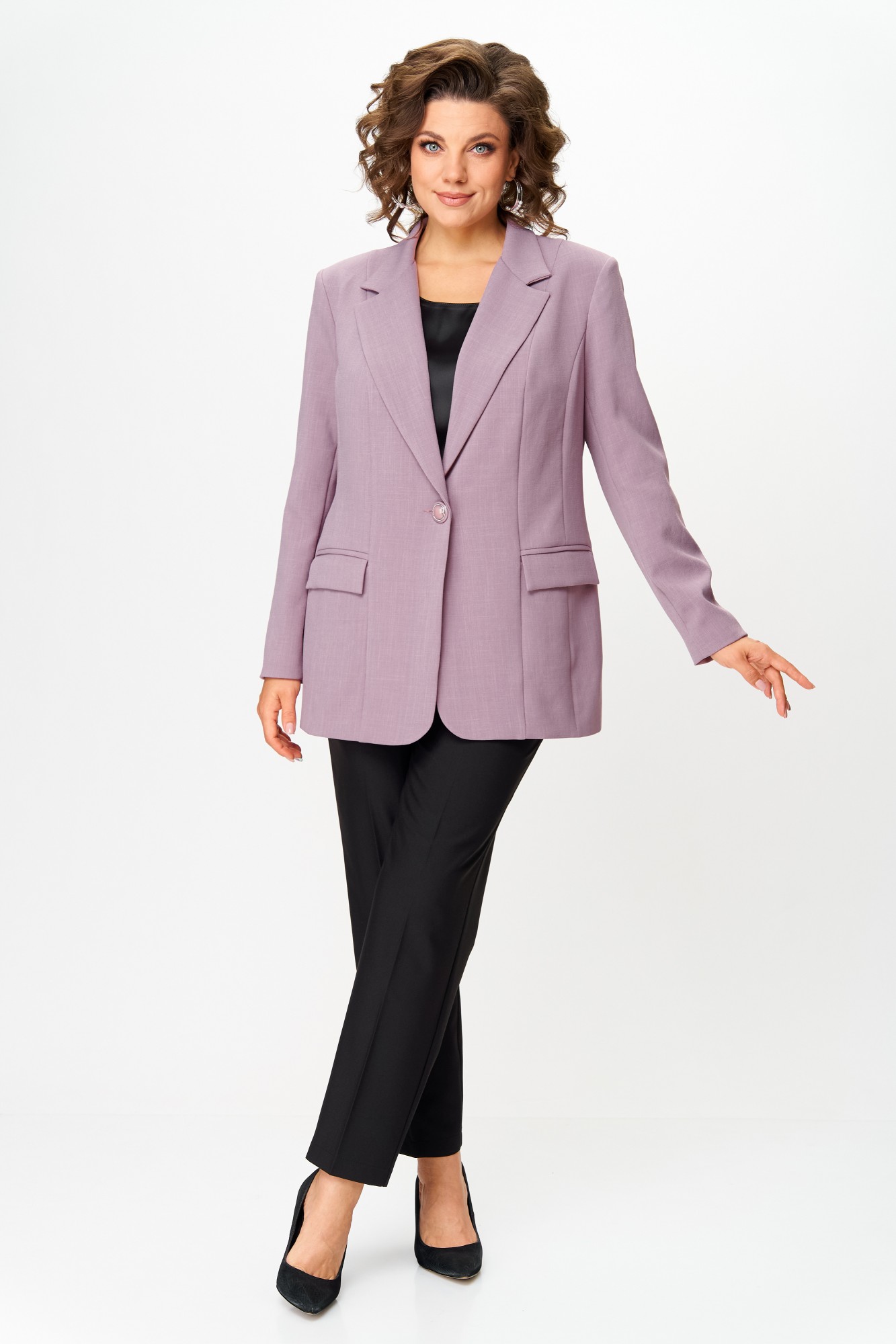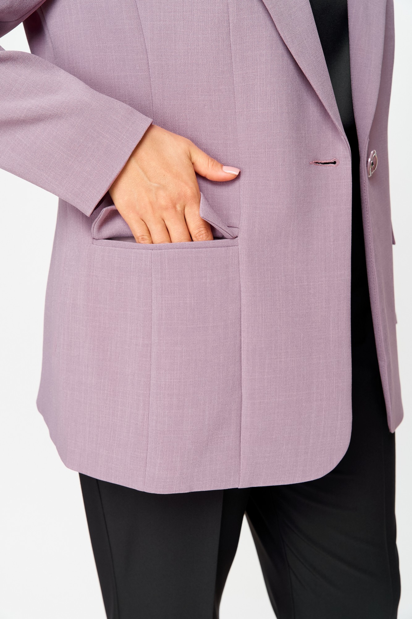 Жакет прямого силуэта, выполнен из однотонной ткани, жакет на подкладке. Полочка жакета с центральной застежкой на петлю пуговицу. Полочка с вертикальными рельефами и прорезными карманами с клапанами. Горловина V-образной формы с отложными лацканами и воротником пиджачного типа. Спинка со средним швом и вертикальными рельефами. Рукав втачной, двухшовный. Жакет на плечиках.