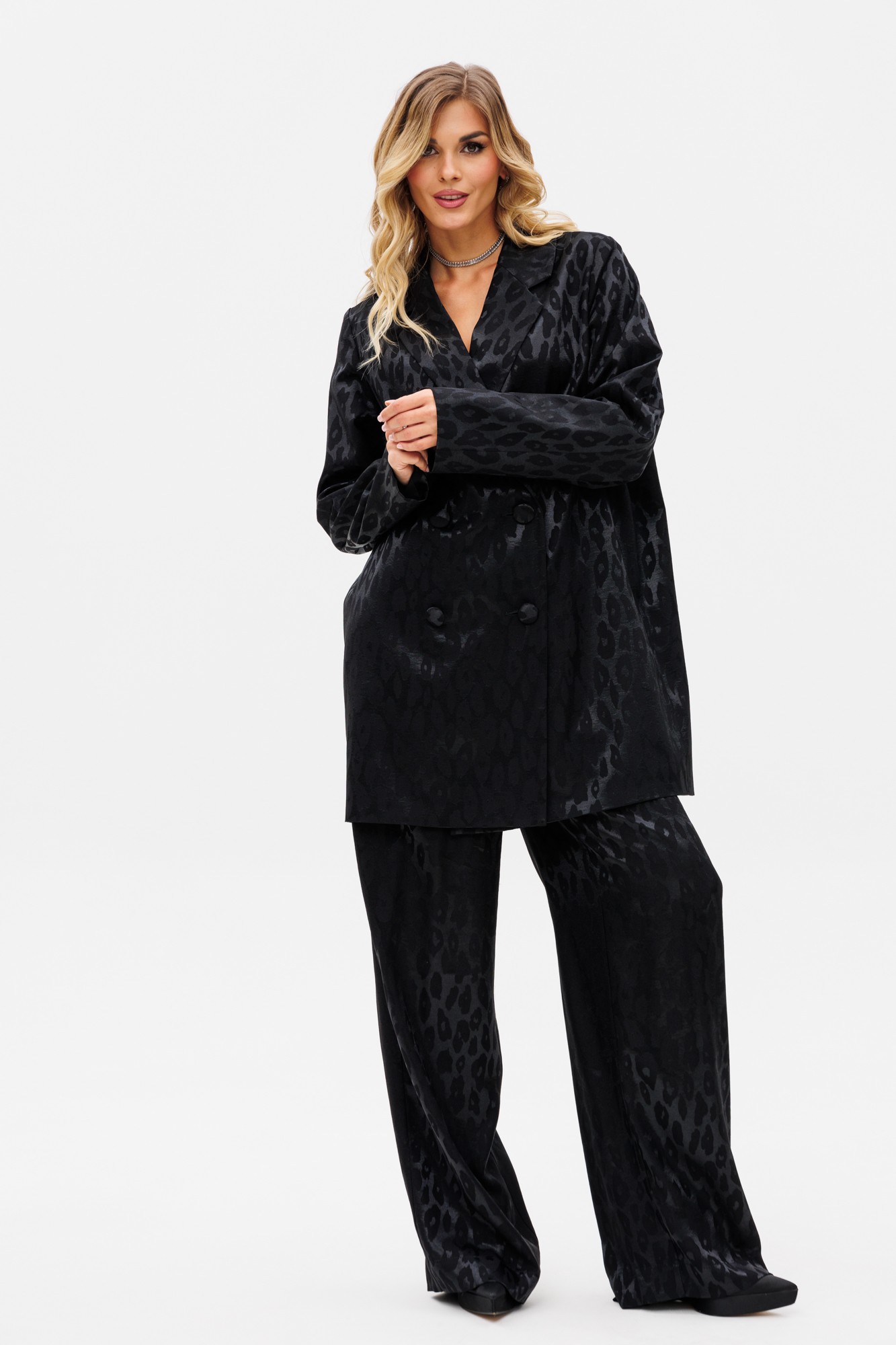 Жакет выполнен из костюмно-плательной ткани с анималистичным принтом. Жакет прямого силуэта , длиной ниже линии бедер. Спереди лацканы и двубортная застежка на пуговицы. Спинка цельная. Горловина пиджачного типа. Рукав втачной, двухшовный. Жакет на притачной по низу подкладке.