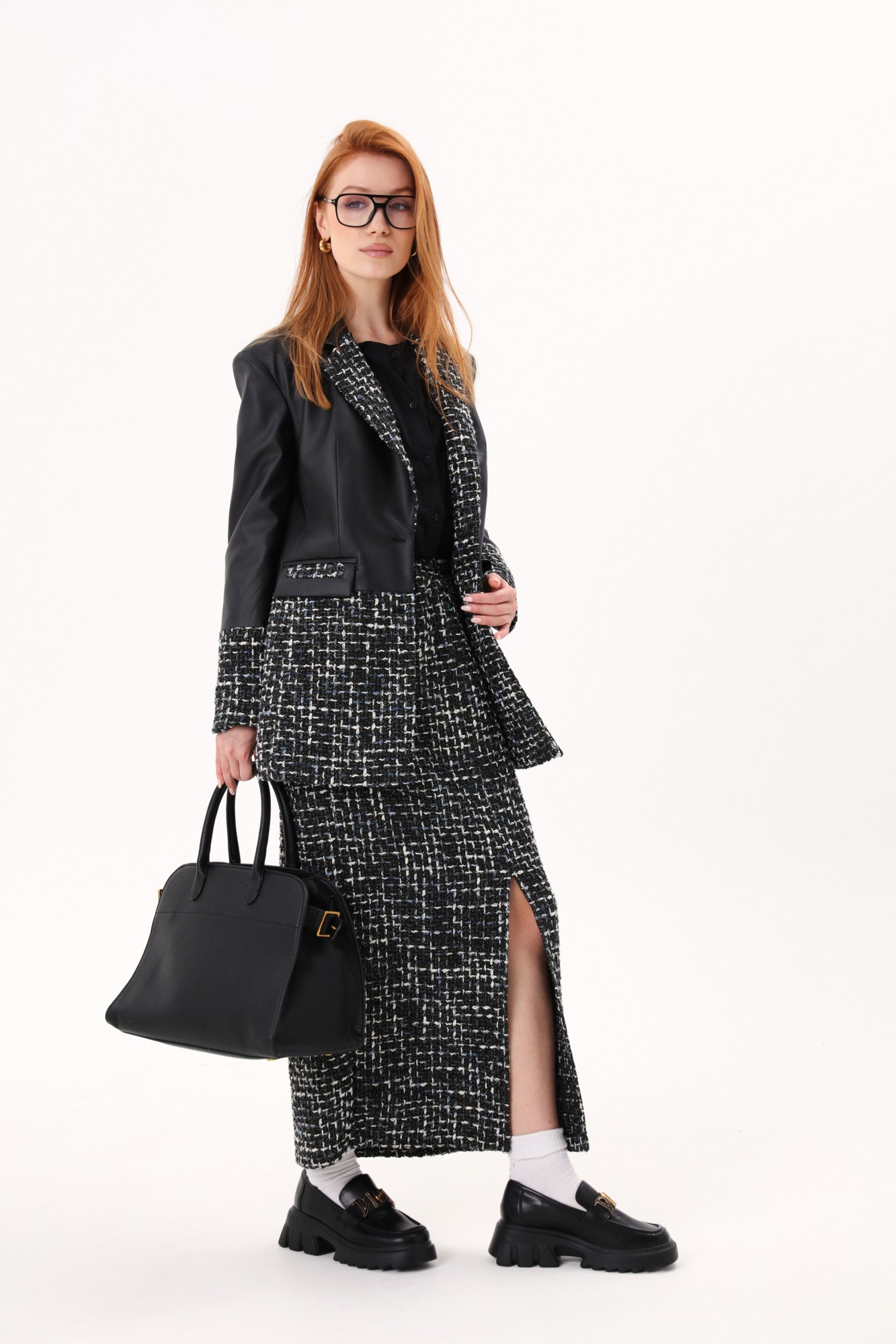 Жакет однобортный из комбинированной ткани: шанель и экокожа. Изделие полуприлегающего силуэта, длиной ниже линии бедер. Рукав втачной, двухшовный. Воротник английский. На переде прорезные карманы в рамку с клапаном. Застежка центральная на петли и пуговицы. В среднем шве спинки шлица.