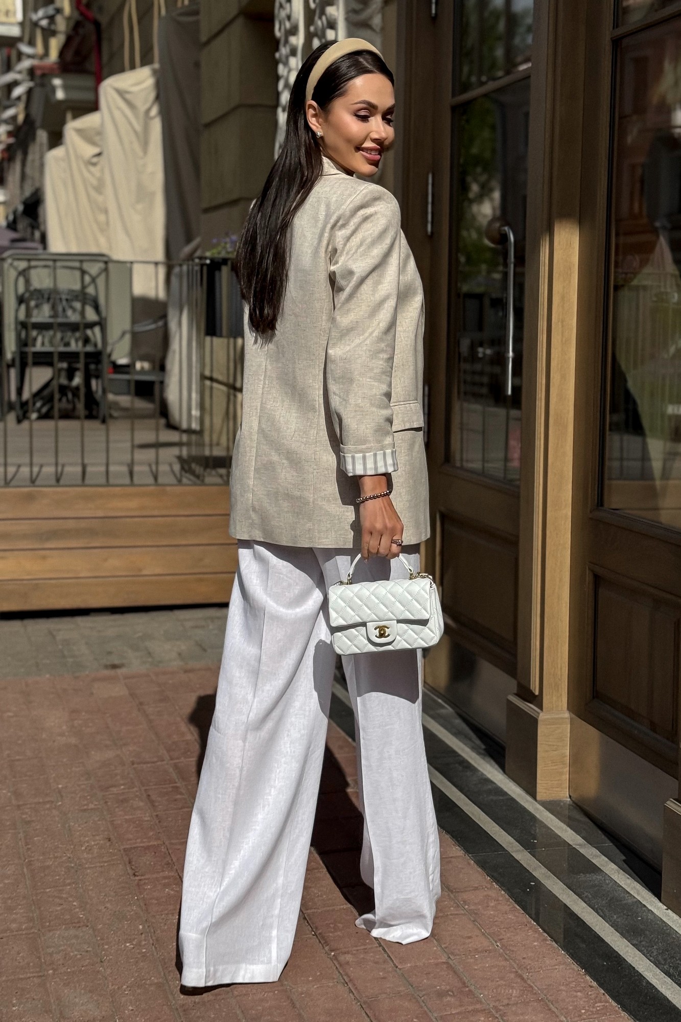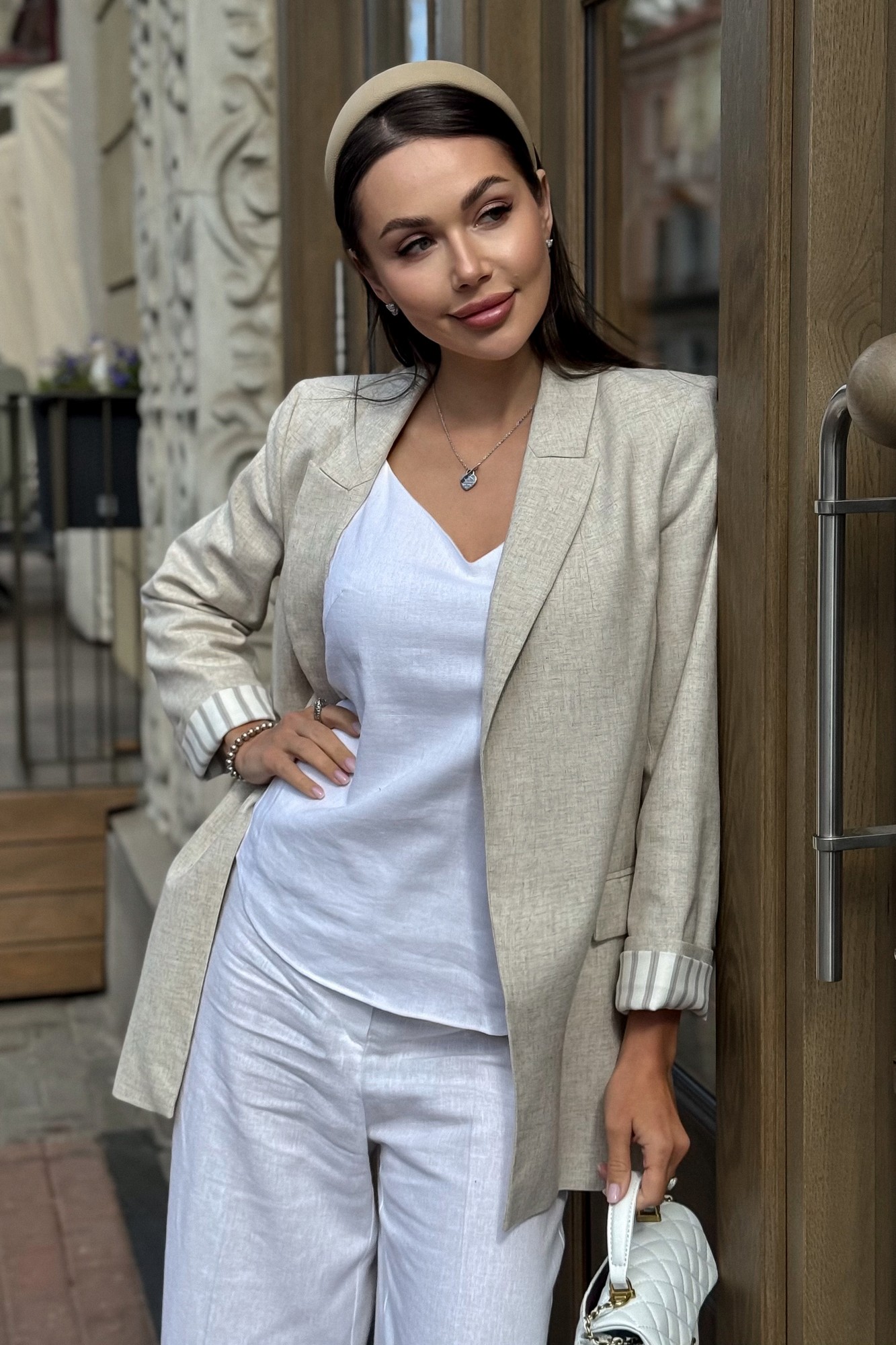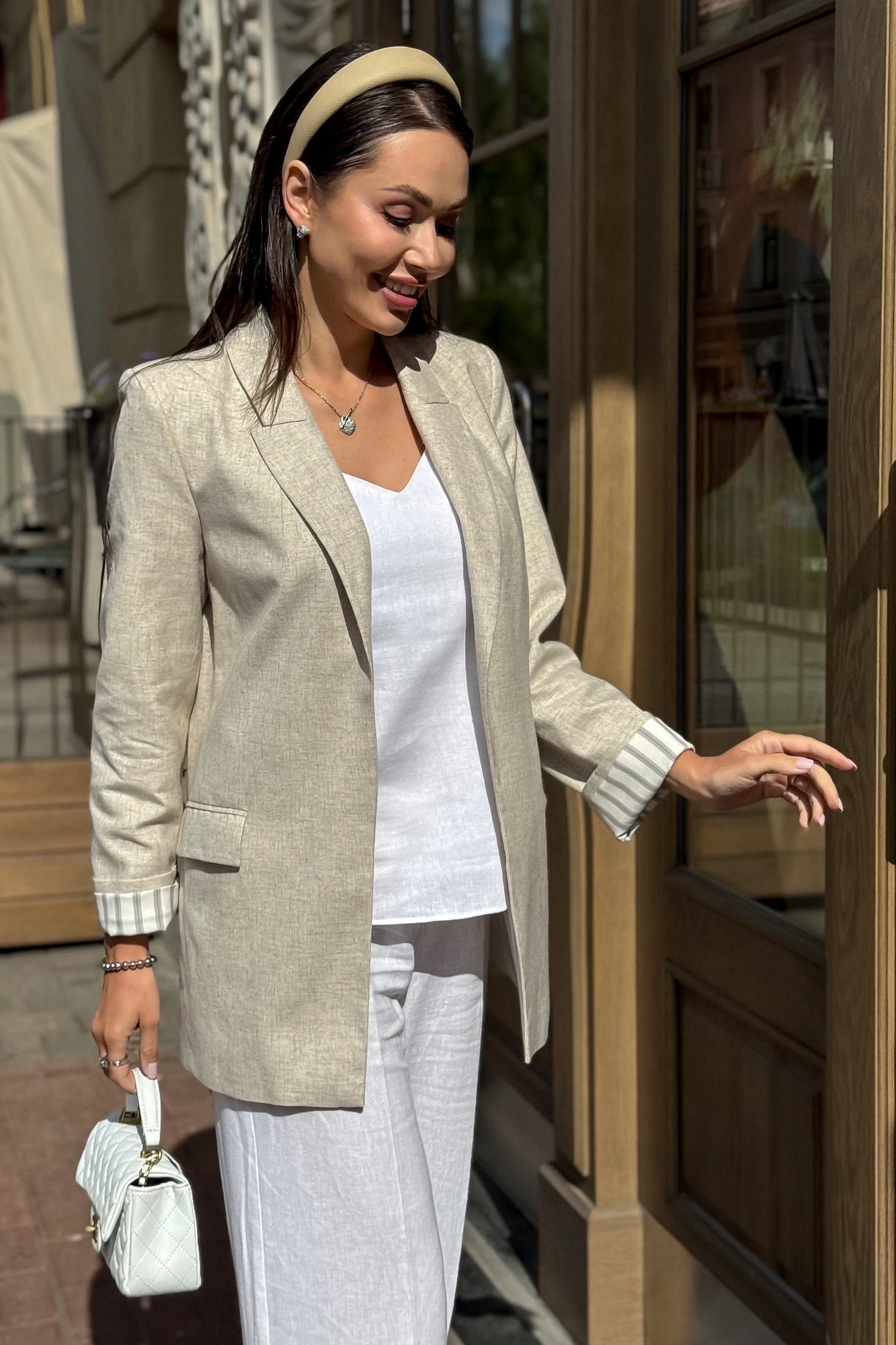 Длина жакета по среднему шву спинки – 73,0 см (±1,5см), Ширина жакета на уровне глубины проймы – 52,5 см (±1,0 см), Ширина жакета на уровне линии талии – 49,5 см (±1,0 см), Ширина жакета на уровне линии бедер – 55,0 см (±1,0 см), Длина рукава жакета с манжетой – 60,5см (±1,5 см), Ширина рукава жакета вверху – 18,5 см (±1,0 см), Ширина рукава внизу - 15,0 см (±0,5 см), Длина плеча жакета – 11,7 см (±0,5 см).