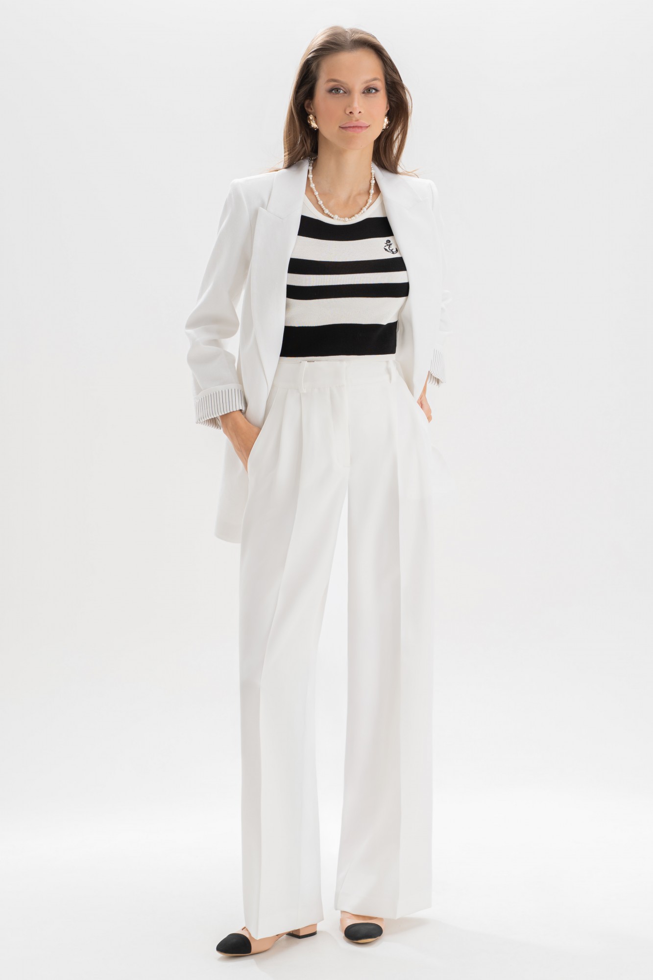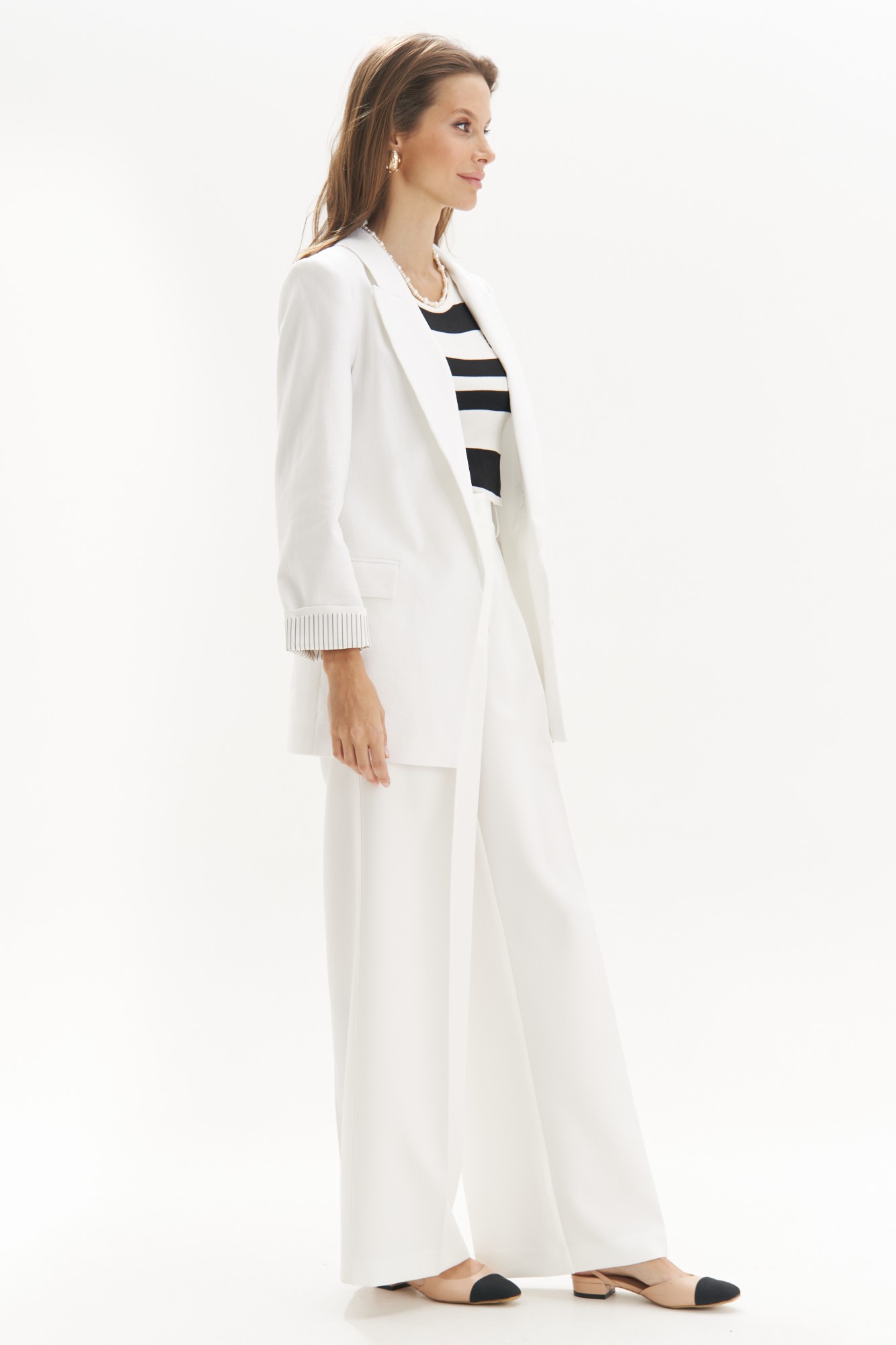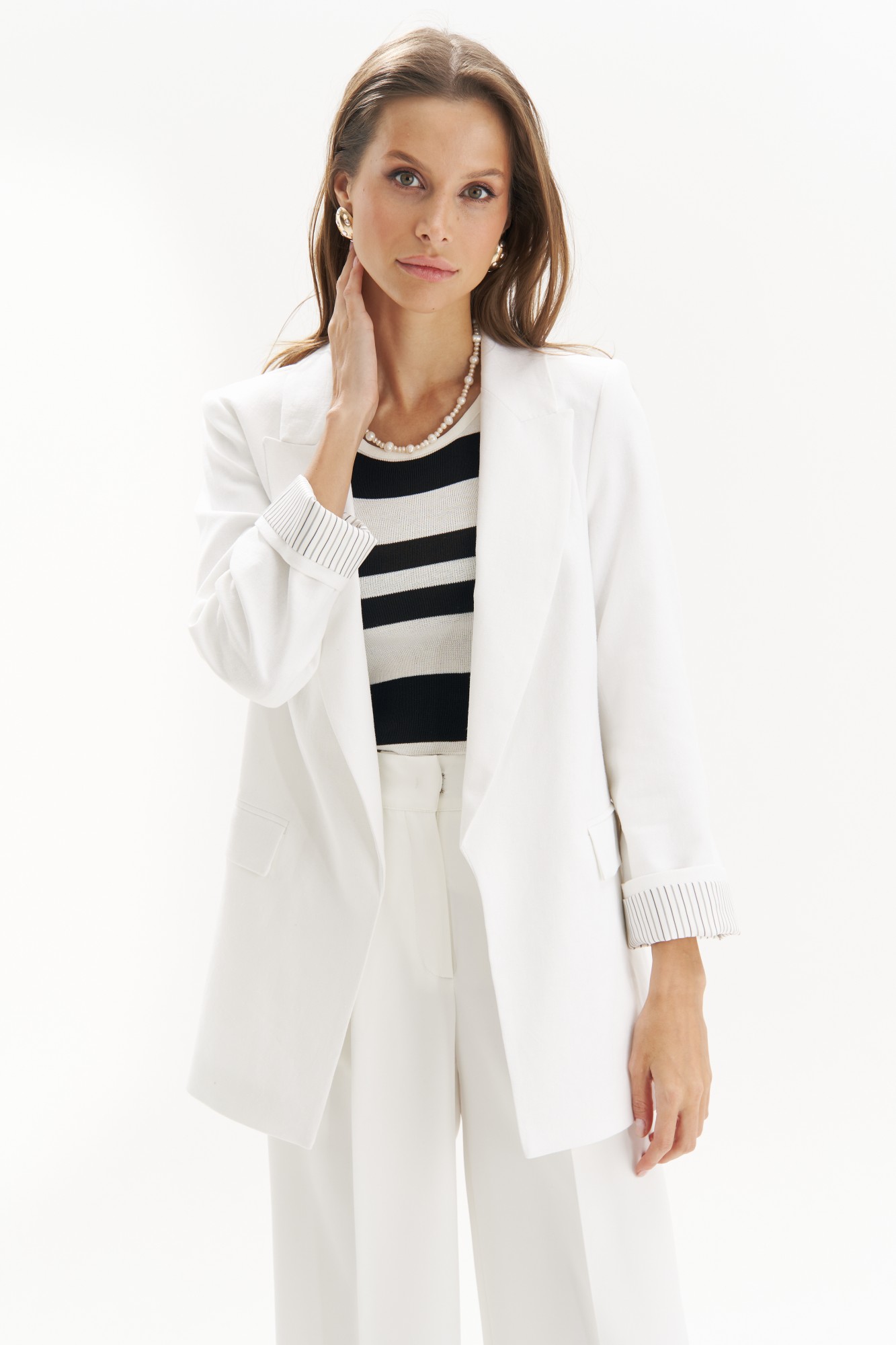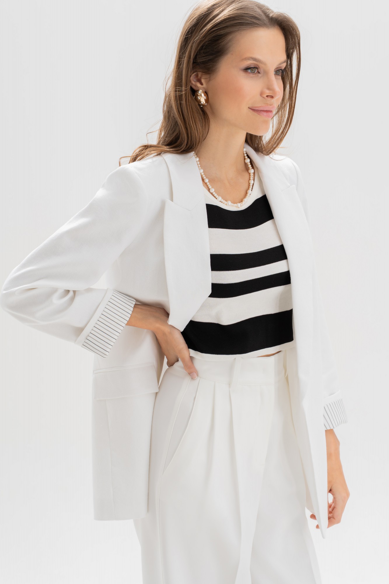 Длина жакета по среднему шву спинки – 73,0 см (±1,5см), Ширина жакета на уровне глубины проймы – 52,5 см (±1,0 см), Ширина жакета на уровне линии талии – 49,5 см (±1,0 см), Ширина жакета на уровне линии бедер – 55,0 см (±1,0 см), Длина рукава жакета с манжетой – 60,5см (±1,5 см), Ширина рукава жакета вверху – 18,5 см (±1,0 см), Ширина рукава внизу - 15,0 см (±0,5 см), Длина плеча жакета – 11,7 см (±0,5 см).