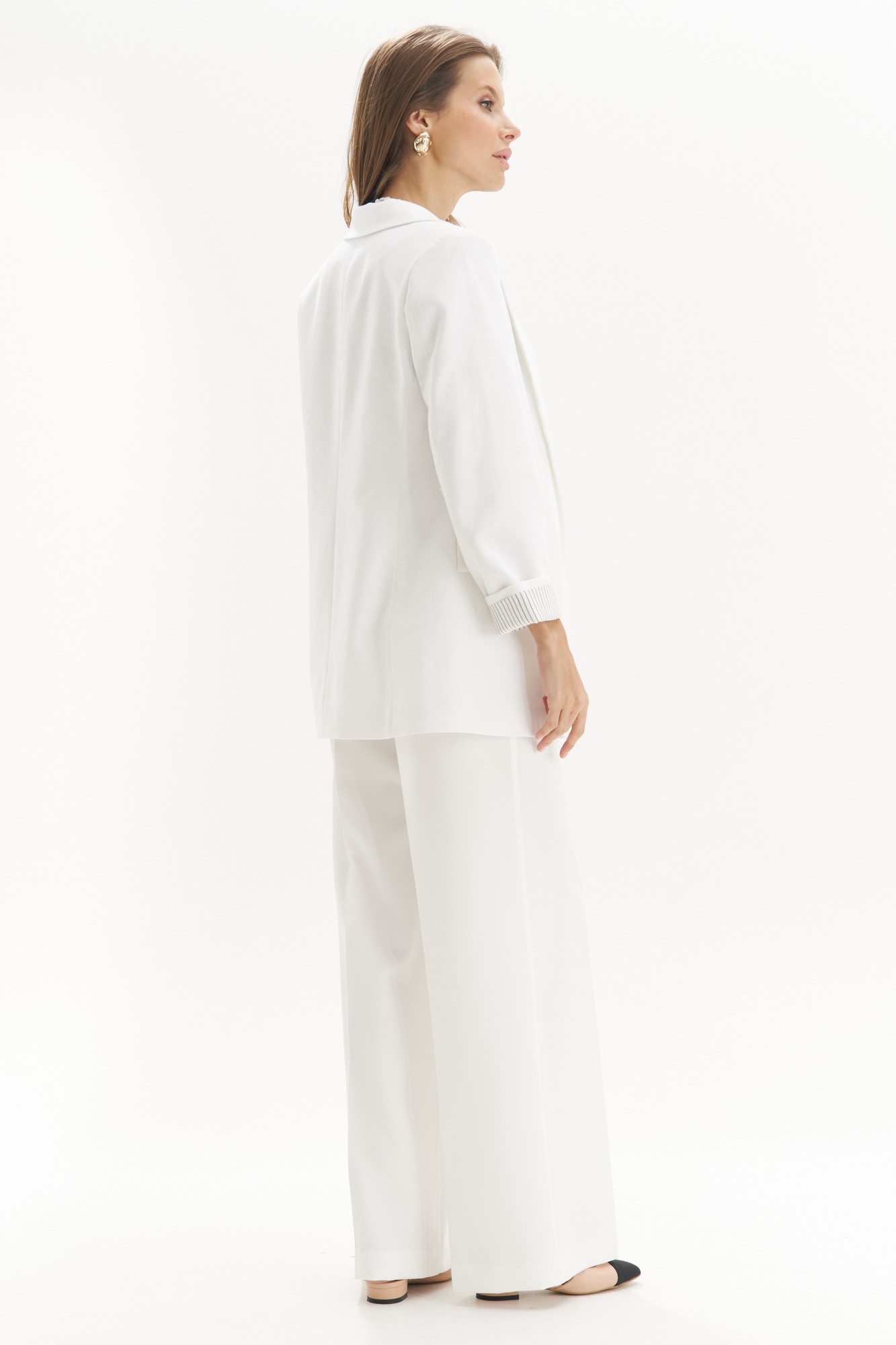 Длина жакета по среднему шву спинки – 75,5 см (±1,5см), Ширина жакета на уровне глубины проймы – 56,5 см (±1,0 см), Ширина жакета на уровне линии талии – 53,5 см (±1,0 см), Ширина жакета на уровне линии бедер –58,5 см (±1,0 см), Длина рукава жакета с манжетой – 60,5 см (±1,5 см), Ширина рукава жакета вверху – 20,0 см (±1,0 см), Ширина рукава внизу - 15,5 см (±0,5 см), Длина плеча жакета – 11,5 см (±0,5 см).