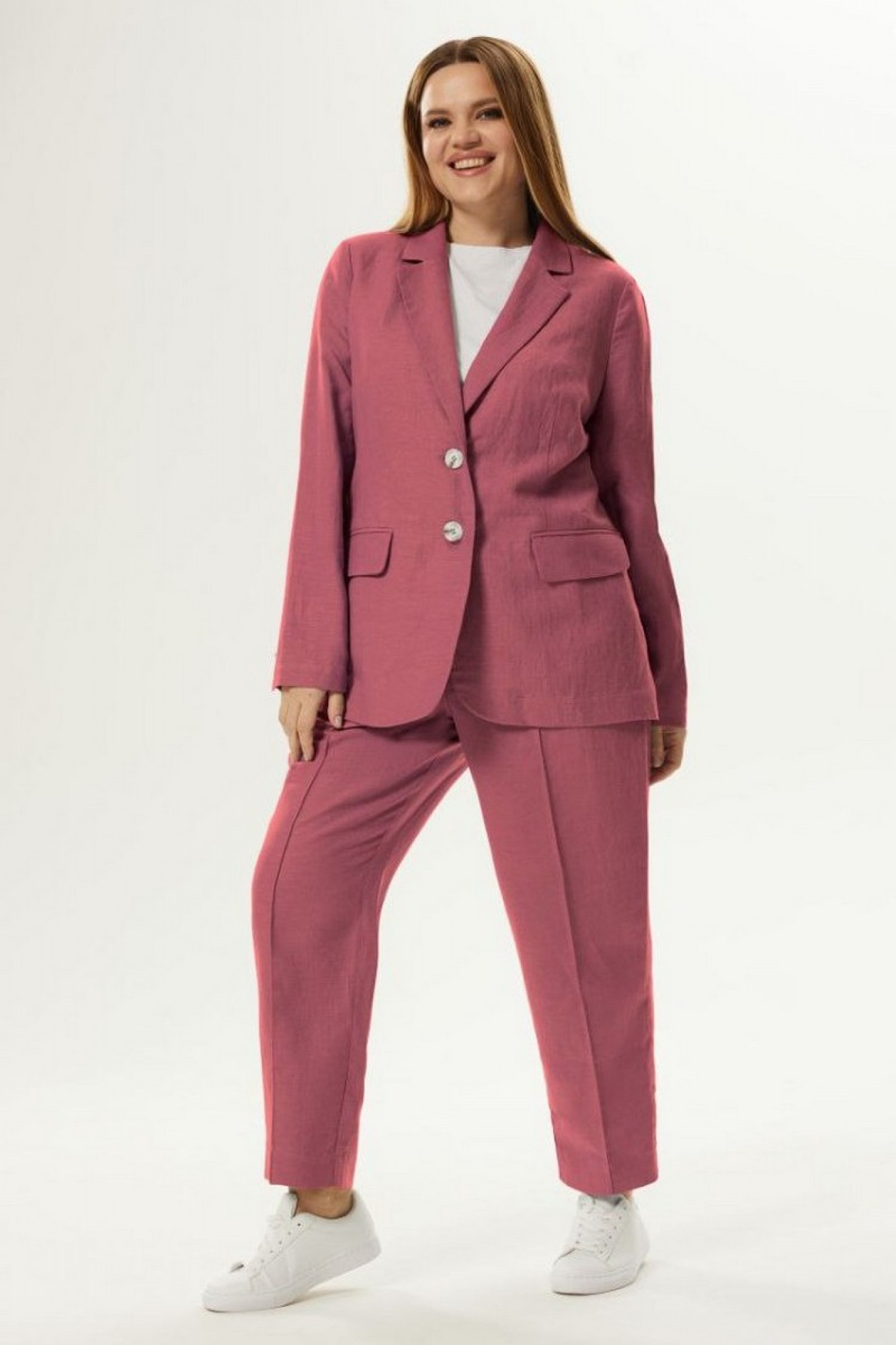 "Льняной жакет полуприлегающего силуэта, однобортный, застежка на две петли и пуговицы. Воротник пиджачного типа. На полочке расположены прорезные карманы. Спинка с центральным швом и шлицей внизу. Рукав втачной двухшовный, внизу рукава шлица с пуговицей. Жакет без подкладки.
