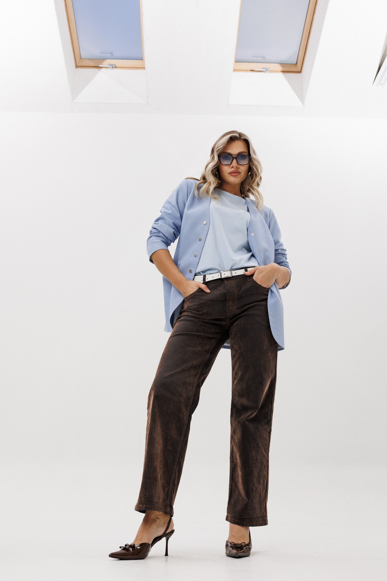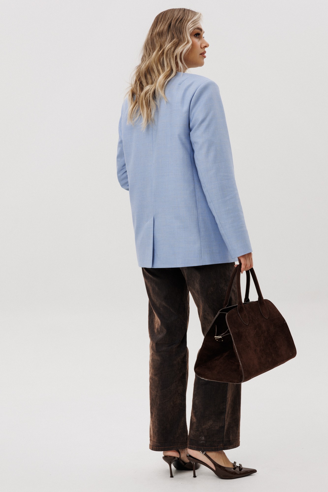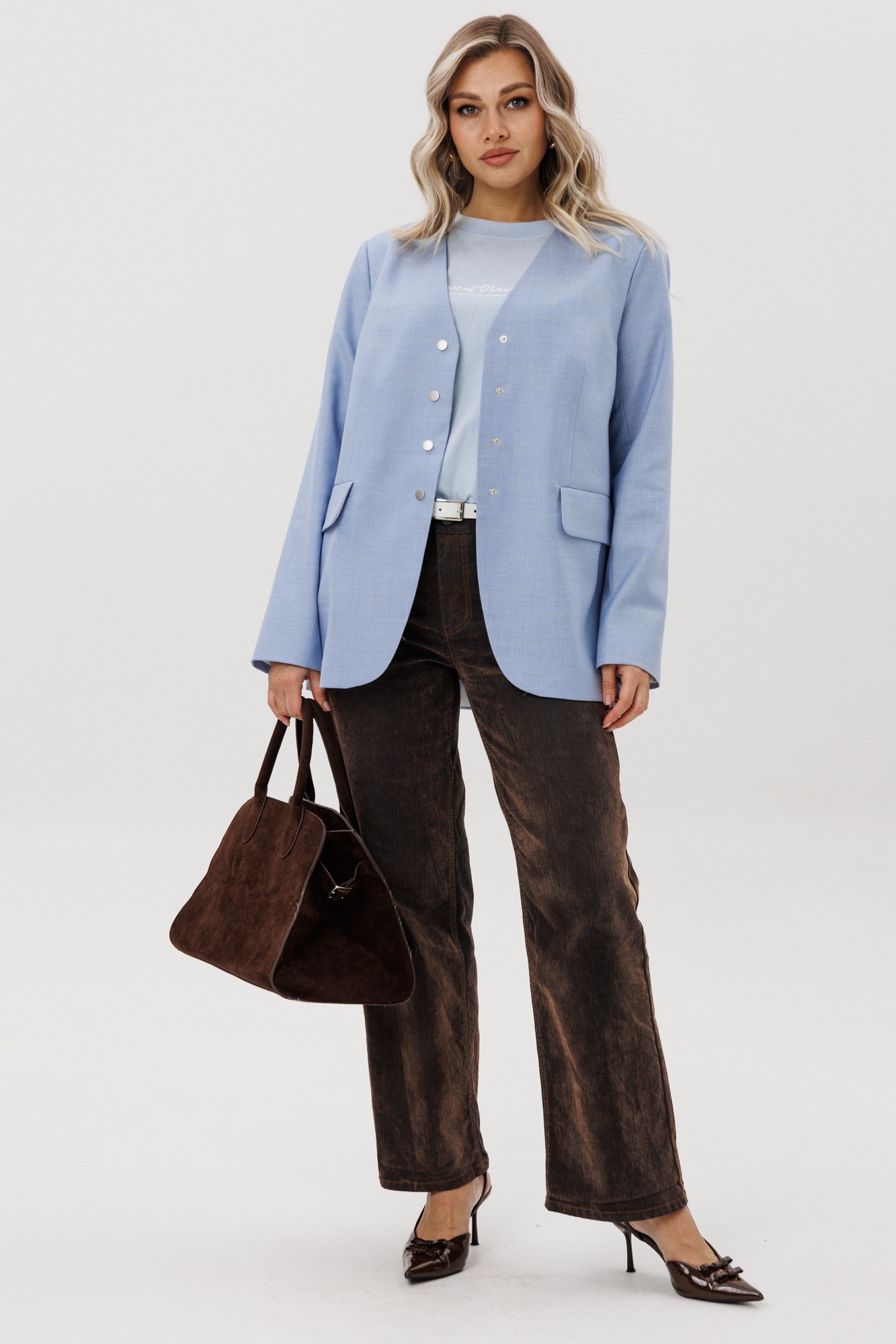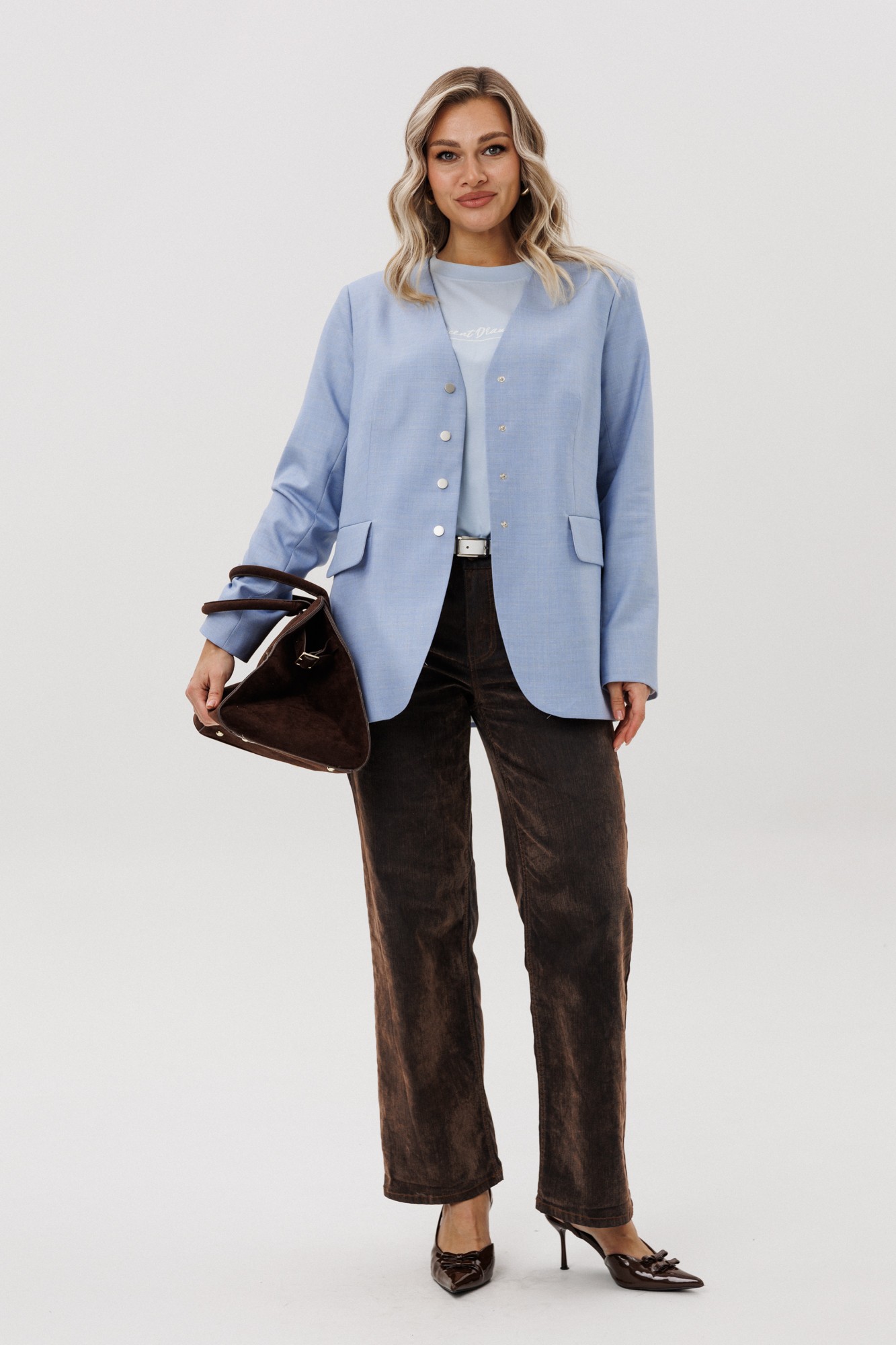 Жакет из полушерстяной ткани прямого силуэта ,без воротника на подкладке. Рукав втачной. По переду обработаны карманы с клапаном. Застежка на кнопки.