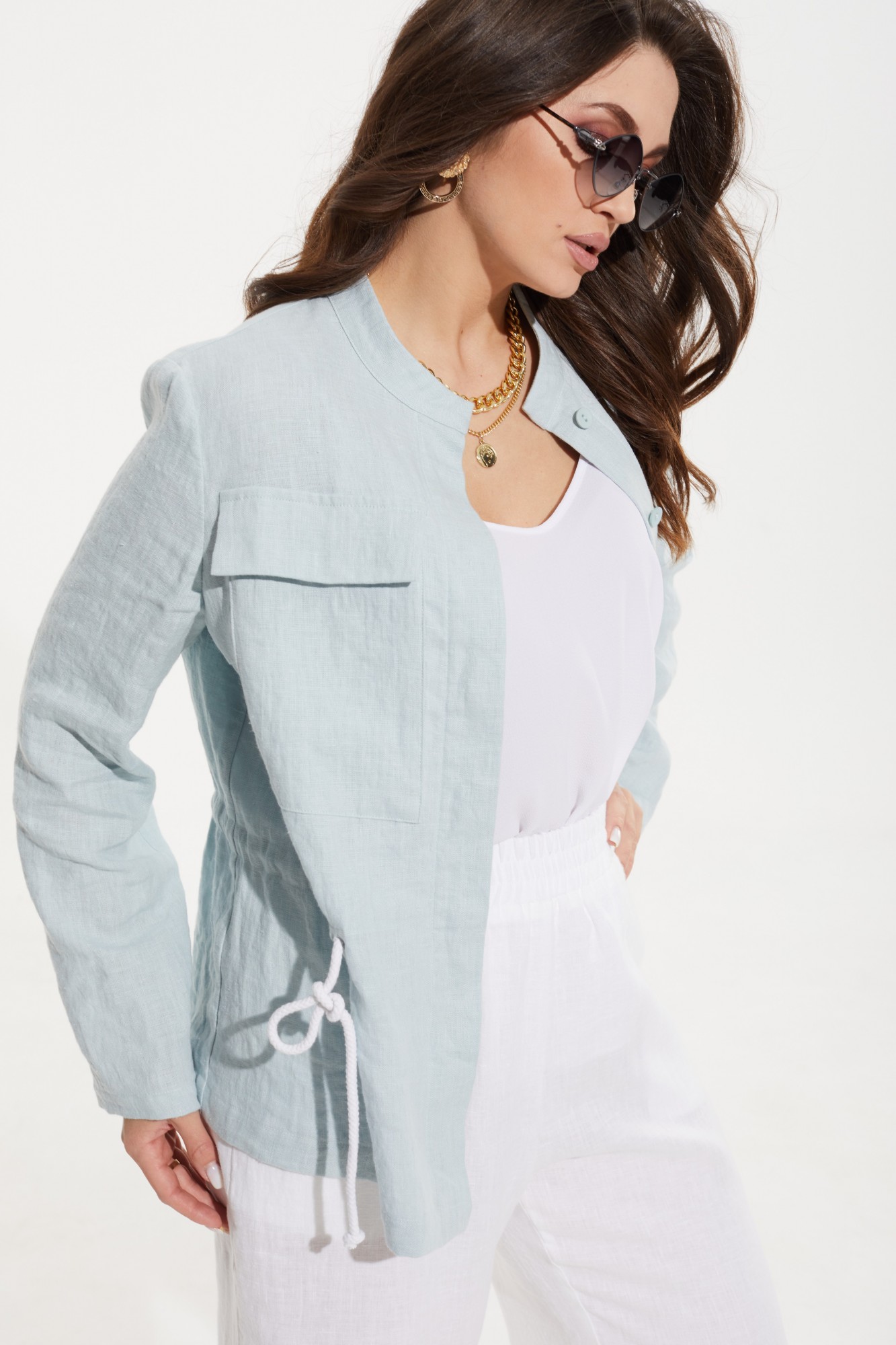 Женский льняной жакет прямого силуэта на центральной застѐжке на потайную планку, застѐгивающийся на петли и пуговицы. Горловина округлой формы на стойке. Перед с нагрудными вытачками, выходящими из боковых швов, накладными карманами с клапанами в области груди. Спинка со средним швом. По талии кулиска, в которую втянут декоративный шнур. Рукав втачной одношовный, длинный.