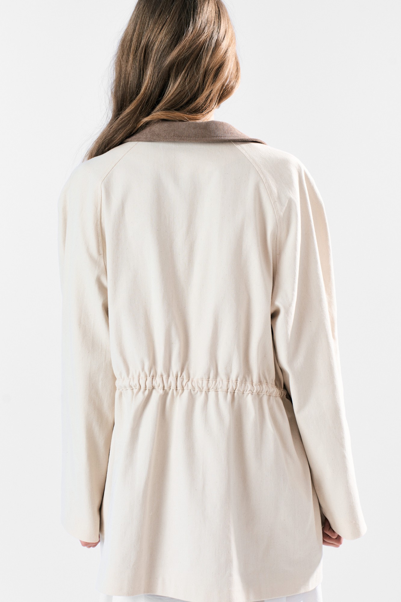Жакет-парка прямого силуэта с застежкой на пуговицы. По переду накладные карманы типа “портфель” с клапанами. Воротник стояче-отложной . Рука-реглан длинный. По талии шнур для регулировки объема. Отделочная строчка по деталям.