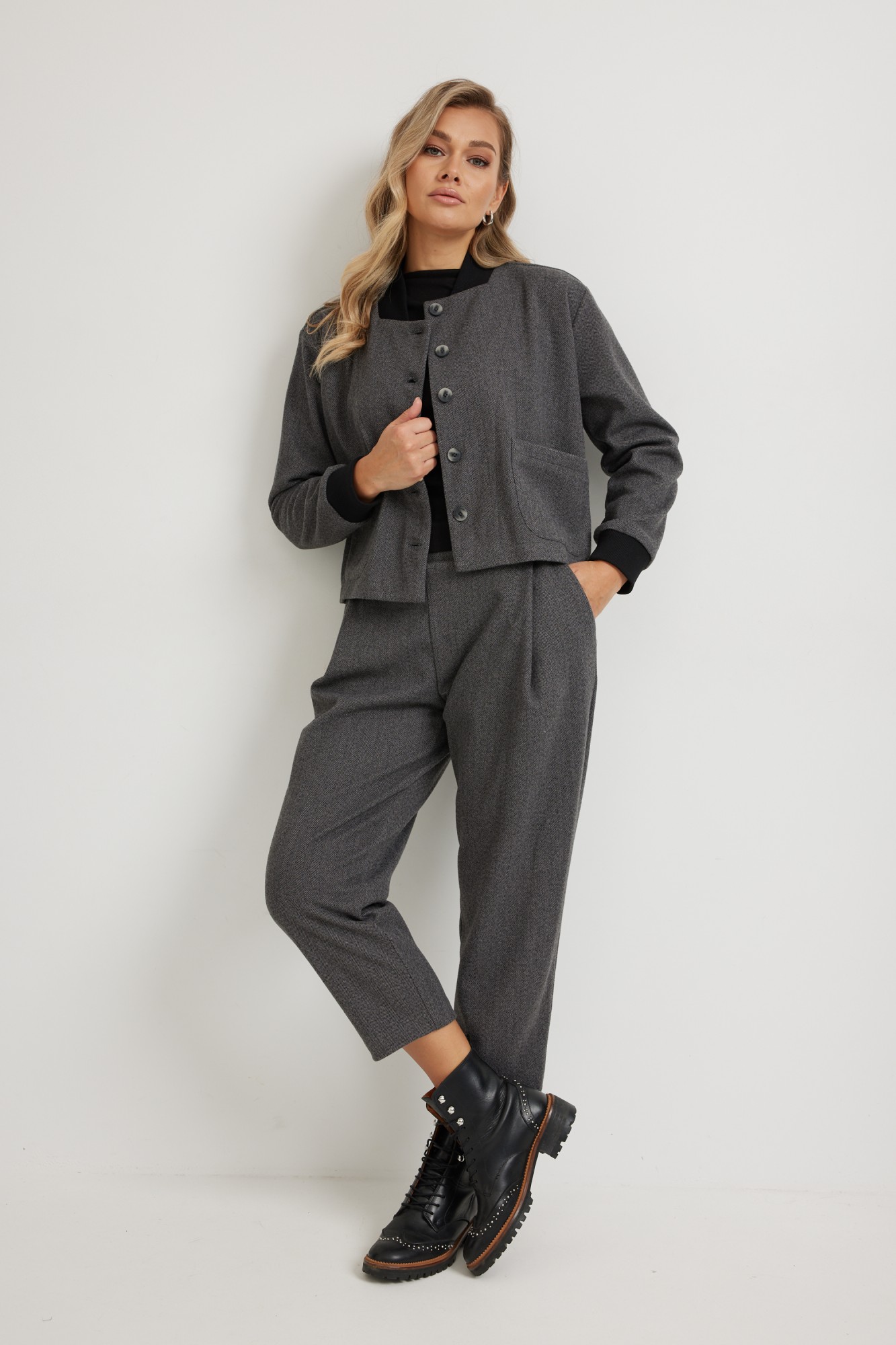 Женский Блузон осенне- зимнего ассортимента от белорусского производителя  из мягкой приятной ткани в рисунок "ёлочка". Застежка центральная на петли и декоративные пуговицы, по горловине воротник-стойка. По полочкам обработан функциональный накладной карман. Линия плеча чуть спущена, рукав втачной, низ рукава обработан притачной манжетой. Хорошо сочетается в комплекте с юбкой м 1263 серая "ёлочка" и Брюками м951 серая "ёлочка", 1275 серая "ёлочка". Для выбора нужного размера воспользуйтесь размерной сеткой (таблица).