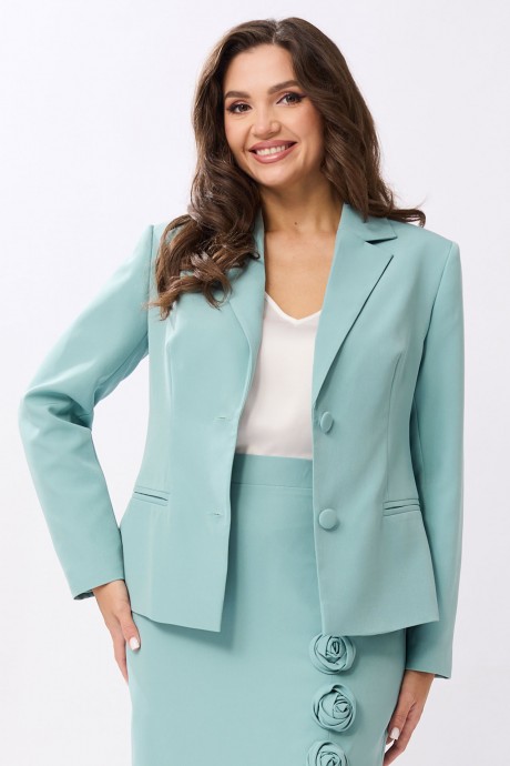 Жакет полуприлегающего силуэта, спинка со средним швом, заканчивающимся шлицей. По конструкции предусмотрен воротник с лацканами. Застежка на две пуговицы. В передней части предусмотрены два прорезных кармана с листочкой. Рукава втачные, двухшовные, со шлицей на пуговицах. Юбка длиной миди, слегка зауженная к низу. Застежка на молнию в центральном шве.