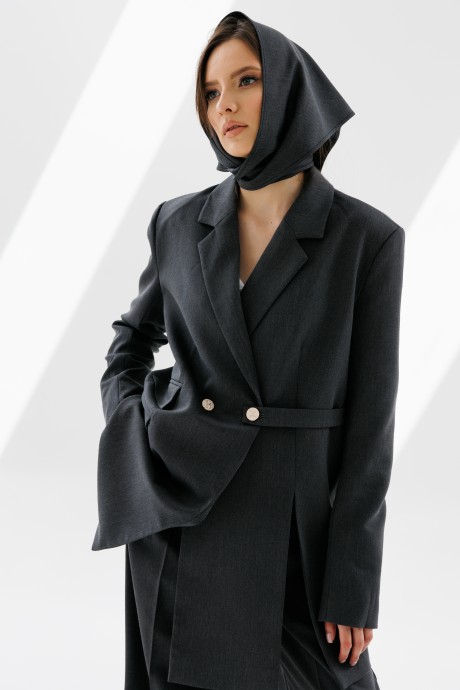 Жакет двубортный прямого силуэта свободного объёма. Изделие на подкладке. Линия плеча немного расширена. Боковой шов отсутствует, смоделирован бочок. Детали переда с двумя вытачками. Первая вытачка из горловины переда располагается под лацканом. Вторая вытачка образована за счет объединения нагрудной вытачки с талиевой. Деталь правого переда с двумя прорезными карманами с клапаном, которые располагаются один над другим. Вытачка заканчивается подрезом по линии входа нижнего кармана. На детали левого переда вытачка переведена в линию низа, заканчивается разрезом. В рельефный шов на уровне талии вставлен пояс с петлей. Рукав втачной двухшовный. Воротник английский с отрезной стойкой.