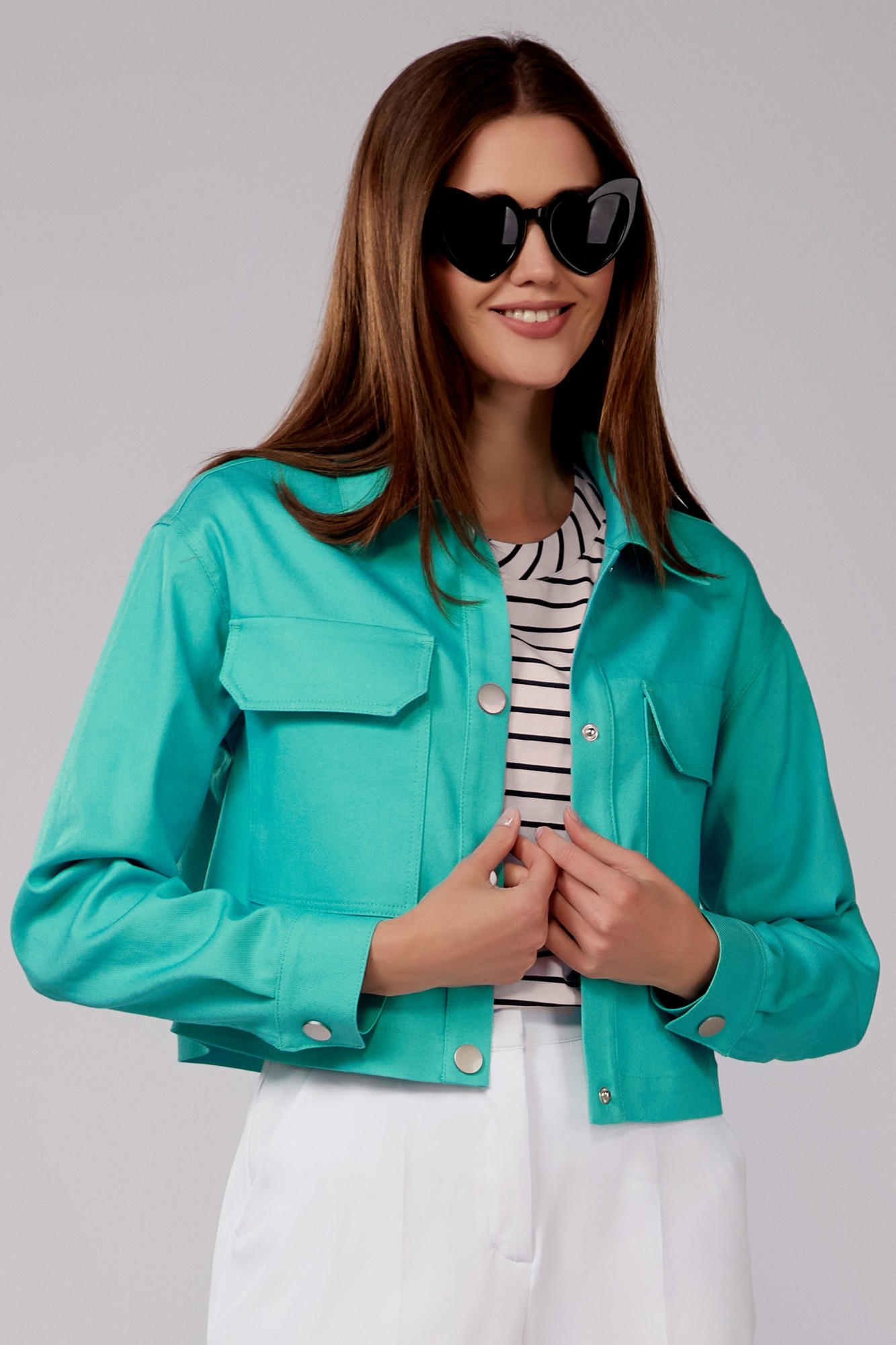 Жакет из джинсовой облегченной ткани свободного силуэта, с втачными рукавами, с втачным воротником, с центральной сквозной застежкой на 4 кнопки. На деталях переда жакета расположены накладные карманы с клапанами. Детали с притачными планками. Деталь спинки жакета с отрезной кокеткой. Рукава втачные двухшовные, с притачными манжетами, манжеты с застежкой на 1 кнопку. По швам притачивания манжет закладываются по 2 складки, в локтевом шве обработан разрез. Воротник сорочечный с цельнокроеной стойкой.