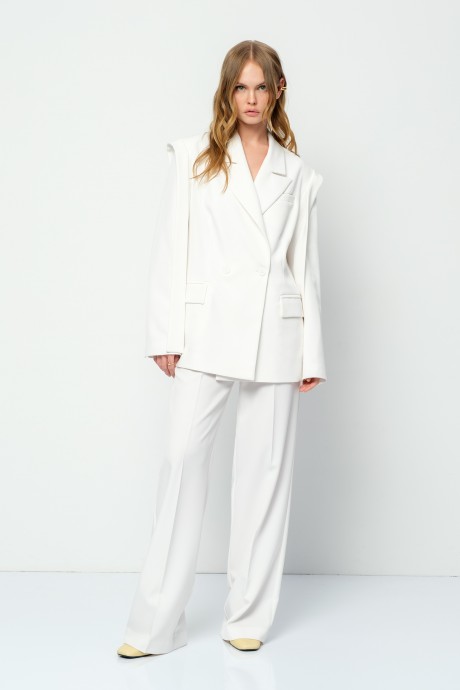 Текстильный свободный жакет с декором. Детали: жакет свободного покроя и полуприлегающего силуэта, двубортная застежка на петли и пуговицы, отрезные бочки, пиджачный воротник, функциональные карманы, съемный пояс. Жакет на подкладке.