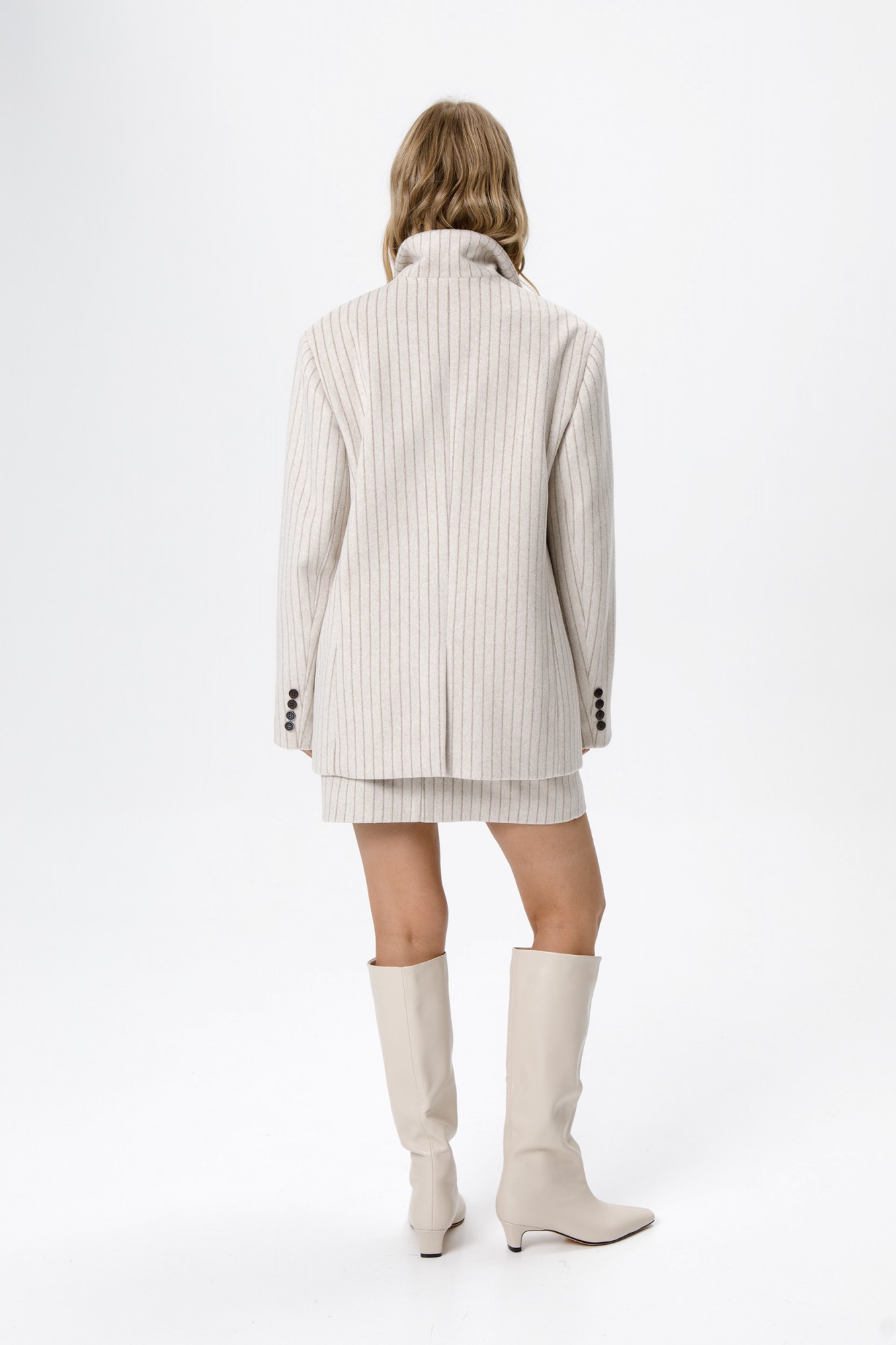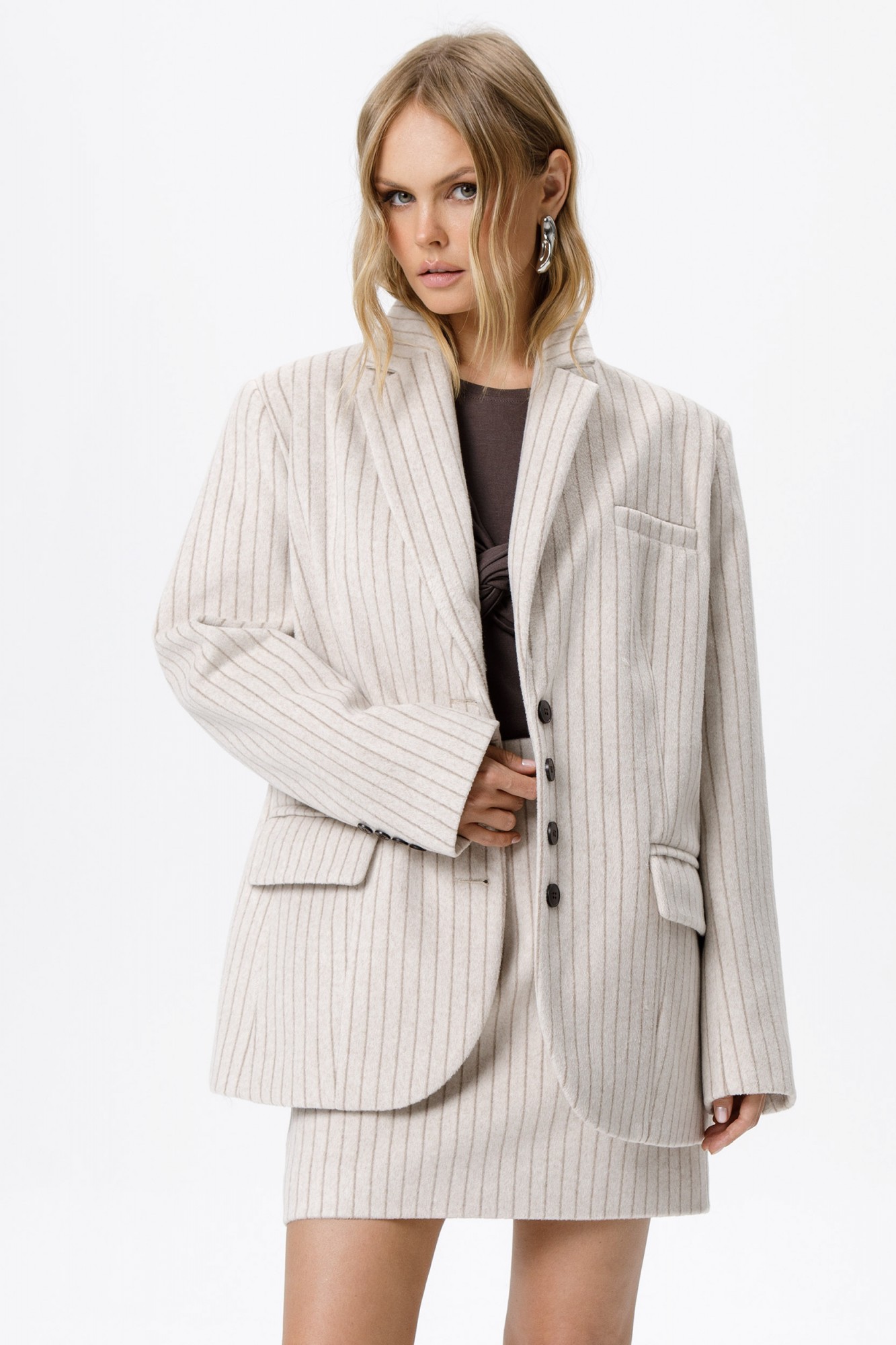 Оверсайз жакет в полоску. Детали: прямой силуэт, расширенная линия плеч, пиджачный воротник, перед с функциональными карманами, однобортная застежка на петли и пуговицы, спинка со средним швом и шлицей, рукава втачные двухшовные, жакет на подкладке.